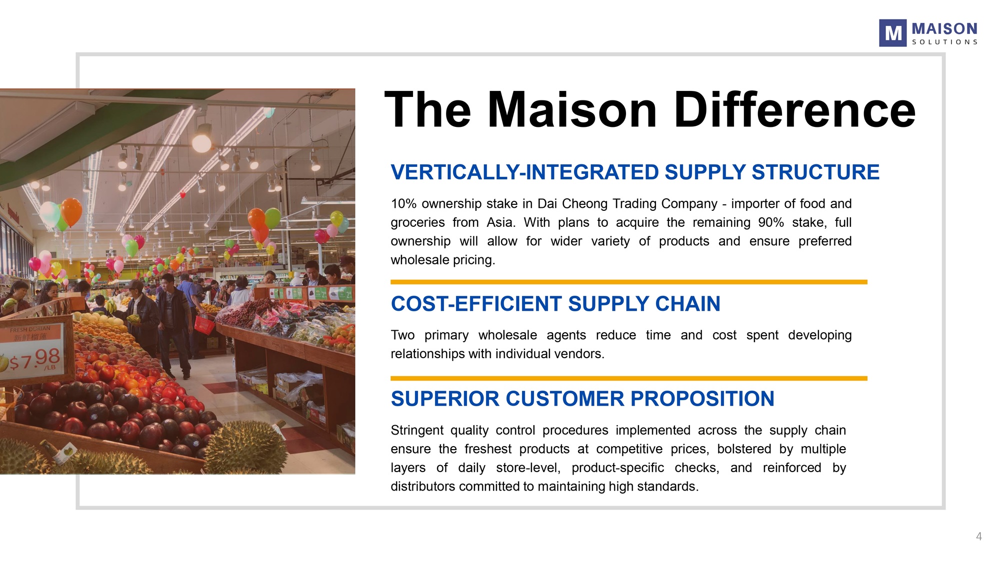 The Maison Difference VERTICALLY - INTEGRATED SUPPLY STRUCTURE 10 % ownership stake in Dai Cheong Trading Company - importer of food and groceries from Asia . With plans to acquire the remaining 90 % stake, full ownership will allow for wider variety of products and ensure preferred wholesale pricing . COST - EFFICIENT SUPPLY CHAIN Two primary wholesale agents reduce time and cost spent developing relationships with individual vendors . SUPERIOR CUSTOMER PROPOSITION Stringent quality control procedures implemented across the supply chain ensure the freshest products at competitive prices, bolstered by multiple layers of daily store - level, product - specific checks, and reinforced by distributors committed to maintaining high standards . 4
