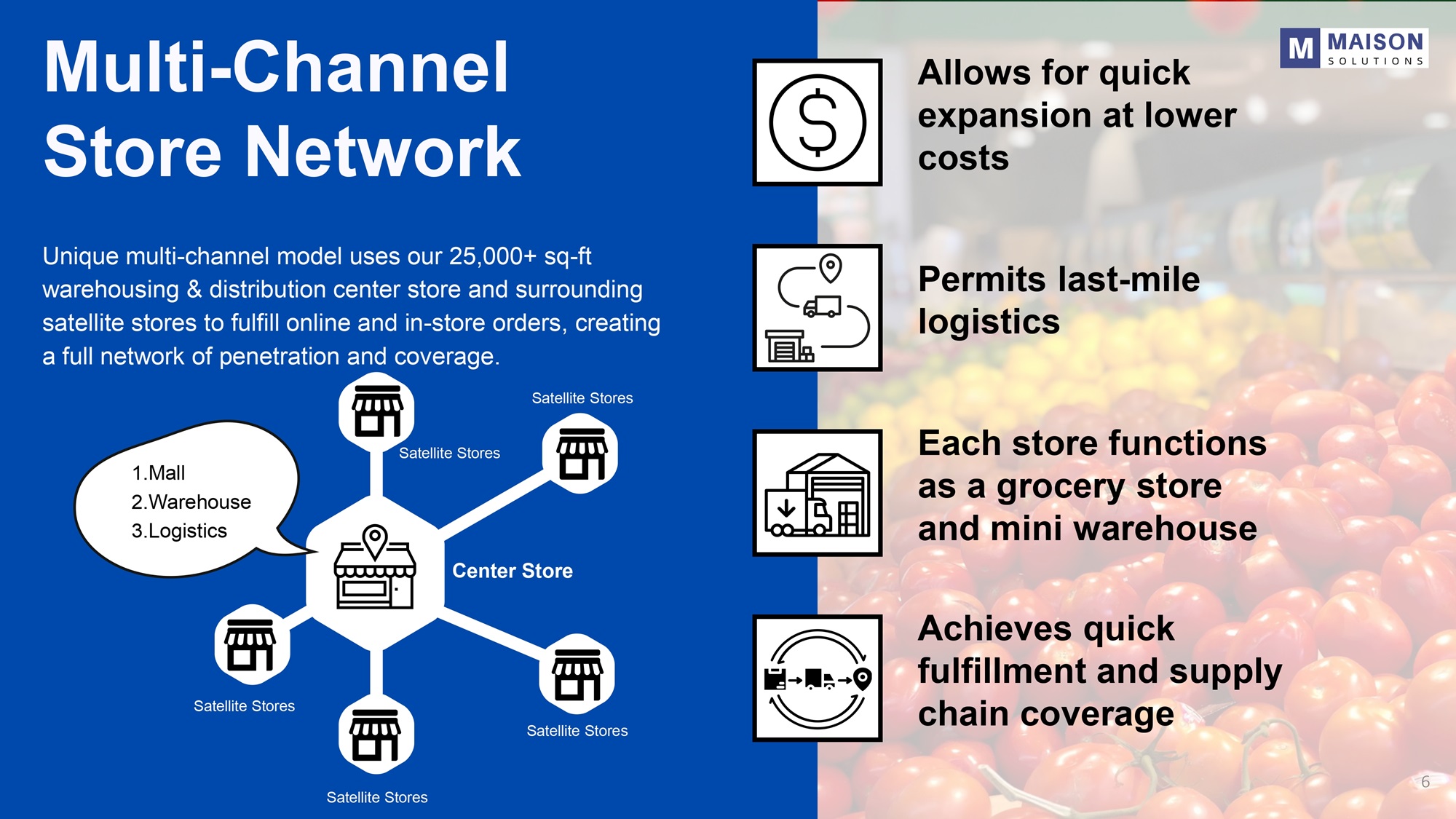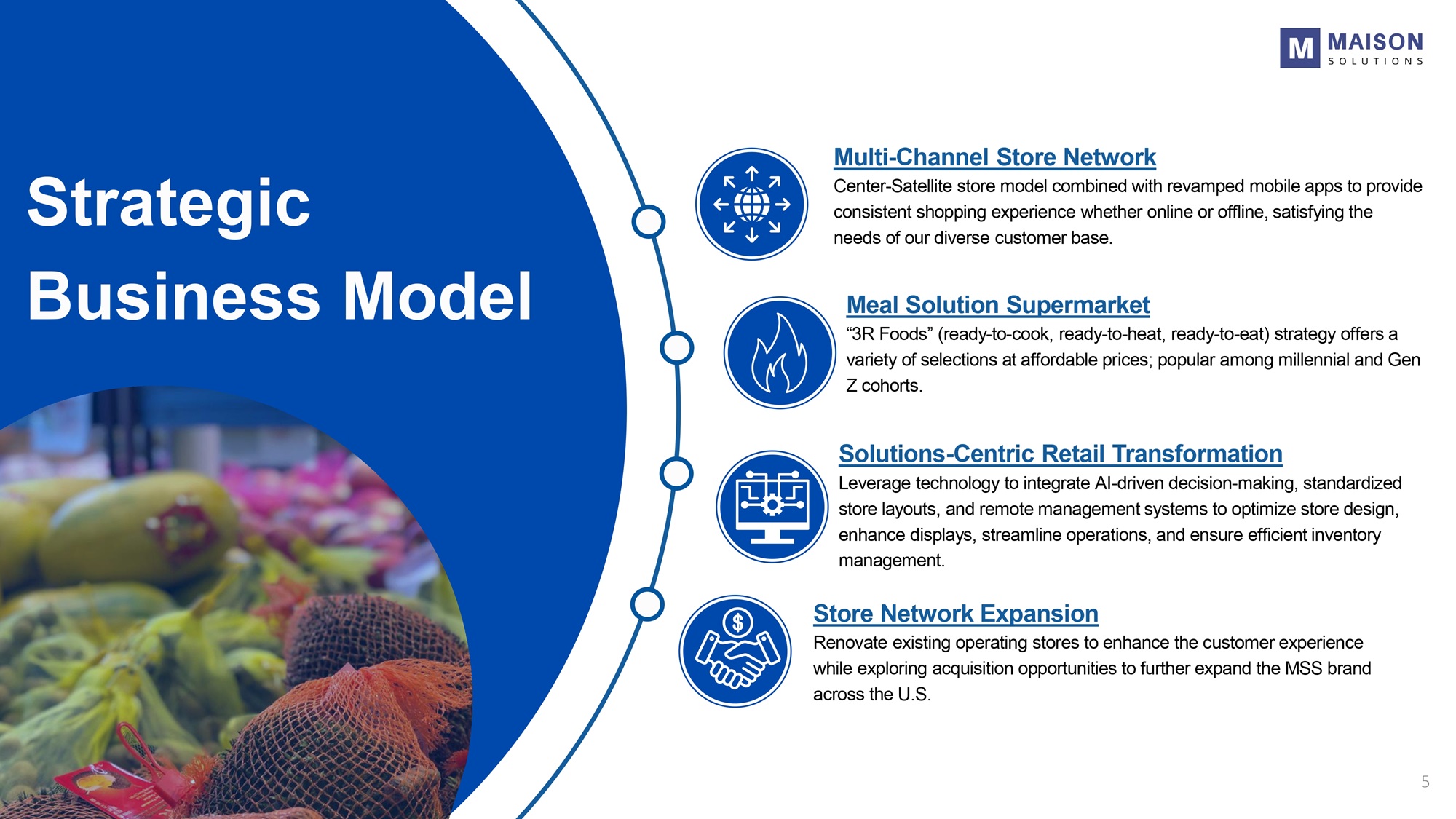 Strategic Business Model Center - Satellite store model combined with revamped mobile apps to provide consistent shopping experience whether online or offline, satisfying the needs of our diverse customer base. Multi - Channel Store Network “3R Foods” (ready - to - cook, ready - to - heat, ready - to - eat) strategy offers a variety of selections at affordable prices; popular among millennial and Gen Z cohorts. Meal Solution Supermarket Leverage technology to integrate AI - driven decision - making, standardized store layouts, and remote management systems to optimize store design, enhance displays, streamline operations, and ensure efficient inventory management. Solutions - Centric Retail Transformation Renovate existing operating stores to enhance the customer experience while exploring acquisition opportunities to further expand the MSS brand across the U.S. Store Network Expansion 5