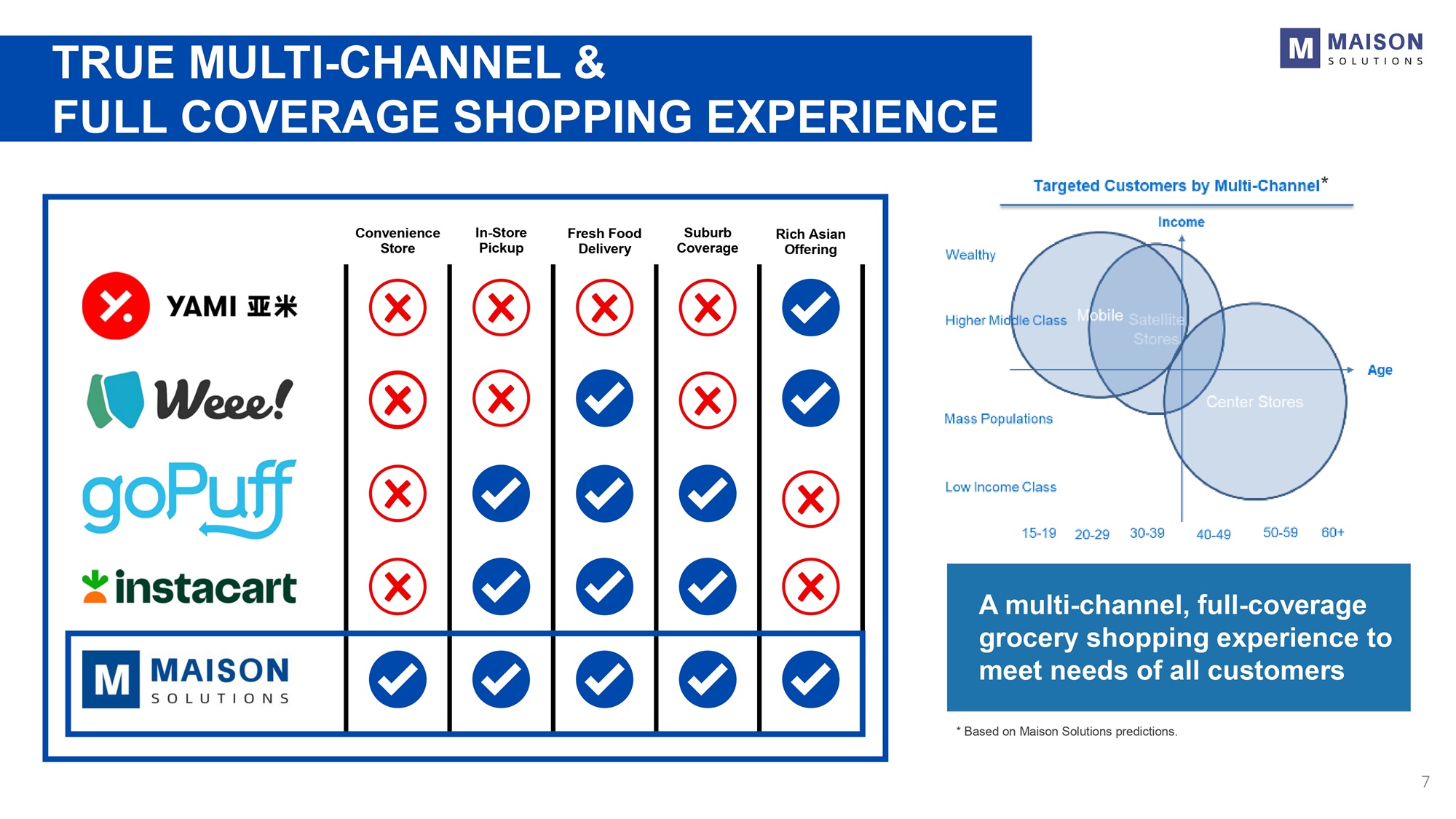 TRUE MULTI - CHANNEL & FULL COVERAGE SHOPPING EXPERIENCE A multi - channel, full - coverage grocery shopping experience to meet needs of all customers * Based on Maison Solutions predictions. * 7 Convenience Store In - Store Pickup Fresh Food Delivery Suburb Coverage Rich Asian Offering