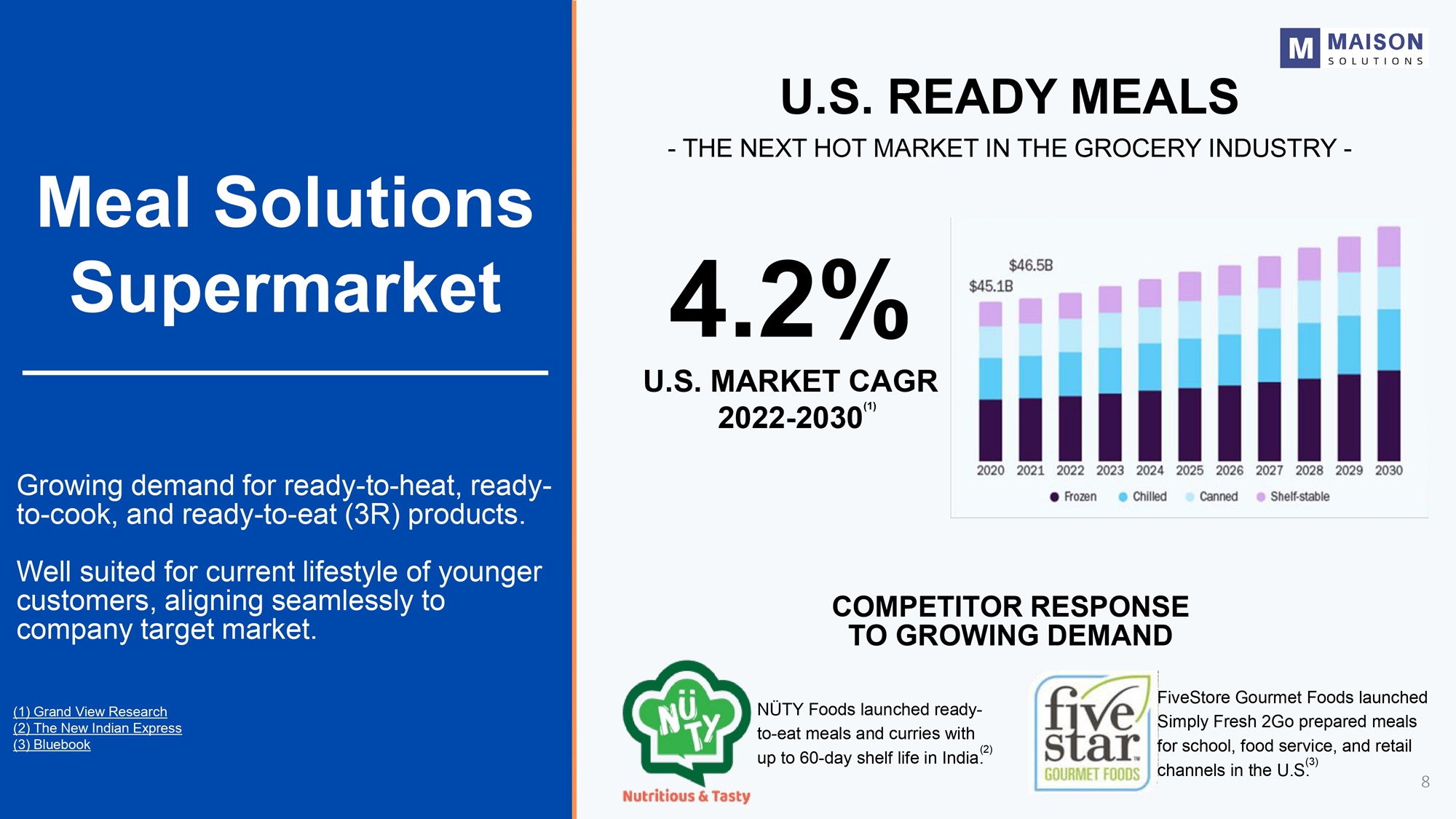 Meal Solutions Supermarket 4.2% U.S. MARKET CAGR 2022 - 2030 Growing demand for ready - to - heat, ready - to - cook, and ready - to - eat (3R) products. Well suited for current lifestyle of younger customers, aligning seamlessly to company target market. - THE NEXT HOT MARKET IN THE GROCERY INDUSTRY - U.S. READY MEALS COMPETITOR RESPONSE TO GROWING DEMAND NÜTY Foods launched ready - to - eat meals and curries with up to 60 - day shelf life in India. FiveStore Gourmet Foods launched Simply Fresh 2Go prepared meals for school, food service, and retail channels in the U.S. (1) Grand View Research (2) The New Indian Express (3) Bluebook 8 (1) (2) (3)