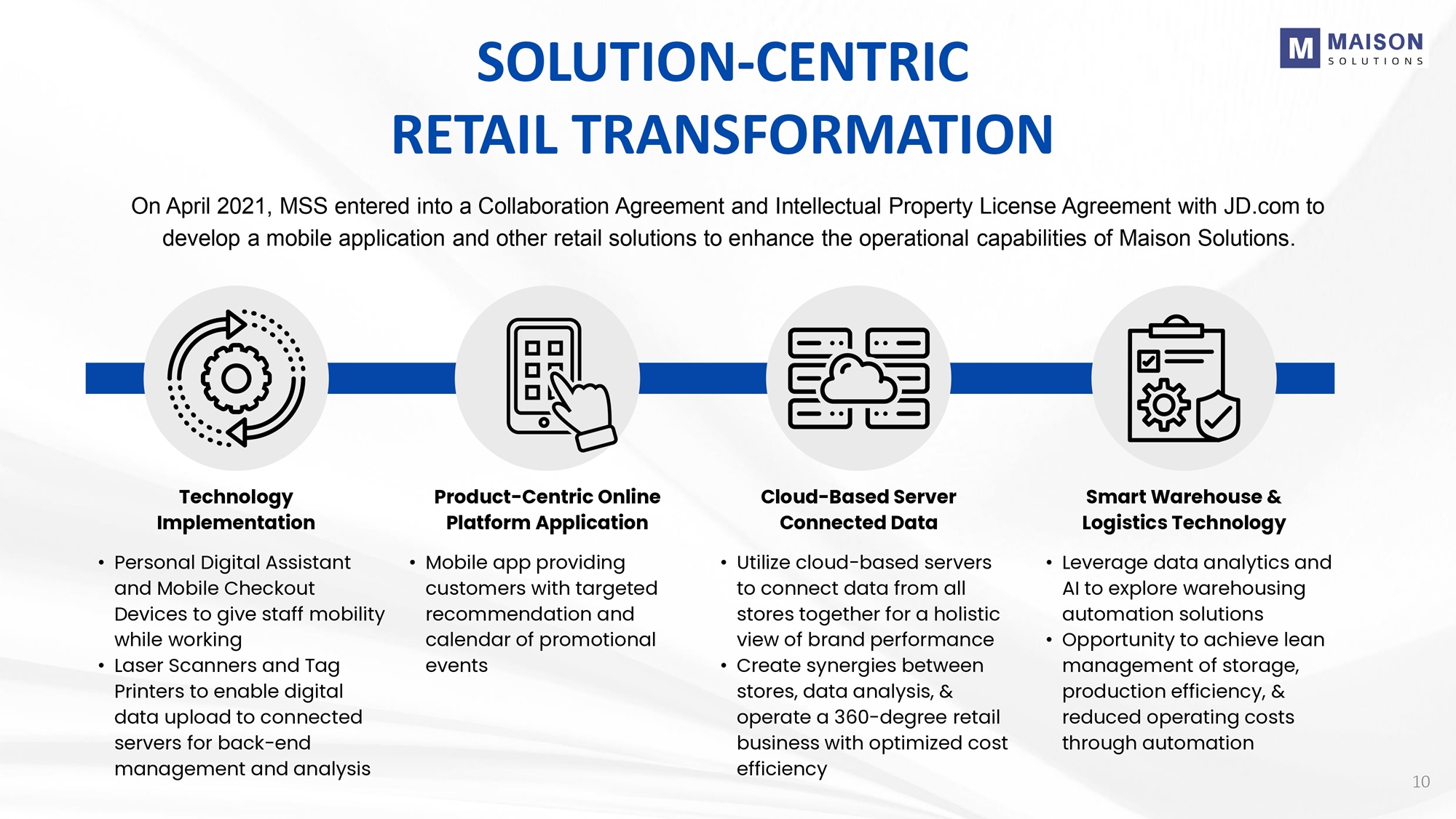 SOLUTION - CENTRIC RETAIL TRANSFORMATION • Personal Digital Assistant and Mobile Checkout Devices to give staff mobility while working • Laser Scanners and Tag Printers to enable digital data upload to connected servers for back - end management and analysis Technology Implementation Product - Centric Online Platform Application Cloud - Based Server Connected Data Smart Warehouse & Logistics Technology On April 2021, MSS entered into a Collaboration Agreement and Intellectual Property License Agreement with JD.com to develop a mobile application and other retail solutions to enhance the operational capabilities of Maison Solutions. • Mobile app providing customers with targeted recommendation and calendar of promotional events • Utilize cloud - based servers connect data from all stores together for a holistic view of brand performance • Create synergies between data analysis, & operate a degree retail business with optimized cost efficiency • Leverage data analytics and AI to explore warehousing automation solutions • Opportunity to achieve lean management of storage, production efficiency, & reduced operating costs through automation 10