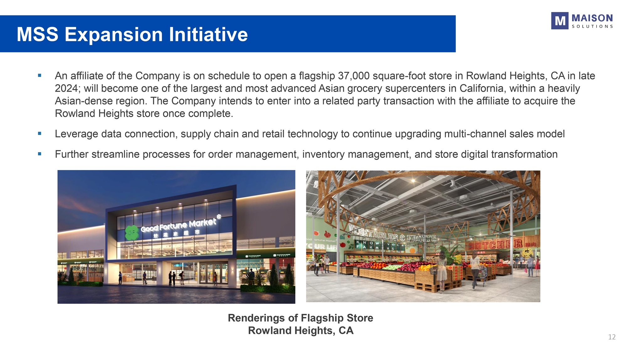 STORE NETWORK EXPANSION & REVAMP INITIATIVE Organic Strategy Continuing to innovate and renovate existing stores and warehouses; implementing retail technology solutions to enhance the customer experience. Acquiring stores that seamlessly align with the Maison Solutions’ mission and vision to synergistically expand footprint across the United States. Organic Strategy Inorganic Strategy Opening new center and satellite stores to continue broadening our reach across Southern California. MSS Expansion Store Renovation Synergistic Acquisition 11