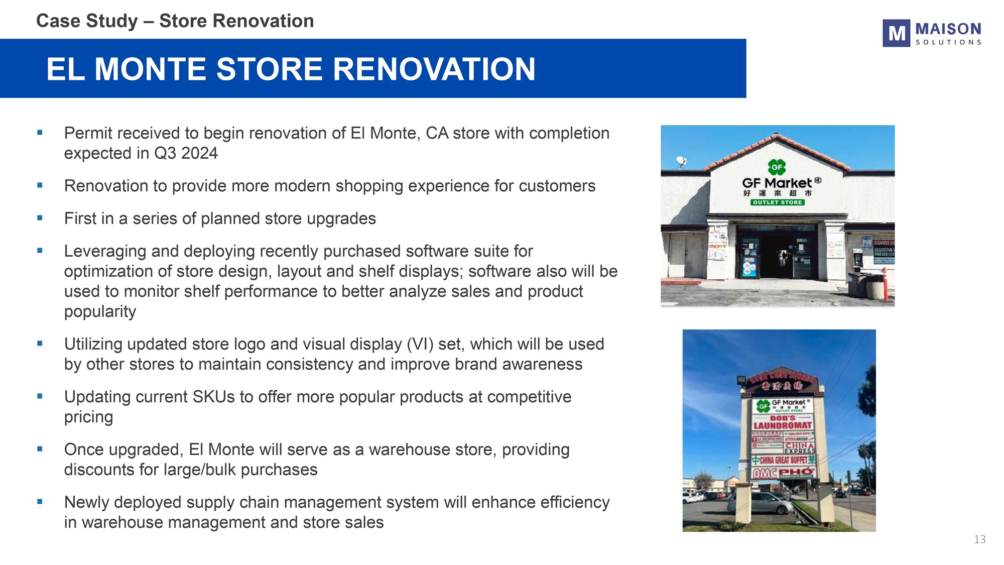MSS Expansion Initiative ▪ An affiliate of the Company is on schedule to open a flagship 37,000 square - foot store in Rowland Heights, CA in late 2024; will become one of the largest and most advanced Asian grocery supercenters in California, within a heavily Asian - dense region. The Company intends to enter into a related party transaction with the affiliate to acquire the Rowland Heights store once complete. ▪ Leverage data connection, supply chain and retail technology to continue upgrading multi - channel sales model ▪ Further streamline processes for order management, inventory management, and store digital transformation Renderings of Flagship Store Rowland Heights, CA 12