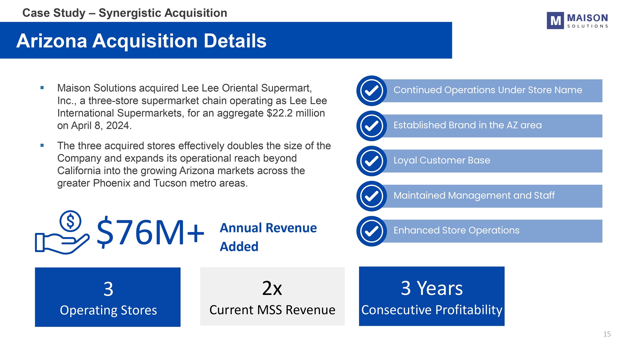 ▪ Maison Solutions acquired Lee Lee Oriental Supermart , Inc., a three - store supermarket chain operating as Lee Lee International Supermarkets, for an aggregate $22.2 million on April 8, 2024. ▪ The three acquired stores effectively doubles the size of the Company and expands its operational reach beyond California into the growing Arizona markets across the greater Phoenix and Tucson metro areas. Arizona Acquisition Details Continued Operations Under Store Name Established Brand in the AZ area Loyal Customer Base Maintained Management and Staff Enhanced Store Operations $76M+ Annual Revenue Added 3 2x Operating Stores Current MSS Revenue 3 Years Consecutive Profitability Case Study – Synergistic Acquisition 15