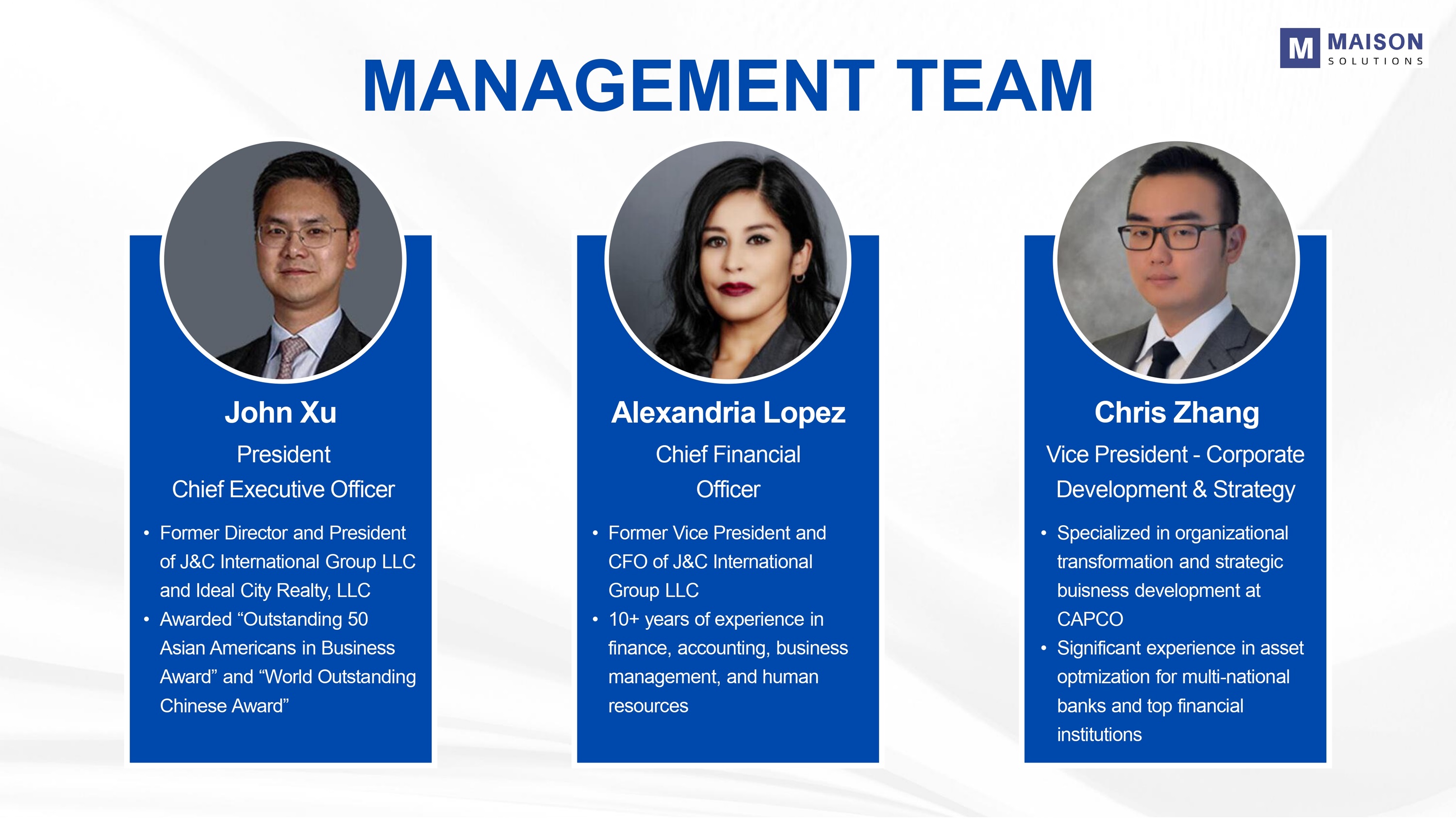 MANAGEMENT TEAM John Xu President Chief Executive Officer Alexandria Lopez Chief Financial Officer Chris Zhang Vice President - Corporate Development & Strategy • Former Director and President of J&C International Group LLC and Ideal City Realty, LLC • Awarded “Outstanding 50 Asian Americans in Business Award” and “World Outstanding Chinese Award” • Former Vice President and CFO of J&C International Group LLC • 10+ years of experience in finance, accounting, business management, and human resources • Specialized in organizational transformation and strategic buisness development at CAPCO • Significant experience in asset optmization for multi - national banks and top financial institutions