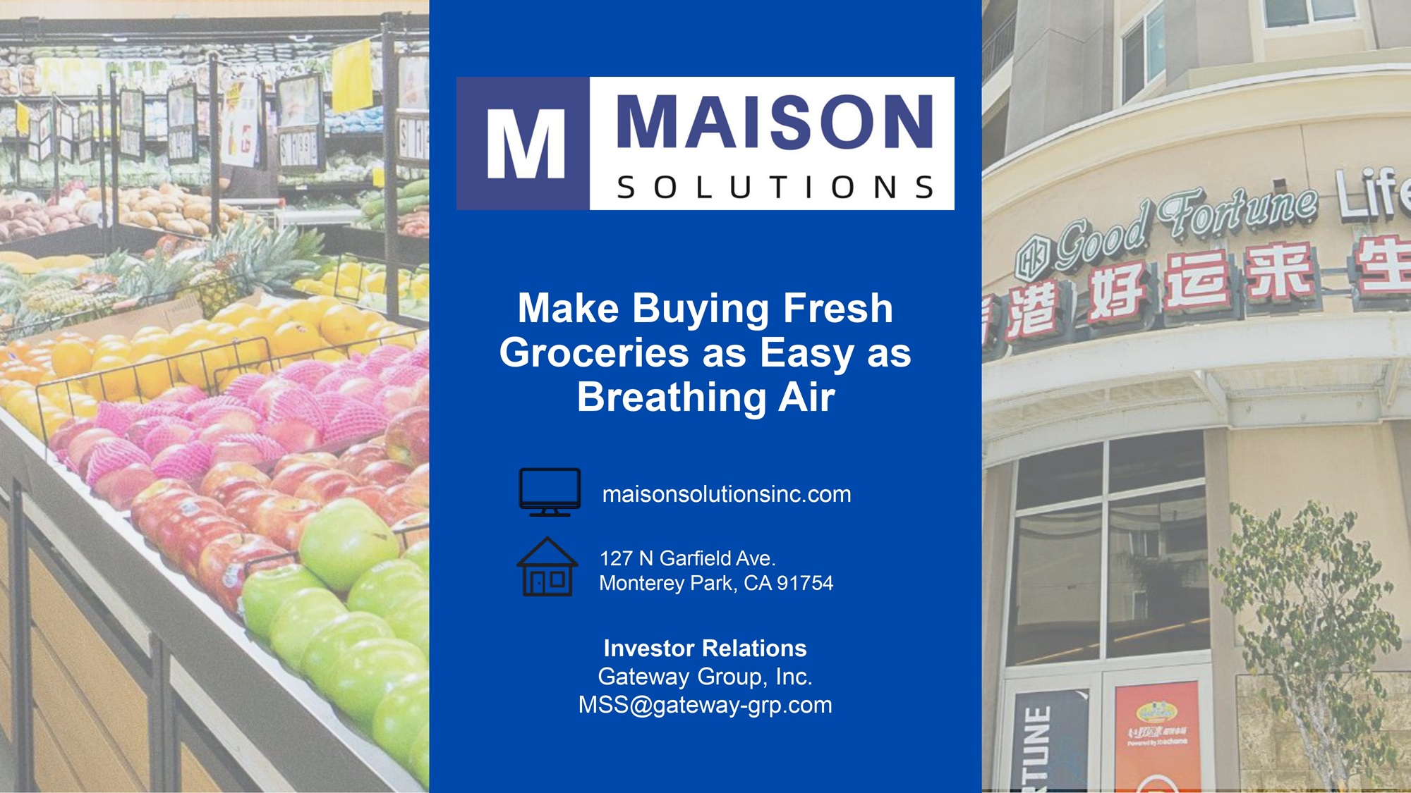 Make Buying Fresh Groceries as Easy as Breathing Air maisonsolutionsinc.com Investor Relations Gateway Group, Inc. MSS@gateway - grp.com 127 N Garfield Ave. Monterey Park, CA 91754