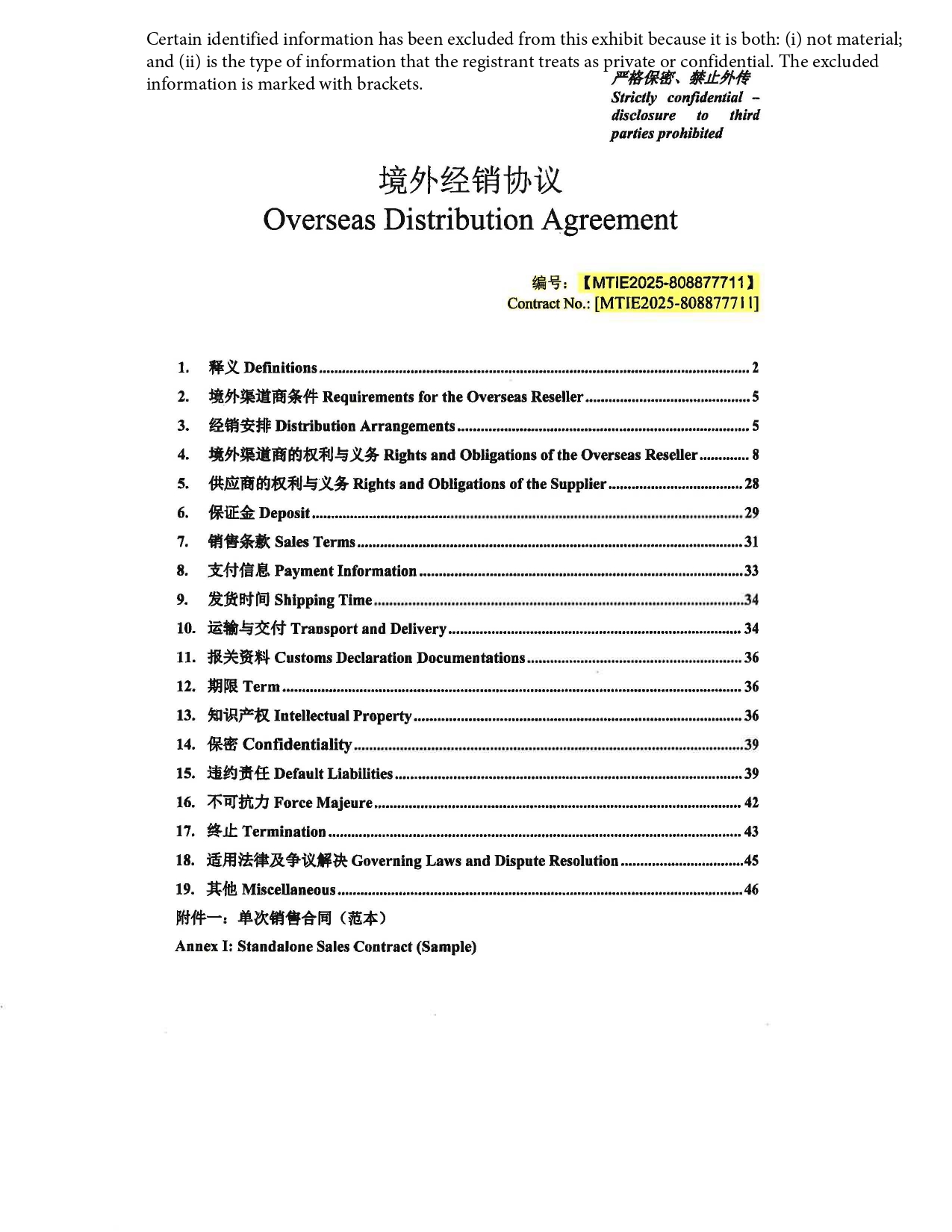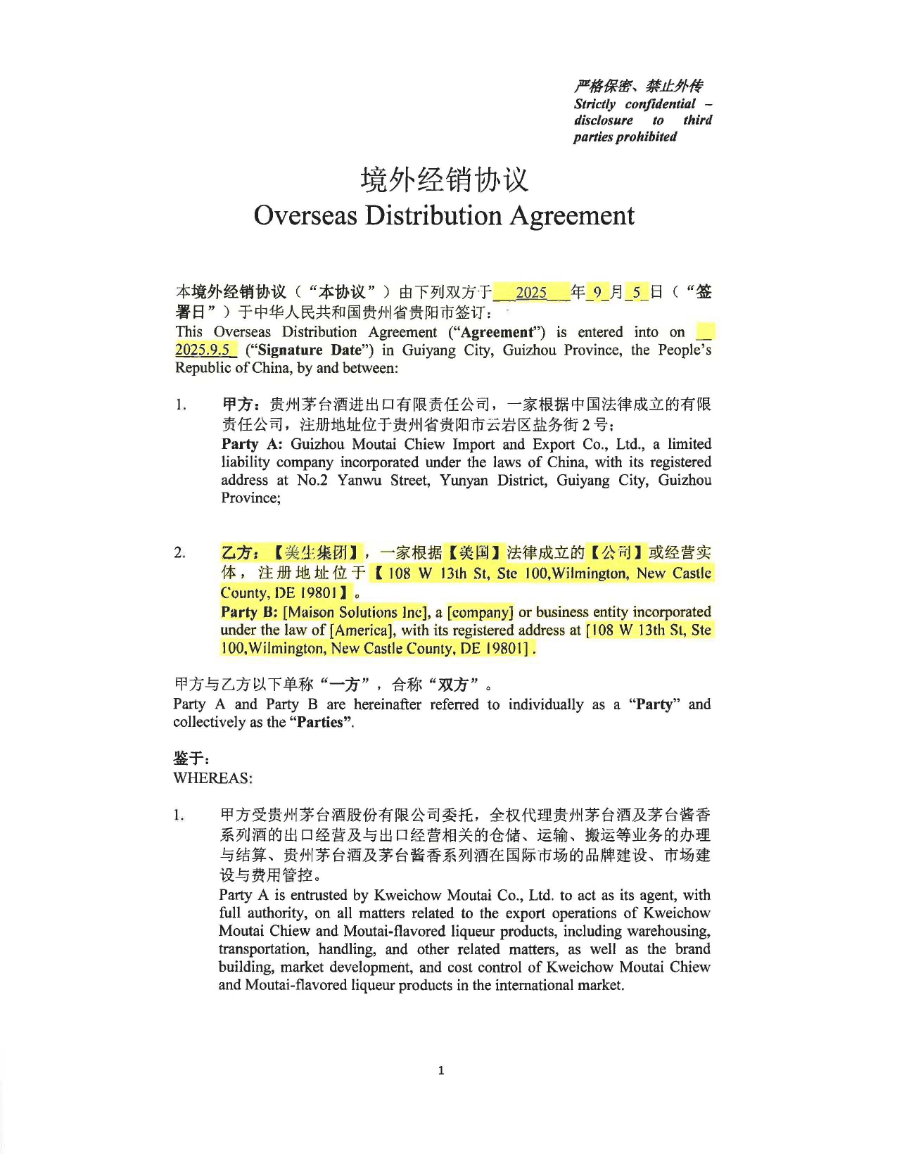 Strictly confidential - disclos u re to third parties prohibited Overseas Distribution Agreement Ax s „ r»aBi ' , x ( “&Bix” „ ) , . a . g r›: x . trr zo2s S — r — £ — 5 — fl ‹ “x This Overseas Distribution Agreement (“Agreement”) is entered into on 2025.9.5 (“Signature Date”) in Guiyang City, Guizhou Province, the People's Republic of China, by and between: Party A : Guizhou Moutai Chiew Import and Export Co . , Ltd . , a limited liability company incorporated under the laws of China, with its registered address at No . 2 Yanwu Street, Yunyan District, Guiyang City, Guizhou Province ; 2 LW I /3›NñJ — YBR IN UJ I fikNfi I * I I I* & W lJ (fi T 1 108 W I 3 th St, Ste l 00 ,Wilmington, New Castle County, UE 19501 I Party B : [Maison SoJutit›ns Inc] , a [company] or business entity incorporated under the law of [America], with its registered address at [ 108 W l 3 tli St, Ste 100 ,Wilmington, New Castle County, DE I ' 7 S 0 l ] . Y — 6 +X TTi “ W” iJ “BW” . Party A and Party B are hereinafter referred to individually as a “Party” and collectively as the “Parties”. WHEREAS: Party A is entrusted by Kweichow Moutai Co . , Ltd . to act as its agent, with full authority, on all matters related to the export operations of Kweichow Moutai Chiew and Moutai - flavored liqueur products, including warehousing, transportation, handling, and other related matters, as well as the brand building, market development, and cost control of Kweichow Moutai Chiew and Moutai - flavored liqueur products in the international market . 1