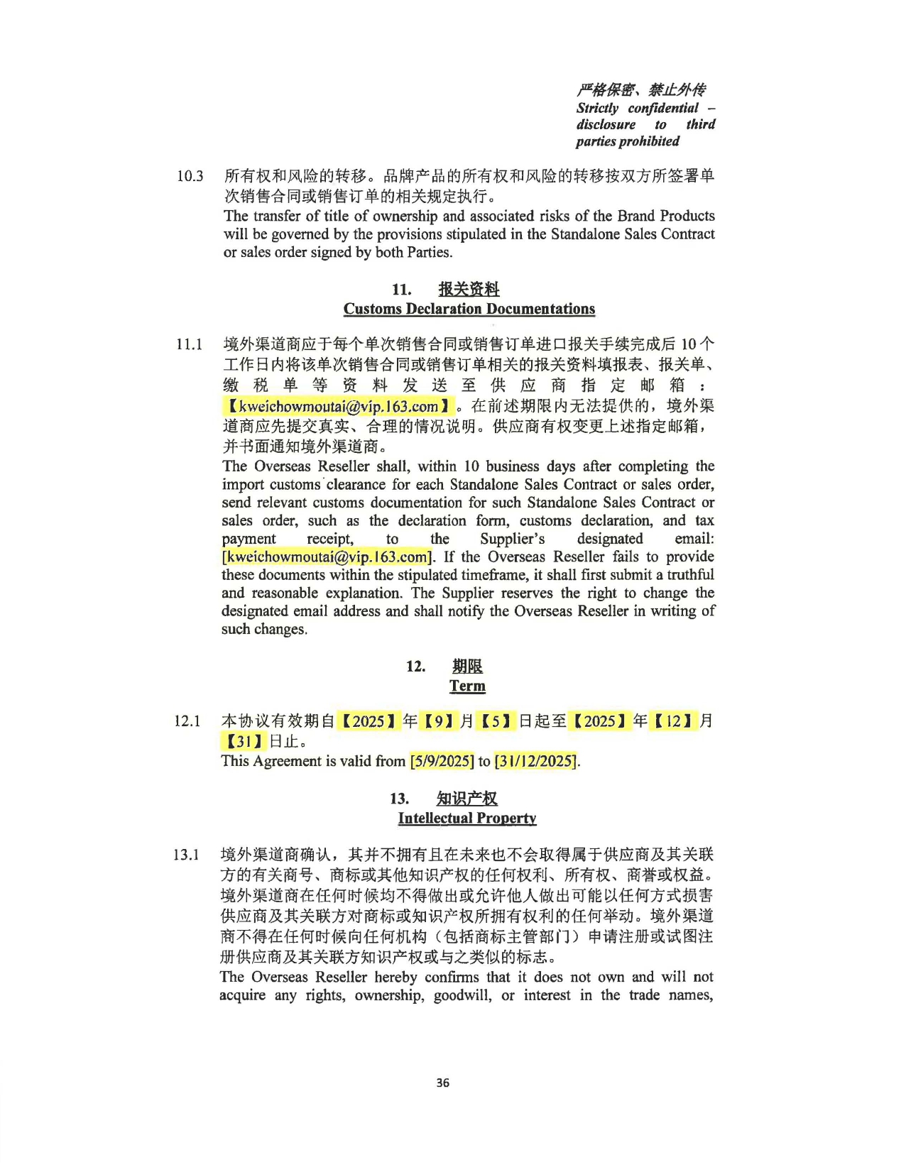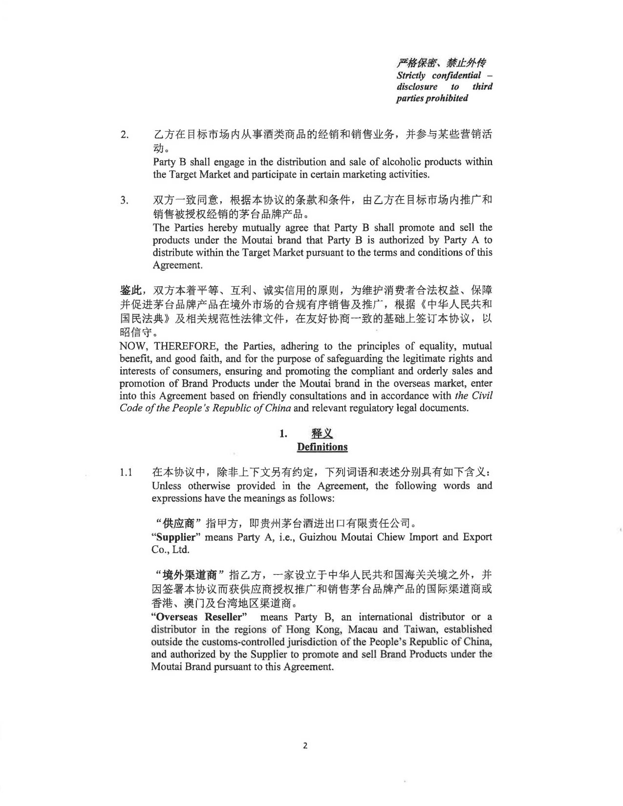 Strictly confidential - disclosure to third parties prohibited Party B shall engage in the distribution and sale of alcoholic products within the Target Market and participate in certain marketing activities. 3. «is — s , nn&si'x&x.»zln ‹I, Hz:nTz flsHsHRrln tée&RB aIi»a ƒ NP ƒ . The Parties hereby mutually agree that Party B shall promote and sell the products under the Moutai brand that Party B is authorized by Party A to distribute within the Target Market pursuant to the terms and conditions of this Agreement . &&rza) H1éN›z"fi‹1a»A‹t, KnIrtt& — nssiBA+1rBHi’X. &G• NOW, THEREFORE, the Parties, adhering to the principles of equality, mutual benefit, and good faith, and for the purpose of safeguarding the legitimate rights and interests of consumers, ensuring and promoting the compliant and orderly sales and promotion of Brand Products under the Moutsi brand in the overseas market, enter into this Agreement based on friendly consultations and in accordance with the Civil Code of the People ’s Republic of China and relevant regulatory legal documents . i. Definitions 1.1 Unless otherwise provided in the Agreement, the following words and expressions have the meanings as follows: “Supplier” means Party A, i.e., Guizhou Moutai Chiew Import and Export Co., Ltd. “Overseas Reseller” means Party B, an international distributor or a distributor in the regions of Hong Kong, Macau and Taiwan, established outside the customs - controlled jurisdiction of the People's Republic of China, and authorized by the Supplier to promote and sell Brand Products under the Moutai Brand pursuant to this Agreement .