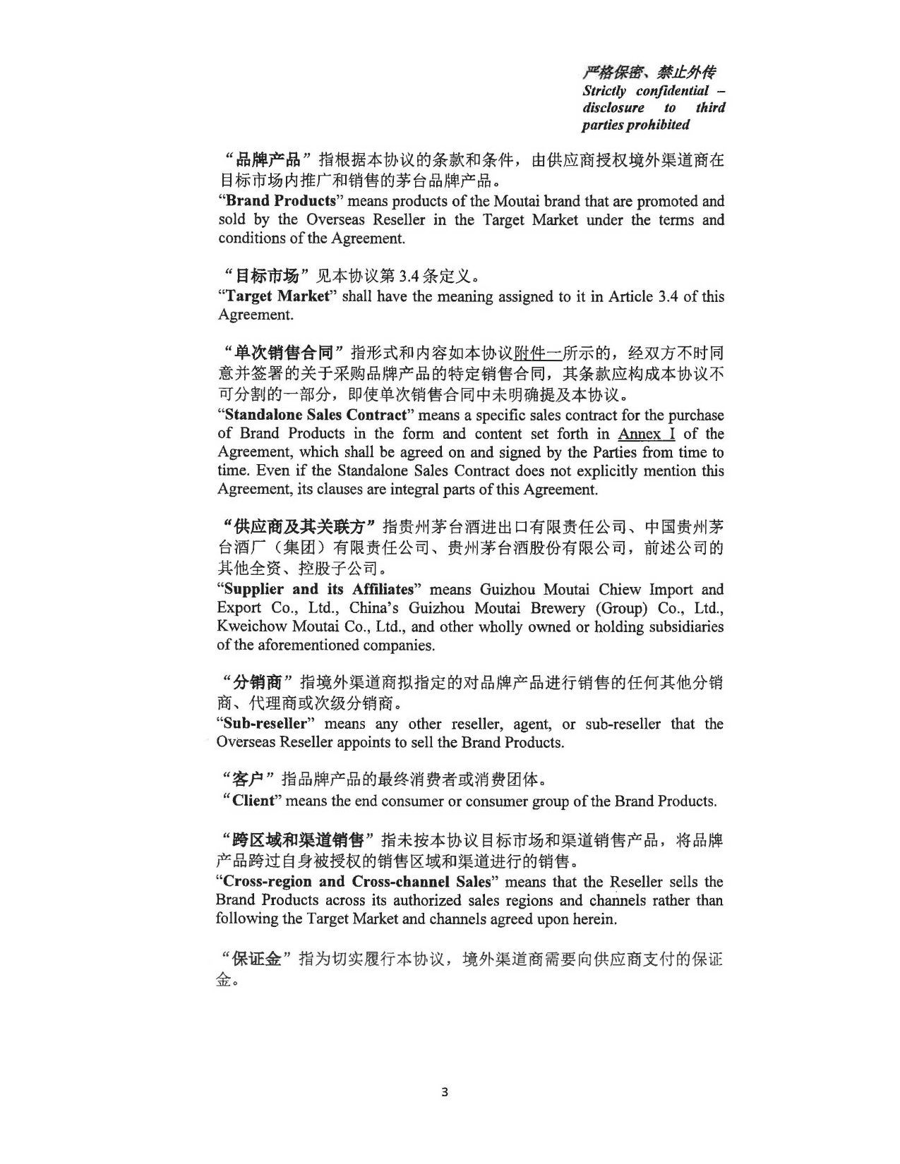 Strictly co n fidential — Jiscfos ii re to third parties prohibited 3 “ P RP›R ” RB4Hi’ I? 1oñ11 6 % ttRWét ilR fi $t.»triSA&/›otas»9a»i›r•» ƒ ». “Brand Products” means products of the Moutai brand that are promoted and sold by the Overseas Reseller in the Target Market under the terms and conditions of the Agreement . “Target Market” shall have the meaning assigned to it in Article 3 . 4 of this Agreement . “Standalone Sales Contract” means a specific sales contract for the purchase of Brand Products in the form and content set forth in Annex I of the Agreement, which shall be agreed on and signed by the Parties from time to time . Even if the Standalone Sales Contract does not explicitly mention this Agreement, its clauses are integral parts of this Agreement . ‹i » w , 2 g — „, >.. “Supplier and its Affiliates” means Guizhou Moutai Chiew Import and Export Co . , Ltd . , China's Guizhou Moutai Brewery (Group) Co . , Ltd . , Kweichow Moutai Co . , Ltd . , and other wholly owned or holding subsidiaries of the aforementioned companies . “Sub - reseller” means any other reseller, agent, or sub - reseller that the Overseas Reseller appoints to sell the Brand Products. ” s•sWP ƒ • fi idnfi tés&‹1. “Client” means the end consumer or consumer group of the Brand Products. “Cross - region and Cross - channel Sales” means that the Reseller sells the Brand Products across its authorized sales regions and channels rather than following the Target Market and channels agreed upon herein . “ ” " ' ‹ n fi »