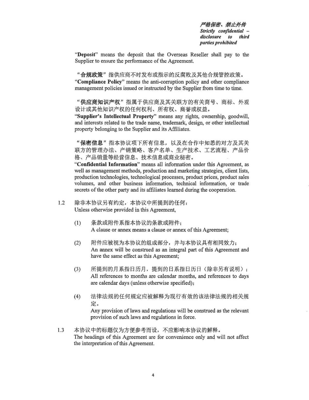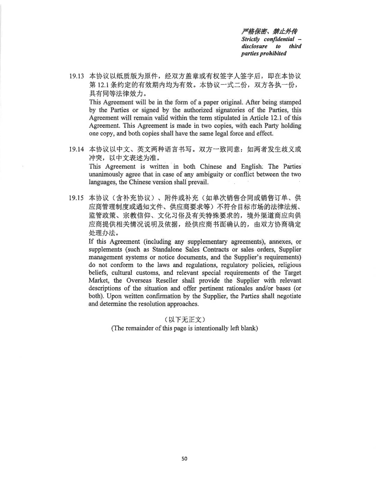 19.13 50 19.14 This Agreement is written in both Chinese and English : The Parties unanimously agree that in case of any ambiguity or conflict between the two languages, the Chinese version shall prevail . 19.15 Strictly confiJenlial - dircfnsure to third parties R • * hfbit ed n 2 . i «iH 8 i&AaH »&s . ash’ - z - , »r&t \ — «, This Agreement will be in the form of a paper original . After being stamped by the Parties or signed by the authorized signatories of the Parties, this Agreement will remain valid within the term stipulated in Artic)e 12 . 1 of this Agreement . This Agreement is made in two copies, with each Party holding one copy, and both copies shall have the same legal force and effect . &B€e6:!€éiidO:A/t• fé&b2?t4) Tt2âhtñxSbBtti9t£ñi. i& 1 B 9 - x Q . * / 9 / 9 . Akn( 1 tA 63 ?RB 21 % . , Q 4 t&IR&léUt If this Agreement (including any supplementary agreements), annexes, or supplements (such a!i Standalone Sales Contracts or sales orders, Supplier management systems or notice documents, and the Supplier's requirements) do not conform to the laws and regulations, regulatory policies, religious beliefs, cultural customs, and relevant special requirements of the Target Market, the Overseas Reseller shall provide the Supplier with relevant descriptions of the situation and offer pertinent rationales and/or bases (or both) . Upon written confirmation by the Supplier, the Parties shall negotiate and determine the resolution approaches . (The remainder of this page is intentionally left blank)