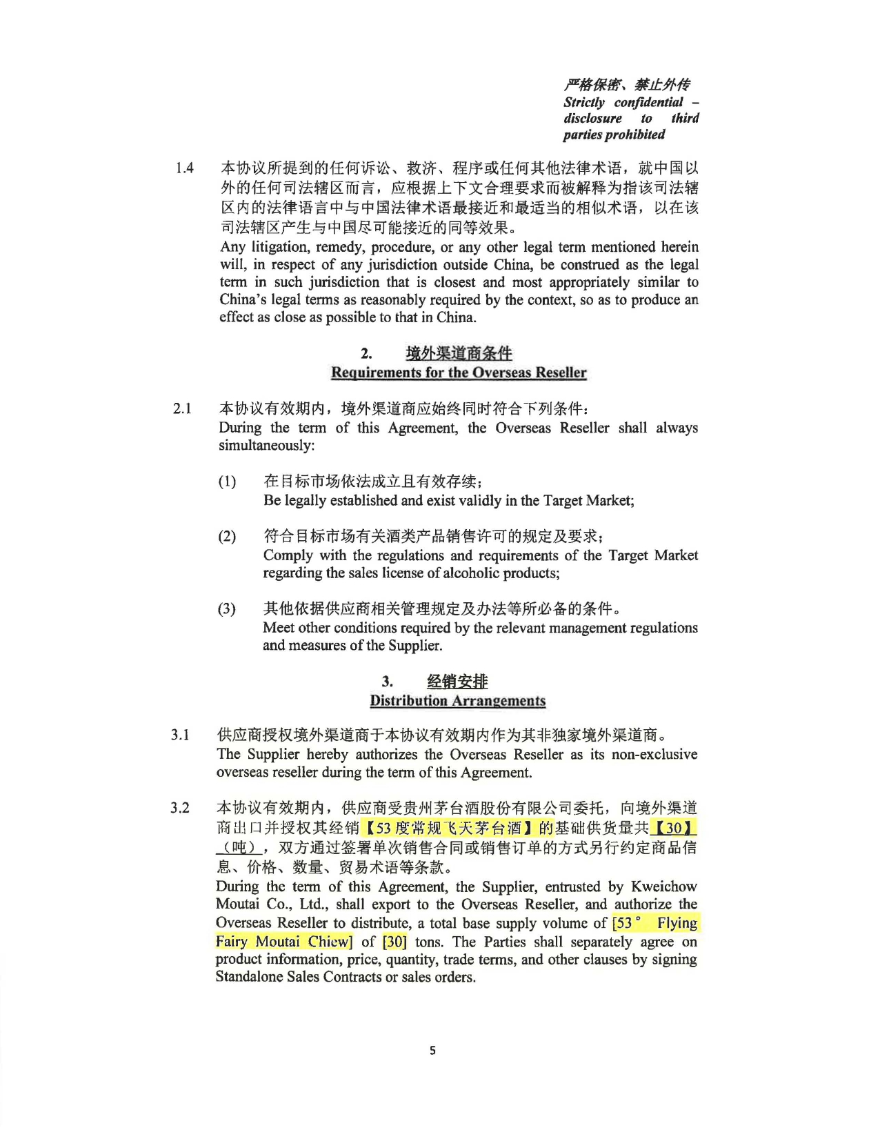 1.4 Any litigation, remedy, procedure, or any other legal term mentioned herein will, in respect of any jurisdiction outside China, be constnied as the legal term in such jurisdiction that is closest and most appropriately similar to China's legal terms as reasonably required by the context, so as to produce an effect as close as possible to that in China . 2. JJ@@@&@ Requirements for the Overseas Reseller 2.1 During the term of this Agreement, the Overseas Reseller shall always simultaneously: ‹i) «a›arr»'›zxxuwar«. Be legally established and exist validly in the Target Market; (2) Comply with the regulations and requirements of the Target Market regarding the sales license of alcoholic products; (3) Meet other conditions required by the relevant management regulations and measures of the Supplier. Distribution Arrangements 3.1 The Supplier hereby authorizes the Overseas Reseller as its non - exclusive overseas reseller during the term of this Agreement. 3.2 Strictly co n fide nt ial - disclosure to third ponies prohibited During the tertn of this Agreement, the Supplier, entrusted by Kweichow Moutai Co . , Ltd . , shall export to the Overseas Reseller, and authorize the Overseas Reseller to distribute, a total base supply volume of [ 53 Flying Fairy Moutai Chiew] of [ 30 ] tons . The Parties shall separately agree on product infomiation, price, quantity, trade terms, and other clauses by signing Standalone Sales Contracts or sales orders .