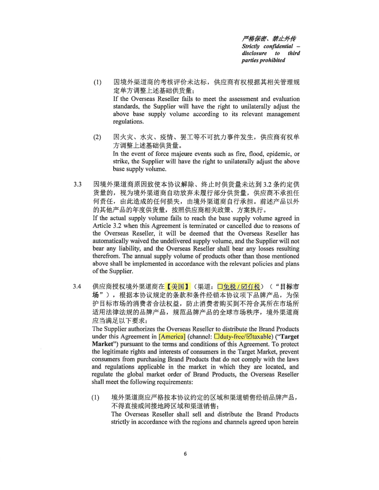 3.3 6 3.4 Strictly confiulential - disclosure to third parfiec prohibited If the Overseas Reseller fails to meet the assessment and evaluation standards, the Supplier will have the right to unilaterally adjust the above base supply volume according to its relevant management regulations . In the event of force majeure events such as fire, flood, epidemic, or strike, the Supplier will have the right to unilaterally adjust the above base supply volume . 0 xt \ 1 a % Ds& 6 t> : ' 4 R@ . L c ƒ ,x 61 /ñ 3 J y . 2 f‹Rf . ƒ . a % , t‹^??# 4 F‘ a €l?t&PI “ - • S . »a, . ‹'‹ATCP - / 1 If the actual supply*volume fails”to reach the base supply volume agreed in Article 3 . 2 when this Agreement is terminated or cancelled due to reasons of the Overseas Reseller, it will be deemed that the Overseas Reseller has automatically waived the undetivered supply volume, and the Supplier will not bear any liability, and the Overseas Reseller shall bear any losses resulting therefrom . The annual supply volume of pmducts other than those mentioned above shall be implemented in accordance with the relevant policies and plans of the Supplier . The Supplier authorixzs the Overseas Reseller to distribute the Brand Products under this Agreement in [AtneriCa] (channel : Odiity • fieefi 21 taxable) (”Target Marhet”) pursuant to the tennis and conditions of this Agreement . To protect the legitimate rights and interests of consumers in the Target Market, prevent connimers from purchasing Brand Products that do not comply with the laws and regulations applicable in the market in which they are located, and regulate the global market order of Brand Products, the Overseas Reseller shall meet the following requirements : The Overseas Reseller shall sell and distribute the Brand Products strictly in accordance with the regions and channels agreed upon herein