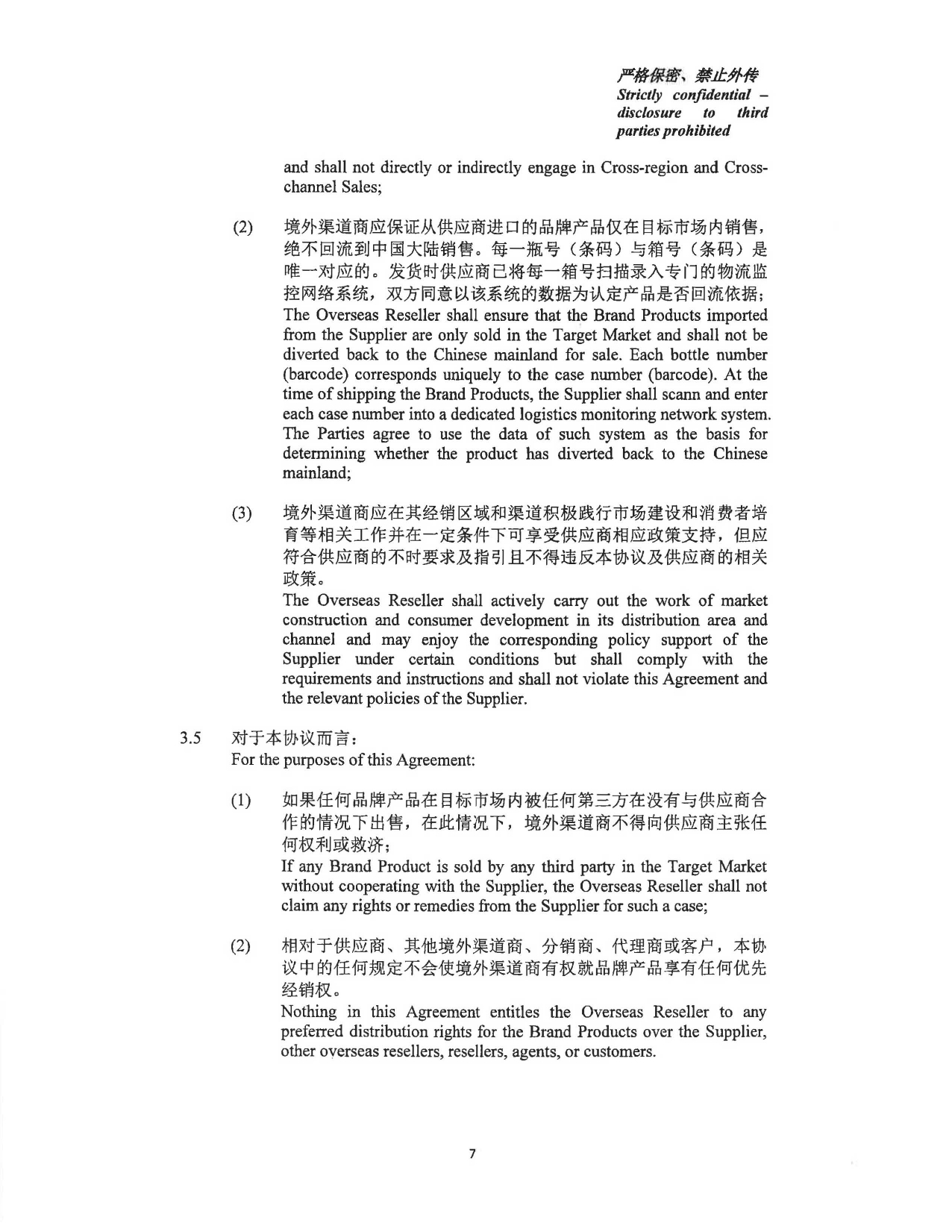 Strictly confi d ential - disctosure to third and shall not directly or indirectly engage in Cross - region and Cross - channel Sales; 7 • > z > ’ fiD I : The Overseas Reseller shall ensure that the Brand Products imported from the Supplier are only sold in the Target Market and shall not be diverted back to the Chinese mainland for sale . Each bottle number (barcode) corresponds uniquely to the case number (barcode) . At the time of shipping the Brand Products, the Supplier shall scam and enter each case number into a dedicated logistics monitoring network system . The Parties agree to use the data of such system as the basis for determining whether the product has diverted back to the Chinese mainland ; • n ' ' * ' * s * ' i ' nd • The Overseas Reseller shall actively carry out the work of market construction and consumer development in its distribution area and channel and may enjoy the corresponding policy support of the Supplier under certain conditions but shall comply with the requirements and instructions and shall not violate this Agreement and the relevant policies of the Supplier . 3.5 NJQ @iJ@ : For the purposes of this Agreement: 1%H1ffififi: If any Brand Product is sold by any third party in the Target Market without cooperating with the Supplier, the Overseas Reseller shall not claim any rights or remedies from the Supplier for such a case ; (2) a „ » + , e q :xs . xf s , s» x „ « , z , . r , e . z , . «zuzve, and Nothing in this Agreement entitles the Overseas Reseller to any preferred distribution rights for the Brand Products over the Supplier, other overseas resellers, resellers, agents, or customers .