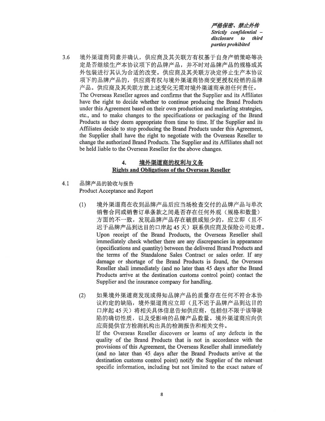 3.6 8 The Overseas Reseller agrees and confirms that the Supplier and its Affiliates have the right to decide whether to continue producing the Brand Products undcr this Agreement based on their own production and marketing strategies, etc . , and to make changes to the specifications or packaging of the Brand Products as they deem appropriate ftom time to time, If the Supplier and its Affiliates decide to stop producing the Brand Products under this Agreement, the Supplier shall have the right to negotiate with the OverseaS Reseller to change the authorized Brand Products . The Supplier and its Affiliates shall not be held liable to the Overseas Reseller for the above changes . Riehts and Obligations of the Overseas Reseller 4.1 Product Acceptance and Report Strictly confidential — disclosure to third parties prohibited r&$iU — s, a»*. ι PP ι PDaGmlrvei, âcsr ‹&U — TéWPâ»xl»fl$Jop1¡45 X) az fi&e%+ aJtx. Upon receipt of the Brand Products, the Overseas Reseller shall immediately check whether there are any discrepancies in appearance (specifications and quantity) between the delivered Brand Products and the terms of the Standalone Sales Contract or sales order . If any damage or shortage of the Brand Products is found, the Overseas Reseller shall immediately (and no later than 45 days after the Brand Products arrive at the destination customs control point) contact the Supplier and the insurance company for handling . (2) kaeih9tisâi'h:!tix^iS:‹ñu« ν •ic7•> ν t!1ihñiial+éir!tâ4Pi - •. • r .. . . • • apt 45x) e›âan‹$G.e, n &, ea‹flUI‹T He If the Overseas Reseller discovers or learns of any defects in the quality of the Brand Products that is not in accordance with the provisions of this Agreement, the Overseas ReSeller shall immediately (and no later than 45 days after the Brand Products arrive at the destination customs control point) notify the Supplier of the relevant specific information, including but not limited to the exact nature of