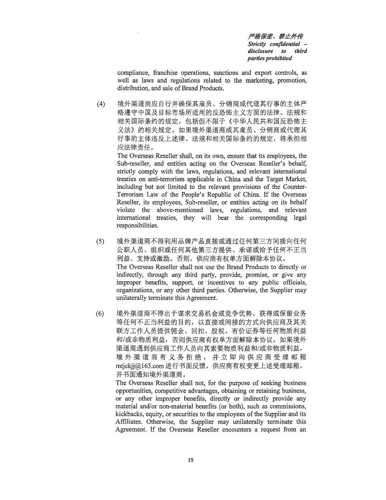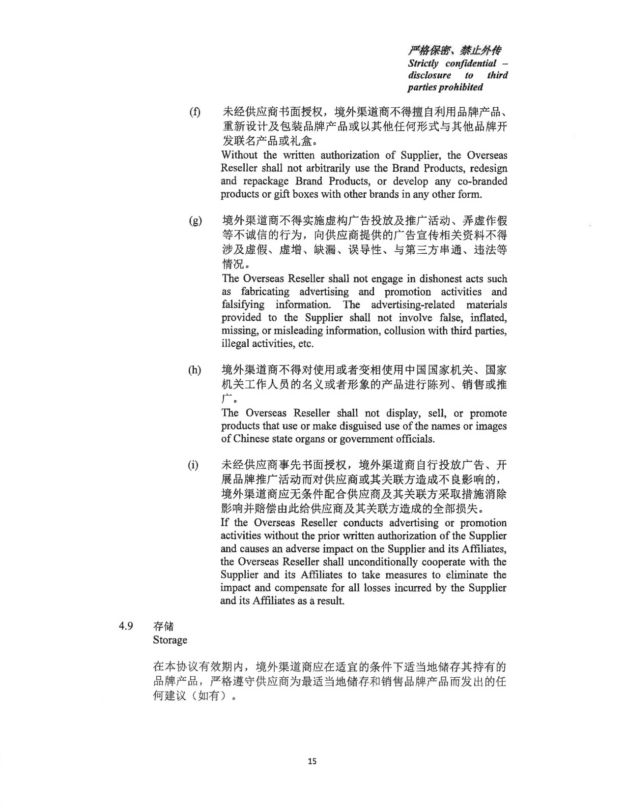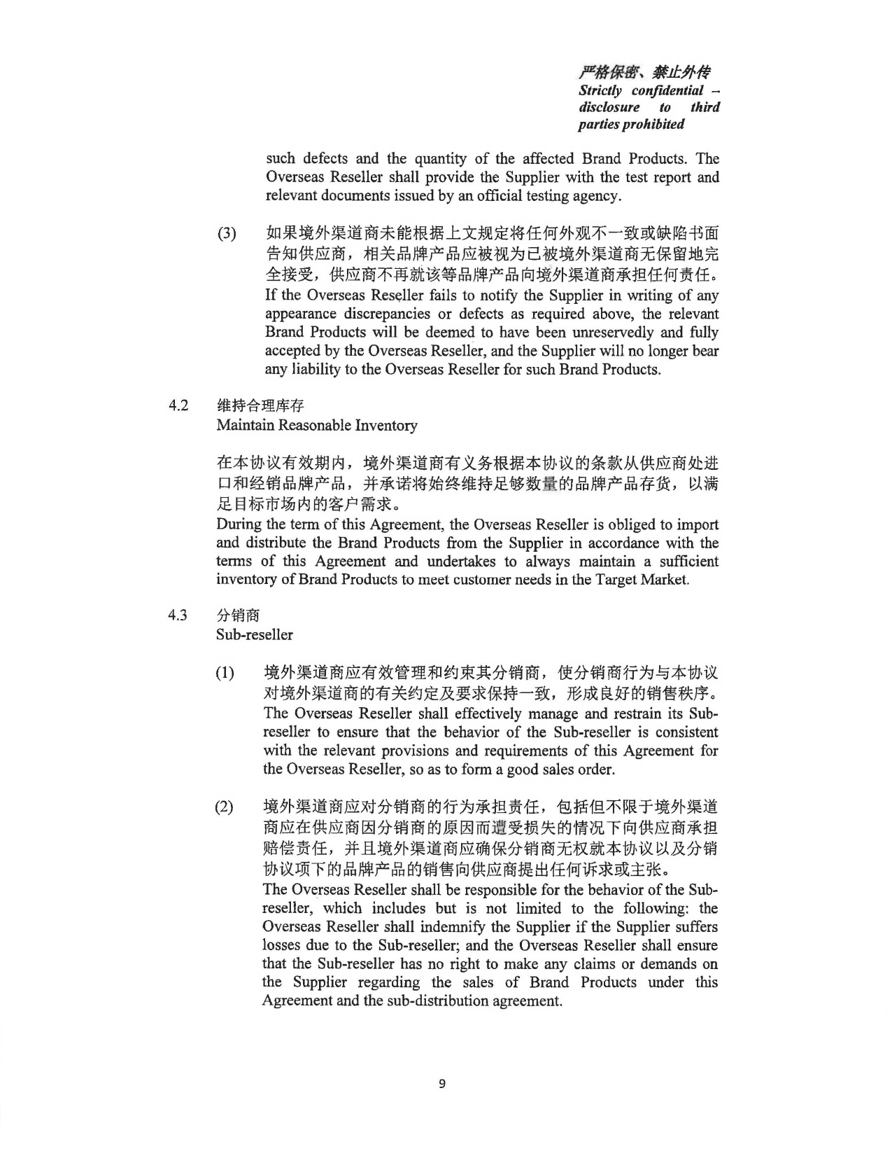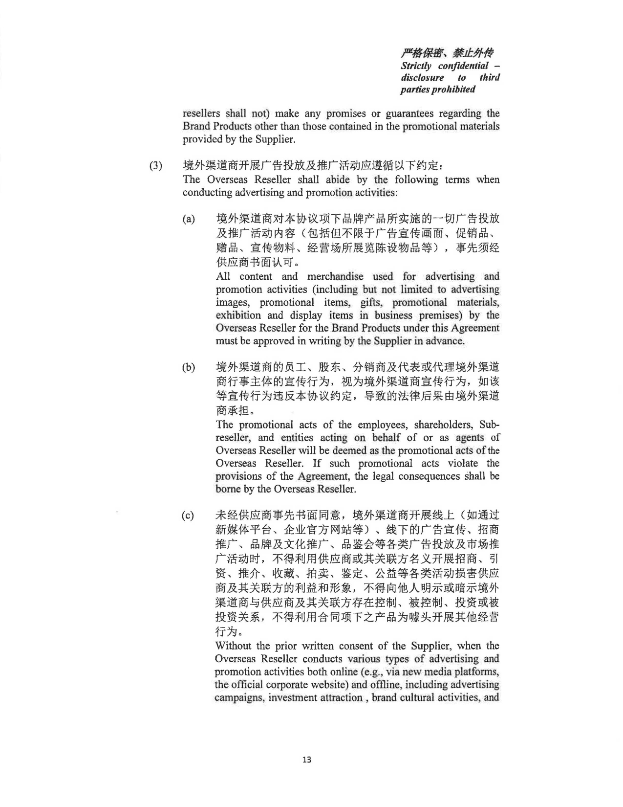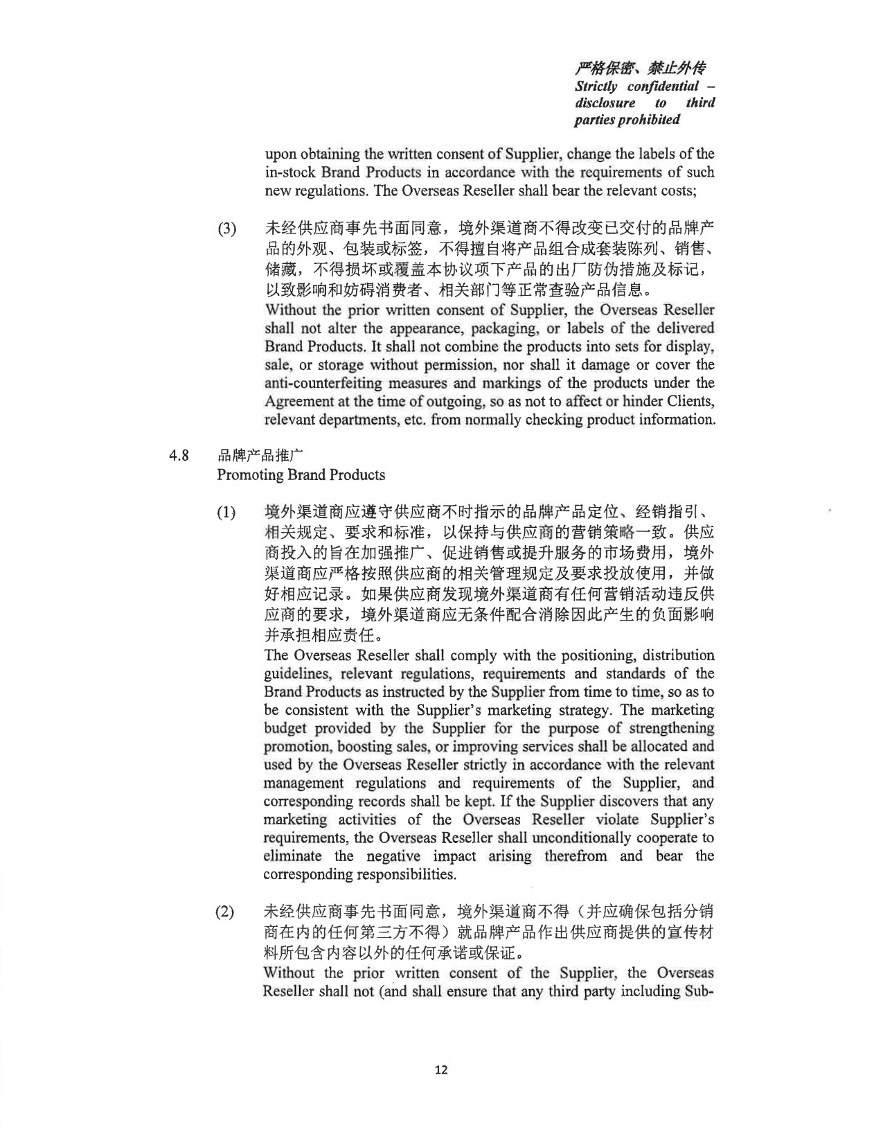 Strictly confi d ential - disclosure to third parties prohibited upon obtaining the written consent of Supplier, change the labels of the in - stock Brand Products in accordance with the requirements of such new regulations . The Overseas Reseller shall bear the relevant costs ; 12 Without the prior written consent of Supplier, the Overseas Reseller shall not alter the appearance, packaging, or labels of the delivered Brand Products . It shall not combine the products into sets for display, sale, or storage without permission, nor shall it damage or cover the anti - counterfeiting measures and markings of the products under the Agreement at the time of outgoing, so as not to affect or hinder Clients, relevant departments, etc . from normally checking product information . 4.8 n ι s RNs ι nRJ‘ Promoting Brand Products The Overseas Reseller shall comply with the positioning, distribution guidelines, relevant regulations, requirements and standards of the Brand Products as instructed by the Supplier from time to time, so as to be consistent with the Supplier's marketing strategy . The marketing budget provided by the Supplier for the purpose of strengthening promotion, boosting sales, or improving services shall be allocated and used by the Overseas Reseller strictly in accordance with the relevant management regulations and requirements of the Supplier, and corresponding records shall be kept . If the Supplier discovers that any marketing activities of the Overseas Reseller violate Supplier's requirements, the Overseas Reseller shall unconditionally cooperate to eliminate the negative impact arising therefrom and bear the corresponding responsibilities . 59 a“S I &izfiñm Hiñ. Without the prior written consent of the Supplier, the Overseas Reseller shall not (and shall ensure that any third party including Sub -