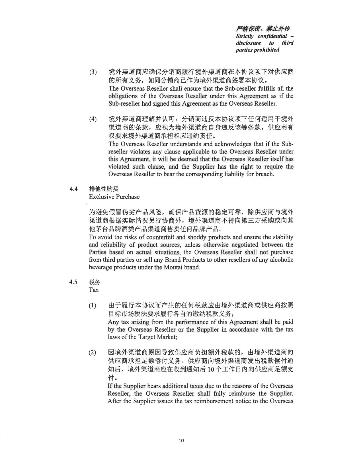 The Overseas Reseller understands and acknowledges that if the Sub - reseller violates any clause applicable to the Overseas Reseller under this Agreement, it will be deemed that the Overseas Reseller itself has violated such clause, and the Supplier has the right to require the Overseas Reseller to bear the corresponding liability for breach . 4.4 Exclusive Purchase 10 To avoid the risks of counterfeit and shoddy products and ensure the stability and reliability of product sources, unless otherwise negotiated between the Parties based on actual situations, the Overseas Reseller shall not purchase from third parties or sell any Brand Products to other resellers of any alcoholic beverage products under the Moutai brand . 4.5 Tax Strictly confidemial - discfosure to third parti‘es p r oh i bited The Overseas Reseller shall ensure that the Sub reseller fulfills all the obligations of the Overseas Reseller under this Agreement as if the Sub - reseller had signed this Agreement as the Overseas Reseller . Any tax arising from the performance of this Agreement shall be paid by the Overseas Reseller or the Supplier in accordance with the fax laws of the Target Market ; (z› a i»xnxzoonnsze - ami›stiioi, aiis›s«xs t^. Rn&Rme14'NA. ‹s asstrfi« aHH4a‹t ns, Wtrfi«& xax:zns 10«zitBHsc. &xfix If the Supplier bears additional taxes due to the reasons of the Overseas Reseller, the Overseas Reseller shall fully reimburse the Supplier . After the Supplier issues the tax reimbursement notice to the Overseas