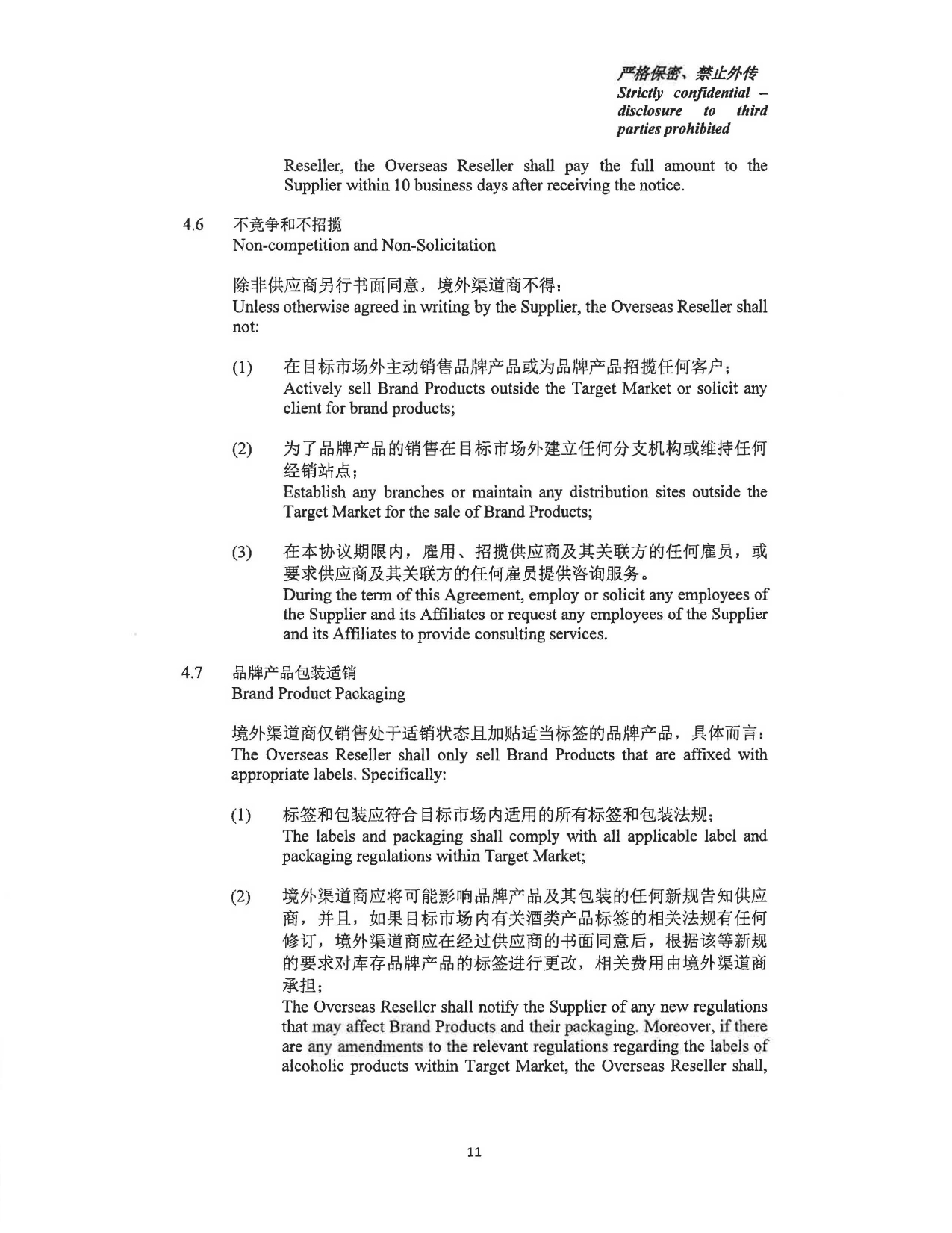 Strictly confidential - disclocure to third parties prohibited Reseller, the Overseas Reseller shall pay the frill amount to the Supplier within 10 business days after receiving the notice. 4.6 Non - competition and Non - Solicitation Unless otherwise agreed in writing by the Supplier, the Overseas Reseller shall not: RBtlO It›1NaR‘WPs »‘•NP. ι s?a«%T4: Actively sell Brand Products outside the Target Market or solicit any client for brand products; ?J% A: Establish any branches or maintain any distribution sites outside the Target Market for the sale of Brand Products; 11 «join' RflH, xn. Hkf*. »iR&ARss‹z‹sY , x«.*. &HsaHW«t1+‹ ι ›u«a fi - AtE&. During the term of this Agreement, employ or solicit any employees of the Supplier and its Affiliates or request any employees of the Supplier and its Affiliates to provide consulting services . 4.7 Brand Product Packaging i#s› &‹x sltluañ &zs›sast+ s sirs, cHzi The Overseas Reseller shall oaly sell Brand Products that are affixed with appropriate labels. Specifically: The labels and packaging shall comply with all applicable label and packaging regulations within Target Market ; The Overseas Reseller shall notify the Supplier of any new regulations that may affect Brand Products and their packaging . Moreover, if there are any amendments to the relevant regulations regarding the labels of alcoholic products within Target Market, the Overseas Reseller shall,