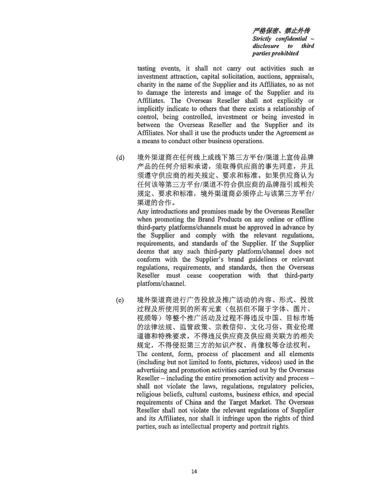 (d) 14 (e) Strictly confide n tial - disclosure to thirst parties prohibited tasting events, it shall not carry out activities such as investment attraction, capital solicitation, auctions, appraisals, charity in the name of the Supplier and its Affiliates, so as not to damage the interests and image of the Supplier and its Affiliates . The Overseas Reseller shall not explicitly or implicitly indicate to others that there exists a relationship of control, being controlled, investment or being invested in between the Overseas Reseller and the Supplier and its Affiliates . Nor shall it use the products under the Agreement as a means to conduct other business operations . P ι &1z‹sraeA«, B‹sfi &âiTK e , »f. r i>^ñ ñ m iéi tfi lii it la^ e. x ñTi I/i?it. In ml ι . aiñ:A i'9 1£‹s«R real «Url c^. st« set s &N ›zH . x« 1 ›t ‹&, fit›Ha «“ »A — orR=UUa NiE&fiI 1 • Any introductions and promises made by the Overseas Reseller when promoting the Brand Products on any online or offiine third - party platforms/channels must be approved in advance by the Supplier and comply with the relevant regulations, requirements, and standards of the Supplier . If the Supplier deems that any such third - party platform/channel does not conform with the Supplier's brand guidelines or relevant regulations, requirements, and standards, then the Overseas Reseller must cease cooperation with that third - party platform/channel . › K ' z> > D ι The content, form, process of placement and all elements (including but not limited to fonts, pictures, videos) used in the advertising and promotion activities carried out by the Overseas Reseller — including the entire promotion activity and process — shall not violate the laws, regulations, regulatory policies, religious beliefs, cultural customs, business ethics, and special requirements of China and the Target Market . The Overseas Reseller shall not violate the relevant regulations of Supplier and its Affiliates, nor shall it infringe upon the rights of third parties, such as intellectual property and portrait rights .