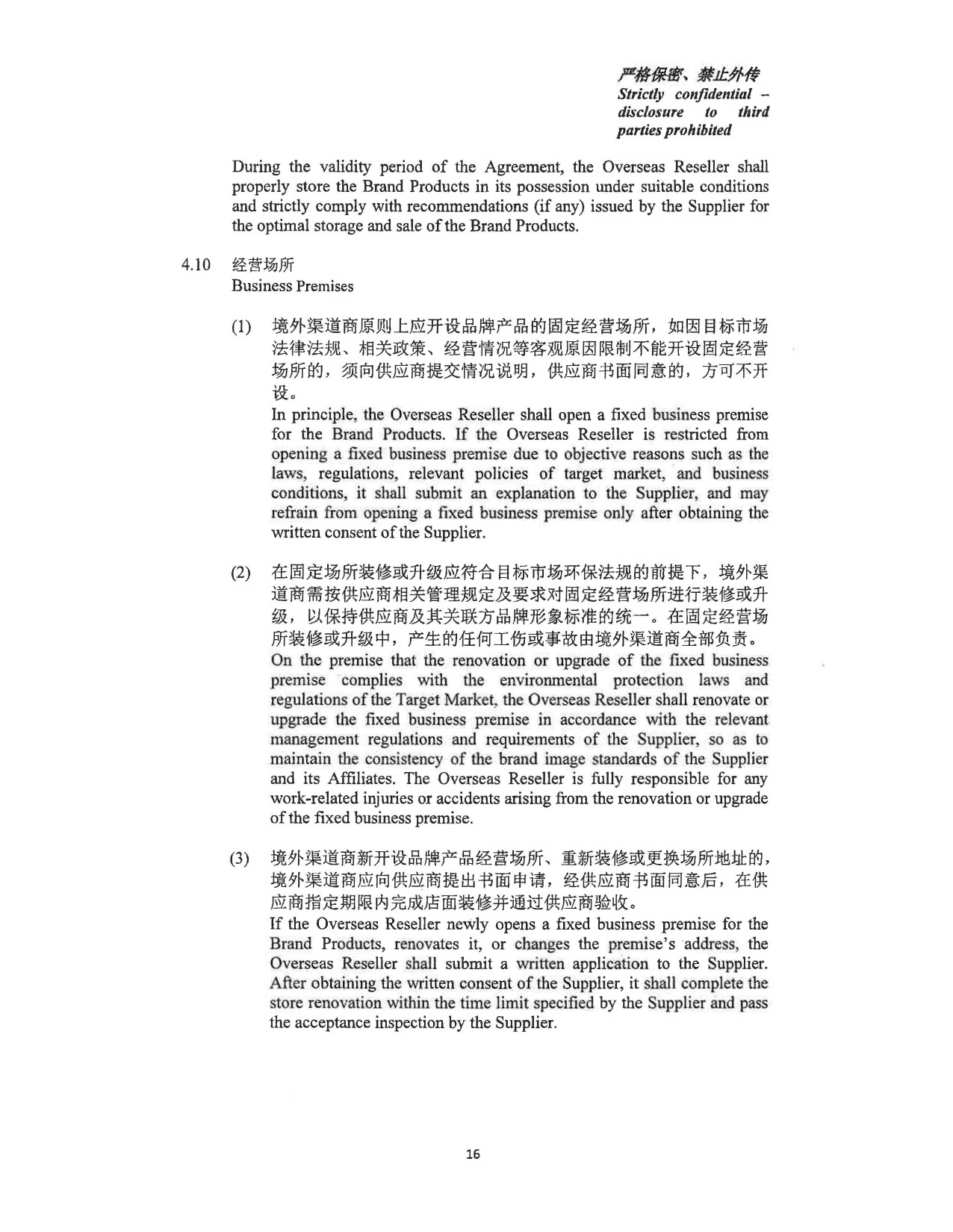 r 16 • ‹s Strictly confidential - disclosure to third parties prohibited During the validity period of the Agreement, the Overseas Reseller shall properly store the Brand Products in its possession under suitable conditions and strictly comply with recommendations (if any) issued by the Supplier for the optimal storage and sale of the Brand Products . 4.10 Ü pî Business Premises In principle, the Overseas Reseller shall open a fixed business premise for the Brand Products . lf the Overseas Reseller is restricted from opening a fixed business premise due to objective reasons such as the laws, regulations, relevant policies of target market, and business conditions, it shall submit an explanation to the Supplier, and may refrain from opening a fixed business premise only after obtaining the written consent of the Supplier . QBZtZ 9 % /ËÄ/fÔîïŸSOaîŸÑb@ÆËÑï %% üT, 94 îË ïÊAÑ&ÄiïŸA@3î'ÈBÑQA2ÑfiBüîb€GPîÀïîÀ/ëÄ/t On the premise that the renovation or upgrade of the fixed business premise complies with the environmental protection laws and regulations of the Target Market, the Overseas Reseller shall renovate or upgrade the fixed business premise in accordance with the relevant management regulations and requirements of the Supplier, so as to maintain the consistency of the brand image standards of the Supplier and its Affiliates . The Overseas Reseller is fully responsible for any work - related injuries or accidents arising from the renovation or upgrade of the fixed business premise . (3) If the Overseas Reseller newly opens a fixed business premise for the Brand Products, renovates it, or changes the premise's address, the Overseas Reseller shall submit a written application to the Supplier . After obtaining the written consent of the Supplier, it shall complete thé store renovation within the time limit specified by the Supplier and pflsE the acceptance inspection by the Supplier .