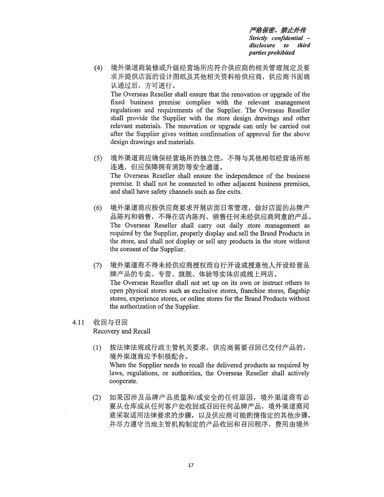 Strictly confidential - disclosure to third 17 The Overseas Reseller shall ensure that the renovation or upgrade of the fixed business premise complies with the relevant management regulations and requirements of the Supplier . The Overseas Reseller shall provide the Supplier with the store design drawings and other relevant materials . The renovation or upgrade can only be carried out after the Supplier gives written confirmation of approval for the above design drawings and materials . The Overseas Reseller shall ensure the independence of the business premise . It shall not be connected to other adjacent business premises, and shall have safety channels such as fire exits . (6) ui›x«asst•.axxzexaaassz, ‹ai›aaar.mr The Overseas Reseller shall carry out daily store management as required by the Supplier, properly display and sell the Brand Products in the store, and shall not display or sell any products in the store without the consent of the Supplier . H F - I > x fi o The Overseas Reseller shall not set up on its own or iristruct others to open physical stores such as exclusive stores, franchise stores, flagship stores, experience stores, or online stores for the Brand Products without the authorization of the Supplier . 4.11 @ JQ [él Recovery and Recall (l) s'ra»eczssxeaazx, ‹aszzxuaex‹tx.aa, When the Supplier needs to recall the delivered products as required by laws, regulations, or authorities, the Overseas Reseller shall actively cooperate . (2) toRO R xWr• ι see/»oA&1zlsxO, nJ›fiaz&fi - xS.am A . 1z‹sfi4»ea , &u‹ - zfisPP‘•, strfia&S