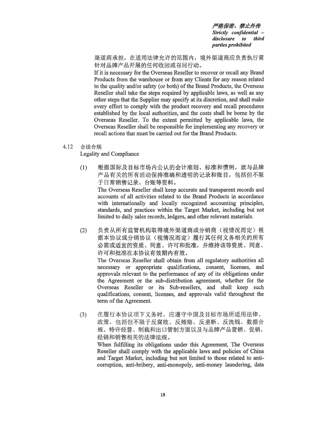 Strictly confidential - disclosure to third parties prohibiteit fiiF&JP — . With fiNfi iT H 4 › APf iâ % >. ñ It(? Y».sNr*. ι »en&‹t‹seaz£aié». If it is necessary for the Overseas Reseller to recover or recall any Brand Products from the warehouse or from any Clients for any reason related to the quality and/or safety (or both) of the Brand Products, the Overseas Reseller shall take the steps required by applicable laws, as well as any other steps that the Supplier may specify at its discretion, and shall make every effort to comply with the product recovery and recall procedures established by the local authorities, and the costs shall be borne by the Overseas Reseller . To the extent permitted by applicable laws, the Overseas Reseller shall be responsible for implementing any recovery or recall actions that must be carried out for the Brand Products . 4.12 IA* Legality and Compliance (2) B& I fi $ theif JI H ›A & fiilflf*.I twit fi‘fifiJ ?ñ — U • ι a P P s&Neisaia»es’/8i1›oa ® P:nJlosfl, &H‹âUsE T B fifiBidY fi fiH $ d • The Overseas Reseller shall keep accurate and transparent records and accounts of all activities related to the Brand Products in accordance with internationally and locally recognized accounting principles, standards, and practices within the Target Market, including but not limited to daily sales records, ledgers, and other relevant materials . a&fi1‘Y utâni'X ‹c‘G:XHH› ai?s1z‹s'x&&N«is m a&«iss. M« itweHN. »&sfi4>s. 4. 1tw1otkxia&HiX‘ wnsOW“e. The Overseas Reseller shall obtain from all regulatory authorities all necessary or appropriate qualifications . consent, licenses, and approvals relevant to the performance of any of its obligations under the Agreement or the sub - distribution agreement, whether for the Overseas Reseller or its Sub - resellers, and shall keep such qualifications, consent, licenses, and approvals valid throughout the term of the Agreement . (3) » H H . e i A » H ( s f i . $ J k I R T › H o & ons $ H : W N & % f . i H H — B B s i . ι i t H Ps s H ifl . f I i T B U. **efitéAtt?t#t £ S • £ t • z . When fulfilling its obligations under this Agreement . The Overseas Reseller shall comply with the applicable laws and policies of China and Target Market, including but not limited to those related to anti - corruption, anti - bribery, anti - monopoly, anti - money laundering, data