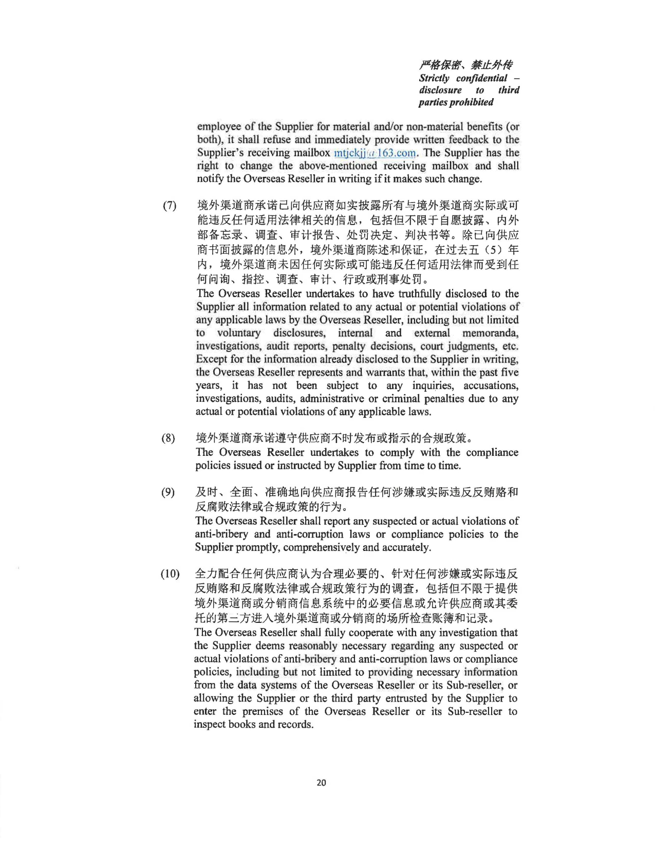 Strictly confideniial - disclosure to third pa d d l e d pr O h i bited employee of the Supplier for material and/or non - material benefits (or both), it shall refuse and immediately provide wrinen feedback to the Supplier's receiving mailbox intjci‹ii ‹ 63 . coin . The Supplier has the right to change the above - mentioned receiving mailbox and shall notify the Overseas Reseller in writing if it makes such change . (7) filâifi . NR . fi . lix . i?iRNPlTRñ . The Overseas Reseller undertakes to have truthfully disclosed to the Supplier all information related to any actual or potential violations of any applicable laws by the Overseas Reseller, including but not limited to voluntary disclosures, internal and external memoranda, investigations, audit reports, penalty decisions, court judgments, etc . Except for the infomiation akeady disclosed to the Supplier in writing, the Overseas Reseller represents and warrants that, within the past five years, it has not been subject to any inquiries, accusations, investigations, audits, administrative or criminal penalties due to any actual or potential violations of any applicable laws . (8) The Overseas Reseller undertakes to comply with the compliance policies issued or instructed by Supplier from time to time. (9) (10) HéfTw& P 5 &( 0 . EN & Ji fi XI . â . fiñ 11 RfiAW KâJH J&w+éfHñAñOIâiB&HñHñi*fiñHicX . The Overseas Reseller shall fully cooperate with any investigation that the Supplier deems reasonably necessary regarding any suspected or actual violations of anti - bribery and anti - corruption laws or compliance policies, including but not limited to providing necessary information from the data systems of the Overseas Reseller or its Sub - reseller, or allowing the Supplier or the third party entrusted by the Supplier to enter the premises of the Overseas Reseller or its Sub - reseller to inspect books and records . afi&& - %i‹ââ,J›, izt›xifi&%s1reiz, x za ‹5) A 20 * iaAzt'/ti¥BauSa&iiA. The Overseas Reseller shall report any suspected or actual violations of anti - bribery and anti - comiption laws or compliance policies to the Supplier promptly, comprehensively and accurately .