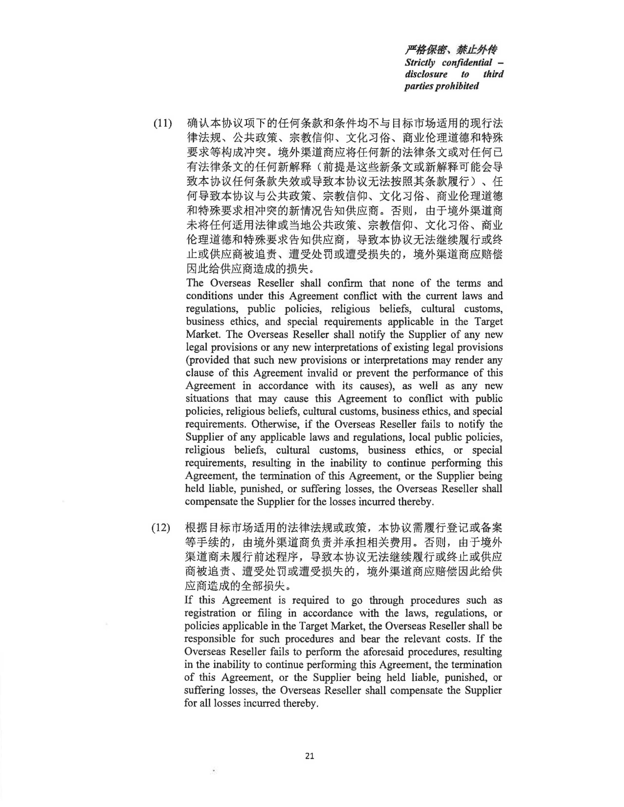 (11) 21 (12) Strictly confidential - disclosure to third P arties R r * hibiteJ &fi»«Afi1z‹ssH& ‹sit«afi<»#&e»sRwwt:ae R&fiiXtt‹%afixBfi4R&fi›Xz sIta«fik:1) . tz «9H&D›X — s.»sa. e‹â‹9. es ‹â. R4itâziE ttR Ntf mci. ‘ ι ’‹ ι tr . . - ^' . IT " N The Overseas Reseller shall confirm that none of the terms and conditions under this Agreement conflict with the current laws and regulations, public policies, religious beliefs, cultural customs, business ethics, and special requirements applicable in the Target Market . The Overseas Reseller shall notify the Supplier of any new legal provisions or any new interpretations of existing legal provisions (provided that such new provisions or interpretations may render any clause of this Agreement invalid or prevent the performance of this Agreement in accordance with its causes), as well as any new situations that may cause this Agreement to conflict with public policies, religious beliefs, cultural customs, business ethics, and special requirements . Otherwise, if the Overseas Reseller fails to notify the Supplier of any applicable laws and regulations, local public policies, religious beliefs, cultural customs, business ethics, or special requirements, resulting in the inability to continue performing this Agreement, the temiination of this Agreement, or the Supplier being held liable, punished, or suffering losses, the Overseas Reseller shall compensate the Supplier for the losses incurred thereby . t £ TiñB . 4 S?tis : i $ : # . 3 itztatiât £ n . i"r›" . 1 . t‹T $ it z a i f i i f R l A z . k i i t 8 m N t i i tH N » . & t H . . W a & fi i , ‘ T R f t › i % «i E f i & Ki ? f N i ‹ - ^ . & f i i f i i s‹ . * . & H$dA i A • If this Agreement is required to go through procedures such as registration or filing in accordance with the laws, regulations, or policies applicable in the Target Market, the Overseas Reseller shall be responsible for such procedures and bear the relevant costs . If the Overseas Reseller fails to perform the aforesaid procedures, resulting in the inability to continue performing this Agreement, the termination of this Agreement, or the Supplier being held liable, punished, or suffering losses, the Overseas Reseller shall compensate the Supplier for all losses incurred thereby .