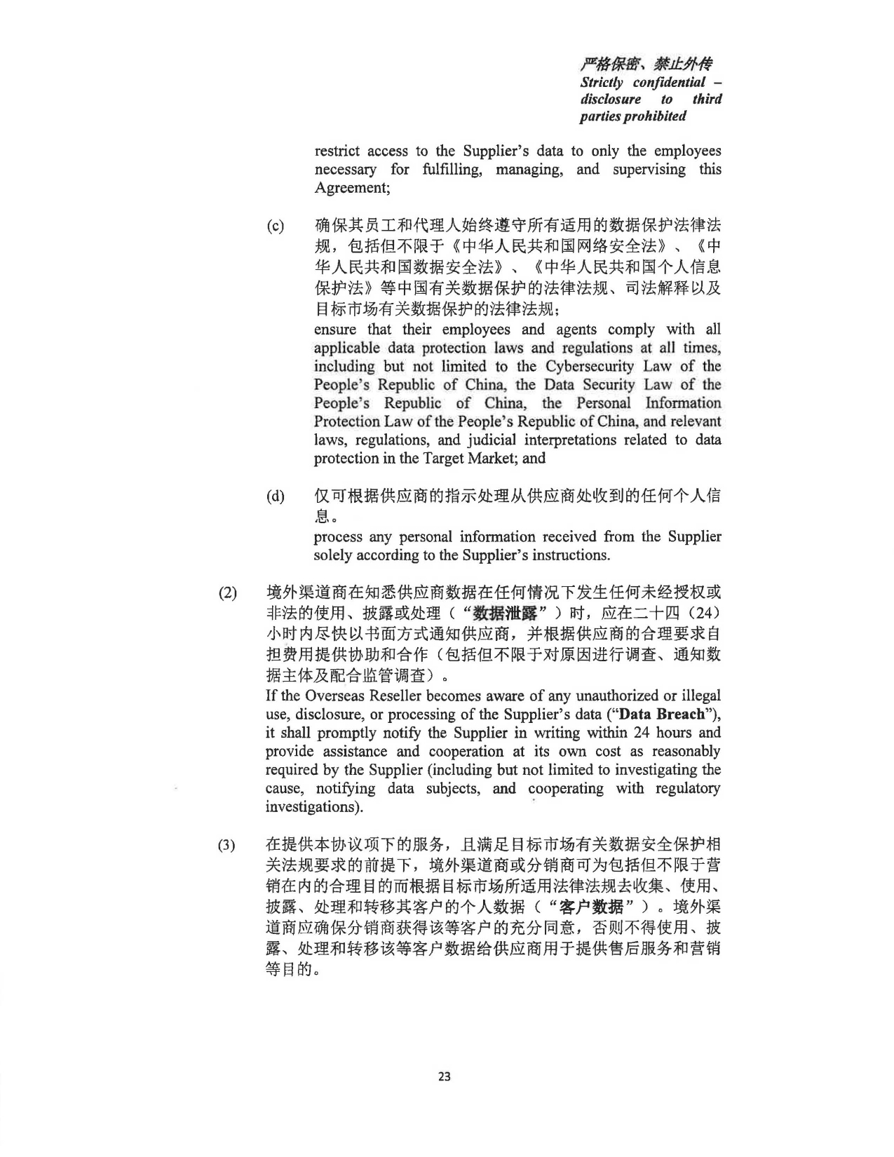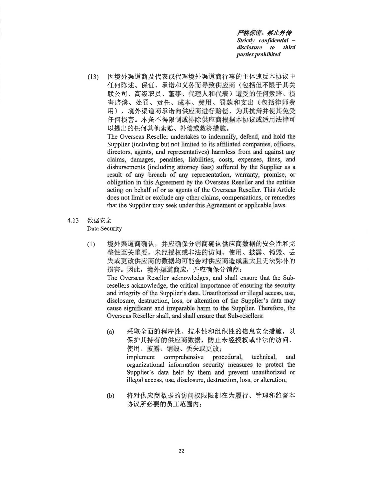 Strictly confdential - disclosure to third parties prohibited 22 Ï1/ëÄÈ. üŒ. aè“6A6BsaeØB ‹üarèT”fikYXË O‹ä. %ÄÄ6. a%. rBA‹oftA) ÑŒøEÄ@s. Ô gËs. /cË. ËÏS. A9. n@. fiAoÄS ‹Qô’A:as a› , s/›saaaa»aüae‹›ea. »xsš»e»gæ , ø o, , •Jq o , , • o fisHs‹ifiatäzñ. ›eN&›AaR. The Overseas Reseller undemkes to indemnify, defend, and hold the Supplier (including but not limited to its affiliated companies, officers, directors, agents, and representatives) harmless ßom and against any claims, damages, penalties, liabilities, costs, expenses, fines, and disbursements (including attorney fees) suffered by the Supplier as a result of any breach of any representaúon, warranty, promise, or obligation in this Agreement by the Overseas Reseller and the entities acting on behalf of or as agents of the Overseas Reseller . This Article does not limit or exclude any other claims, compensations, or remedies that the Supplier may seek under this Agreement or applicable laws . 4.13 ntR@A Data Security X«K«afi,B essassaH« RaazAfiTees›s tmp • !BA . RffRíß&fi • A RRP - tn B The Overseas Reseller acknowledges, and shall ensure that the Sub - resellers acknowledge, the critical importance of ensuring the security and integrity of the Supplier's data . Unauthorized or illegal access, use, disclosure, destruction, loss, or alteration of the Supplier’s data tnay cause significant and irreparable harm to the Supplier . Therefore, the Overseas Reseller shall, and shall ensure that Sub - résellers : (a) zoaaeem'». a«aæs>‹is‹a,z,»a»m, u i e q ø p A . a a 7 ø r t , ñ ø st z s 2 . ø z B < R « . x H e i k . ¥ IiI 2 tzã 4 fiã&› 7 i : % . implement comprehensive procedural, technical, and organizational information security measures to protect the Supplier's data held by them and pręvent unauthorized of illegal access, use, disclosure, destniction, loss, or alteration ; (b› ›s<ø : «zazaï› : aaiss‹t : a»ar . ee›nuas