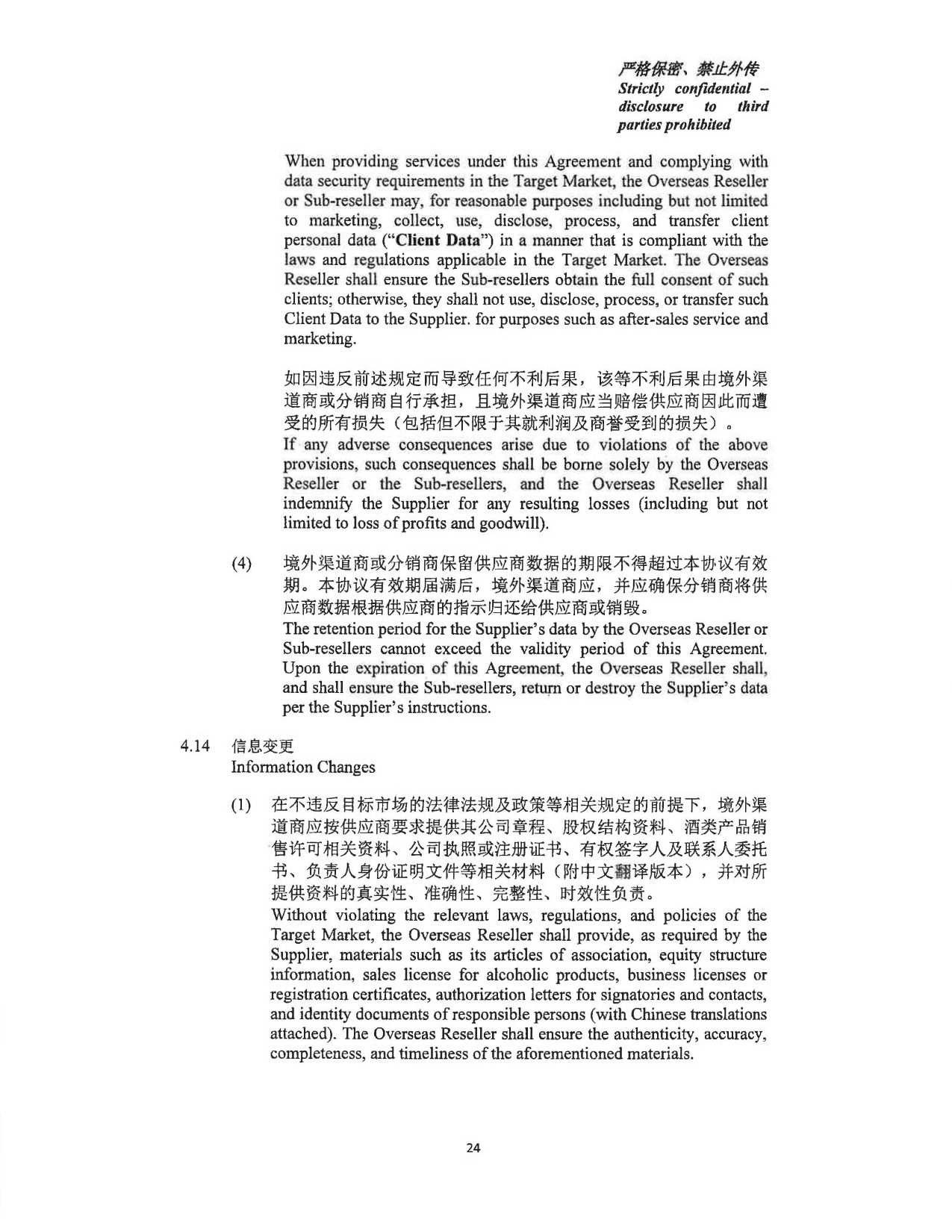 If any adverse consequences arise due to violations of the above provisions, such consequences shall be bonse solely by the Overseas Reseller or the Sub - resellers, and the Overseas Reseller shall indemnify the Supplier for any resulting losses (including but not limited to loss of profits and goodwill) . (4) The retention period for the Supplier's data b the Overseas Reseller or Sub - resellers cannot exceed the validity period of this Agreement . Upon the expiration of this Agreement, the Overseas Reseller shall, and shall ennire the Sub - resellers, return or destroy the Supplier's data per the Supplier's instructions . 4.14 } ,& Information Changes 24 Strictly confidential - disclocure to third parties R r *! ib i ted When providing services under this Agreement and complying with data security requirements in the Target Market, the Overseas Reseller or Sub - reseller may, for teasonable purposes iocluding but not limited to marketing, collect, use, disclose, process, and transfer client personal data (“Client Datn”) in a manner that iS GO 2 Tlpliant with the laws and regolations applicable in the Target Market . The Overseas Reieller shall ensure the Sub - resellers obtain the full consent of such clients ; otherwise, they shall not use, disclose, process, or transfer such Client Data to the Supplier . for purposes such as after - sales service and marketing . a«sot1znlt. Nati. s‹1. »aI1><. . Without violating the relevant laws, regulations, and policies of the Target Market, the Overseas Reseller shall provide, as required by the Supplier, materials such as its articles of association, equity structure information, sales license for alcoholic products, business licenses or registration certificates, authorization letters for signatories and contacts, and identity documents of responsible persons (with Chinese translations attached) . The Overseas Reseller shall ensure the authenticity, accuracy, completeness, and timeliness of the aforementioned materials .