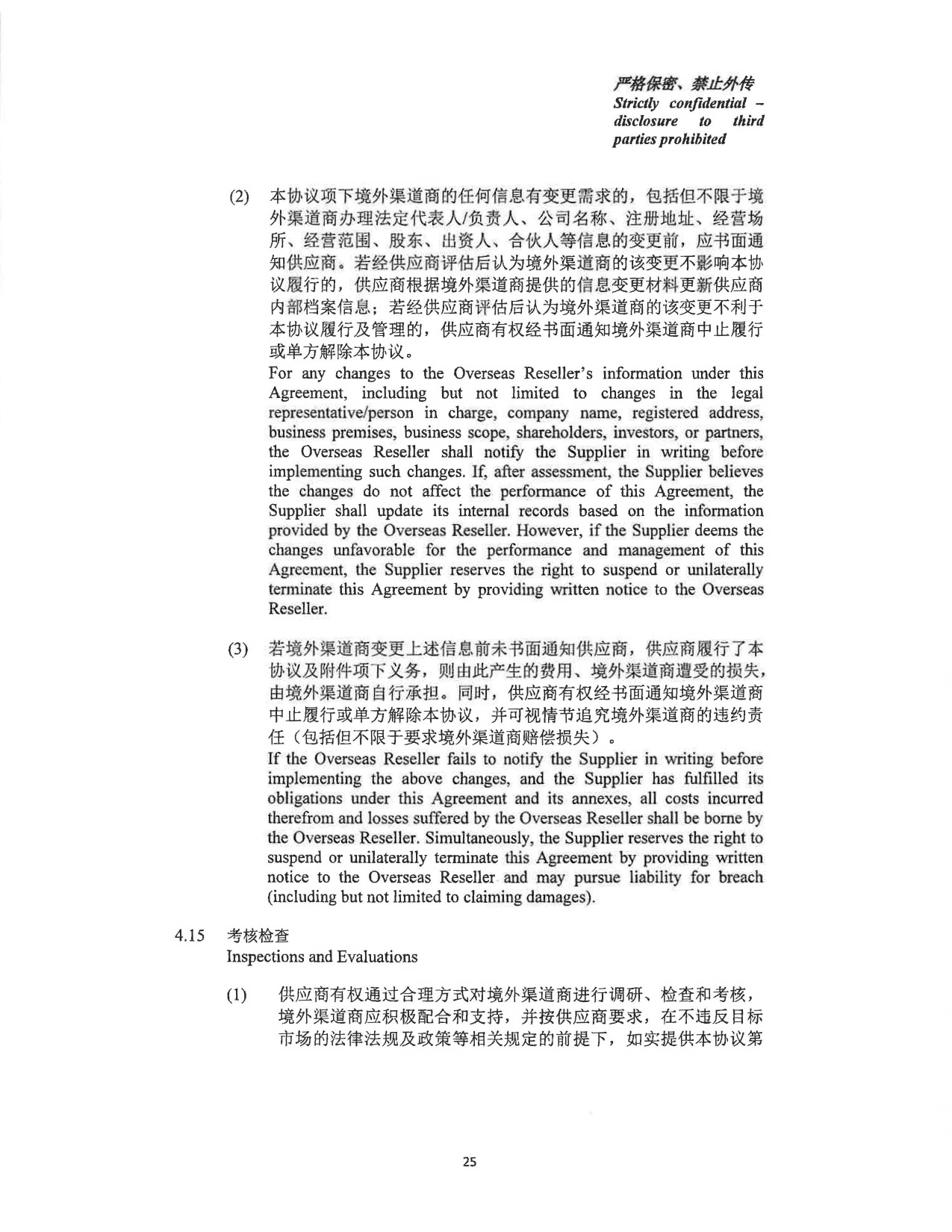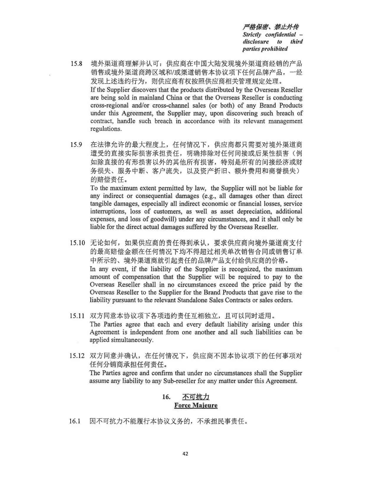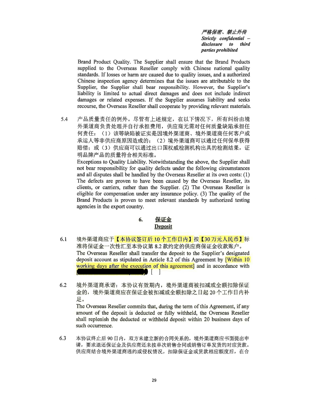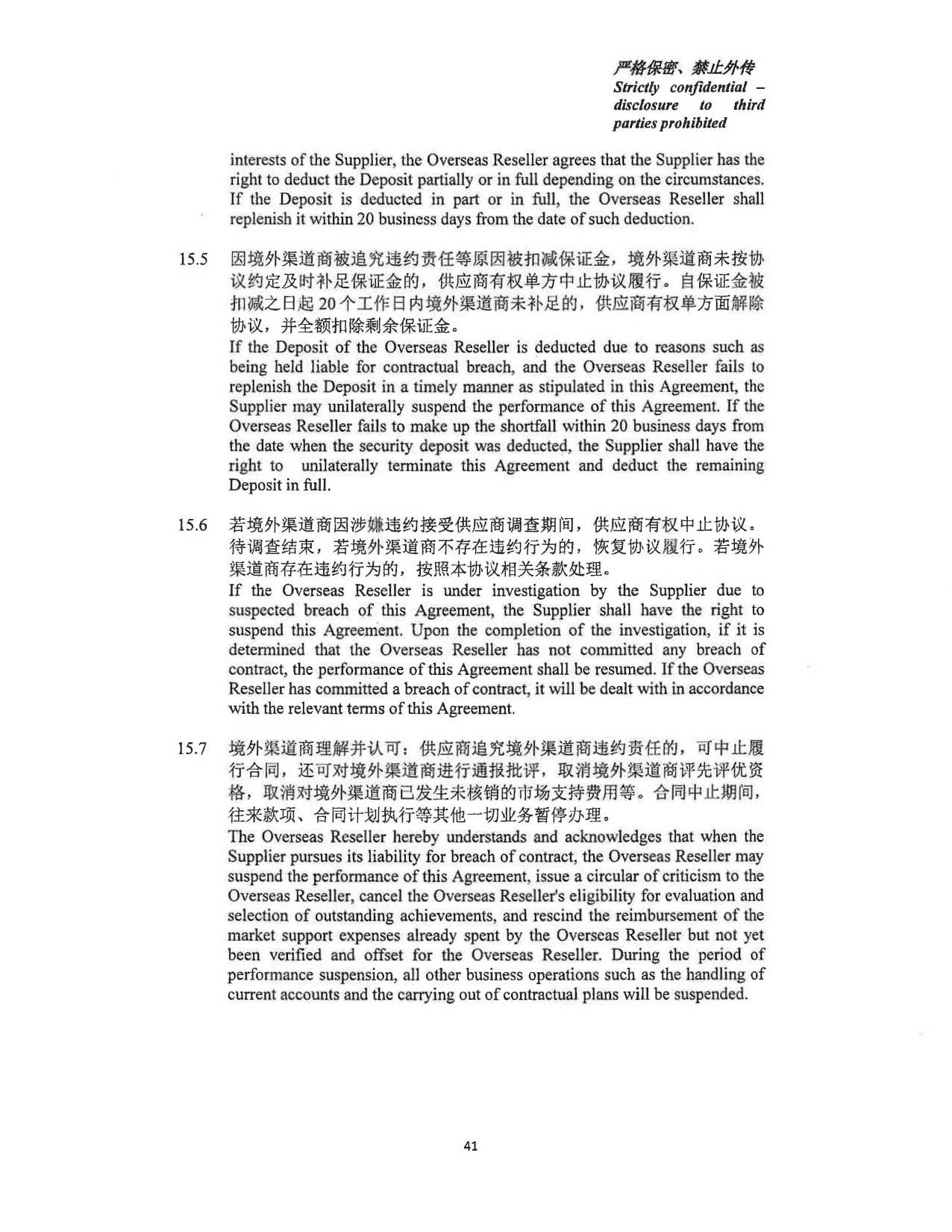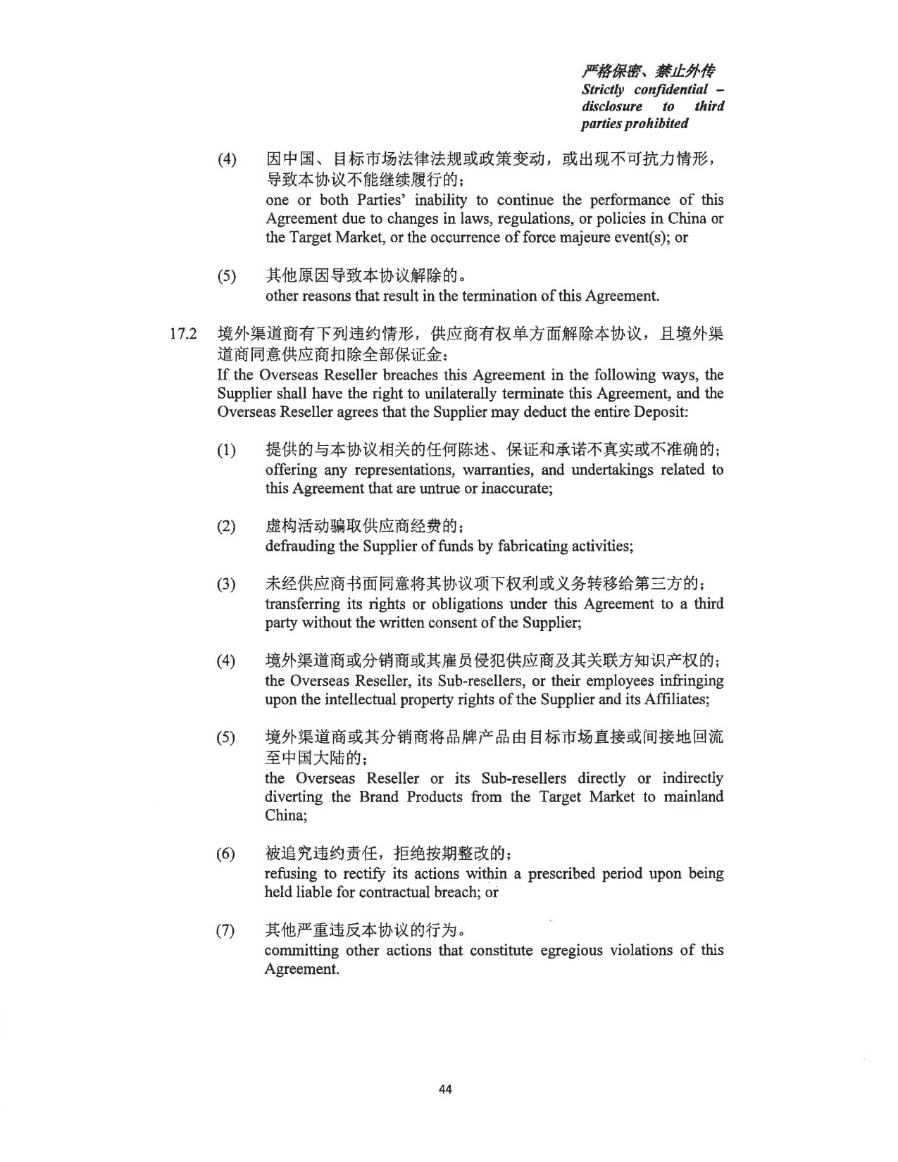 fifricffJ conJdezffiai - disclosure to third po t t ies prohibited 44 •a&n.X’U8: xil&: one or both Parties’ inability to continue the performance of this Agreement due to changes in laws, regulations, or policies in China or the Target Market, or the occurrence of force majeure event(s) ; or (5› s‹xao+a+*x‘v>it. other reasons that result in the termination of this Agreement . If the Overseas Reseller breaches this Agreement in the following ways, the Supplier shall have the right to unilaterally terminate this Agreement, and the Overseas Reseller agrees that the Supplier may deduct the entire Deposit : offering any ‘representa'tions, warr ties, and undertakings related to this Agreement that are untrue or inaccurate; defrauding the Supplier of funds by fabricating activities; (3) 1 & fi tfi 19Afi i' %TRPJ ’A&RGiâR — A& : transferring its rights or obligations under this Agreement to a third party without the written consent of the Supplier; (4) fit› «s%*uBz nJ£ eIE« zxn«RsH1. ƒ .Ptt : the Overseas Reseller, its Sub - resellers, or their employees infringing upon the intellectual property rights of the Supplier and its Affiliates; the Overseas 'Reseller or its Sub - resellers directly or indirectly diverting the Brand Products from the Target Market to mainland China ; (6) aaa*ssz«, tsnsusuei› refusing to rectify its actions within a prescribed period upon being held liable for contractual breach; or (7) s‹t»z»HWHi’Xe;iiL. committing other actions that constitute egregious violations of this Agreement.