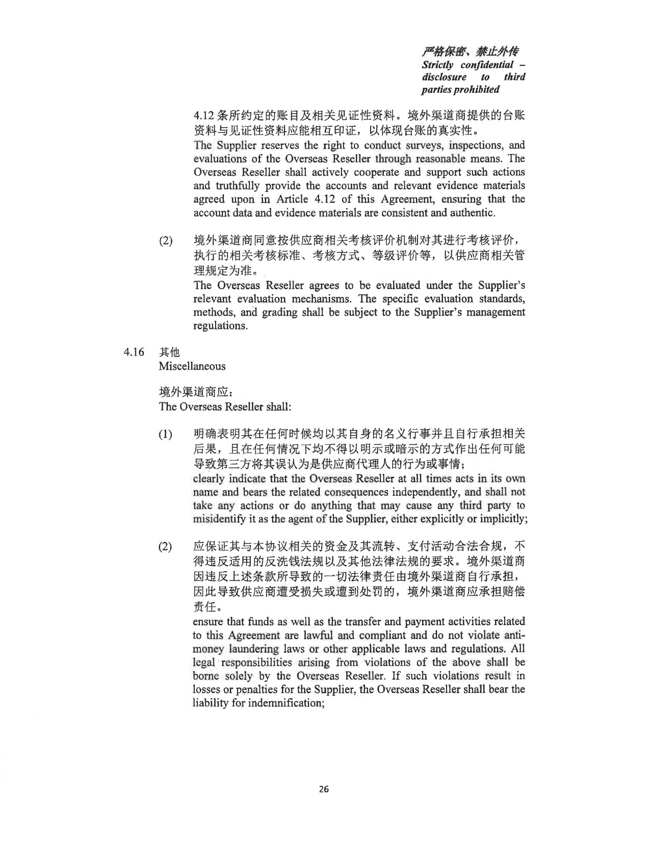 Strictly confidential - disclosure to third parties prohibited 4 - . 2 . «t#s « , z&sfl a - & . N+ • izR H , . » ss›"A « - Aa ak The Supplier reserves the right to conduct surveys, inspections, and evaluations of the Overseas Reseller through reasonable means . The Overseas Reseller shall actively cooperate and support such actions and truthfully provide the accounts and relevant evidence materials agreed upon in Article 4 . 12 of this Agreement, ensuring that the account data and evidence materials are consistent and authentic . 26 The Overseas Reseller agrees to be evaluated under the Supplier's relevant evaluation mechanisms . The specific evaluation standards, methods, and grading shall be subject to the Supplier's management regulations . 4.16 &O Miscellaneous The Overseas Reseller shall: clearly indicate that the Overseas Reseller at all times acts in its own name and bears the related consequences independently, and shall not take any actions or do anything that may cause any third party to ioisidentify it as the agent of the Supplier, eithcr explicitly or implicitly ; ensure that funds as well as the transfer and payment activities related to this Agreement are lawful and compliant and do not violate anti - money laundering laws or other applicable laws and regulations . All legal responsibilities arising from violations of the above shall be borne solely by the Overseas Reseller . If such violations result in losses or penalties for the Supplier, the Overseas Reseller shall bear the liability for indemnification ;
