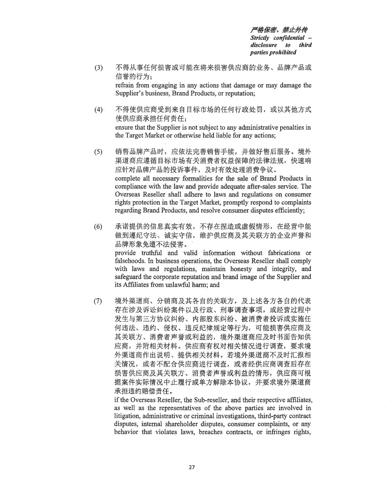 (3) refrain fiom engaging in any actions that damage or may damage the Supplier's business, Brand Products, or reputation; 27 (4) (5) complete all necessary formalities for the sale of Brand Products in compliance with the law and provide adequate after - sales service . The Overseas Reseller shall adhere to laws and regulations on consumer rights protection in the Target Market, promptly respond to complaints regarding Brand Products, and resolve consumer disputes efficiently ; (6) provide tnithful and valid information without fabrications or falsehoods . In business operations, the Overseas Reseller shall comply with laws and regulations, maintain honesty and integrity, and safeguard the corporate reputation and brand image of the Supplier and its Affiliates from unlawful harm ; and (7) Strictly confidential - disclosure to third parties prohibited ‹xnsnnts‹z‹sziz. ensure that the Supplier is not subject to any administrative penalties in the Target Market or otherwise held liable for any actions; æît@?ï. ïàx6P%Äf:6%. s4FÜÑBÜe%J:8^eü . /ïŸ@ . ?fbî 1 îI 3 îtSiÏ . f . ƒ . IX 9 BÑ % 3 î‘äÀÔJîÜ€, 2 Ù 9 ’fa fiVfi Hfifi & i?fiA fi*1f.. & fiAfiUA tiïZfJi KRAAHS . id $¥ J ι ¥ I 7 'JA& 1 G/fi . iJi éitttl a R i R a 1 « 1 s $ s f » 5 ‹ ' • I f z : A ‹ z t i . kH‹émT 5 Si % &iti'x . #TmB#fTi £ R if the Overseas Reseller, the Sub - reseller, and their respective affiliates, as well as the representatives of the above parties are involved in litigation, administrative or criminal investigaüons, third - party contrast disputes, intemal shareholder disputes, consumer complaints, or any behavior that violates laws, breaches contracts, or infringes rights,