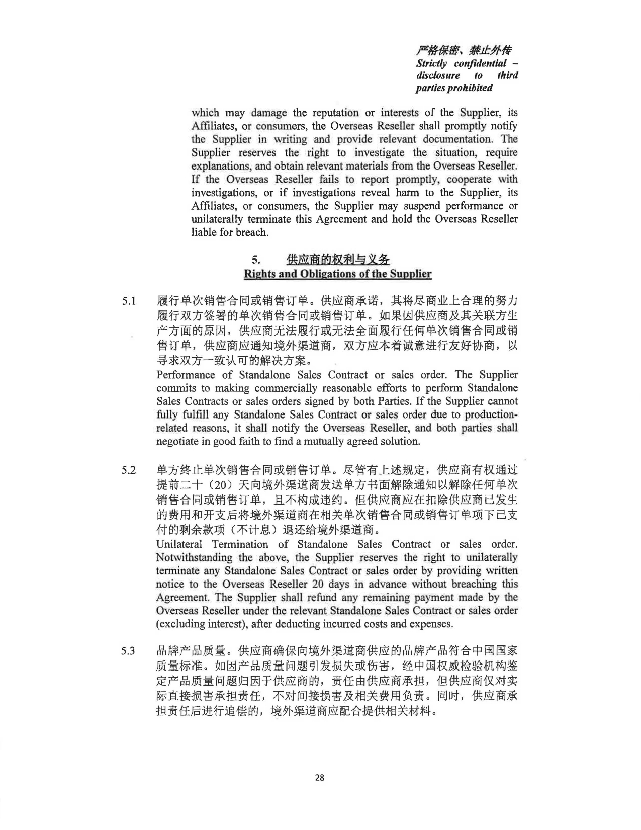 5.2 28 Unilateral Termination of Standalone Sales Contract or sales order . Notwithstanding the above, the Supplier reserves the right to unilaterally terminate any Standalone Sales Contract or sales order by providing written noticé to the Overseas Reseller 20 days in advance without breaching this Agreement . The Supplier shail refund any remaining payment made by the Overseas Reseller under the relevant Standalone Sales Contract or sales order (excluding interest), after deducting incurred costs and expenses . 5.3 Strictly confidential - disclos u re to third parties prohibited which may damage the reputation or interests of the Supplier, its Affiliates, or consumers, the Overseas Reseller shall promptly notify the Supplier in writing and provide relevant documentation . The Supplier rves the right to investigate the situation, require explanations, and obtain relevant materials from the Overseas Reseller . If the Overseas Reseller fails to report promptly, cooperate with investigations, or if investigations reveal harm to the Supplier, its Affiliates, or consumers, the Supplier may suspend performance or unilaterally terminate this Agreement and hold the Overseas Reseller liable for breach . s. RN & Ext Righis and Obligations of the Supplier 5.1 Hi1¥’/ARfi M Rs1T¥. « &z», alsn. B4iA e&nA ai?z7Waoâ«¥’/XRs N siTY. toXak «iR&a&o1 Performance of Standalone Sales Contract or sales order . The Supplier commits to making commercially reasonable efforts to perform Standalone Sales Contracts or sales orders signed by both Parties . If the Supplier cannot fully fulfill any Standalone Sales Contract or sales order due to production - related reasons, it shall notify the Overseas Reseller, and both parties shall negotiate in good faith to find a mutually agreed solution . a% - T (2s) TsWt› «zss«Trfi&RratoâHe1z‹s&›w