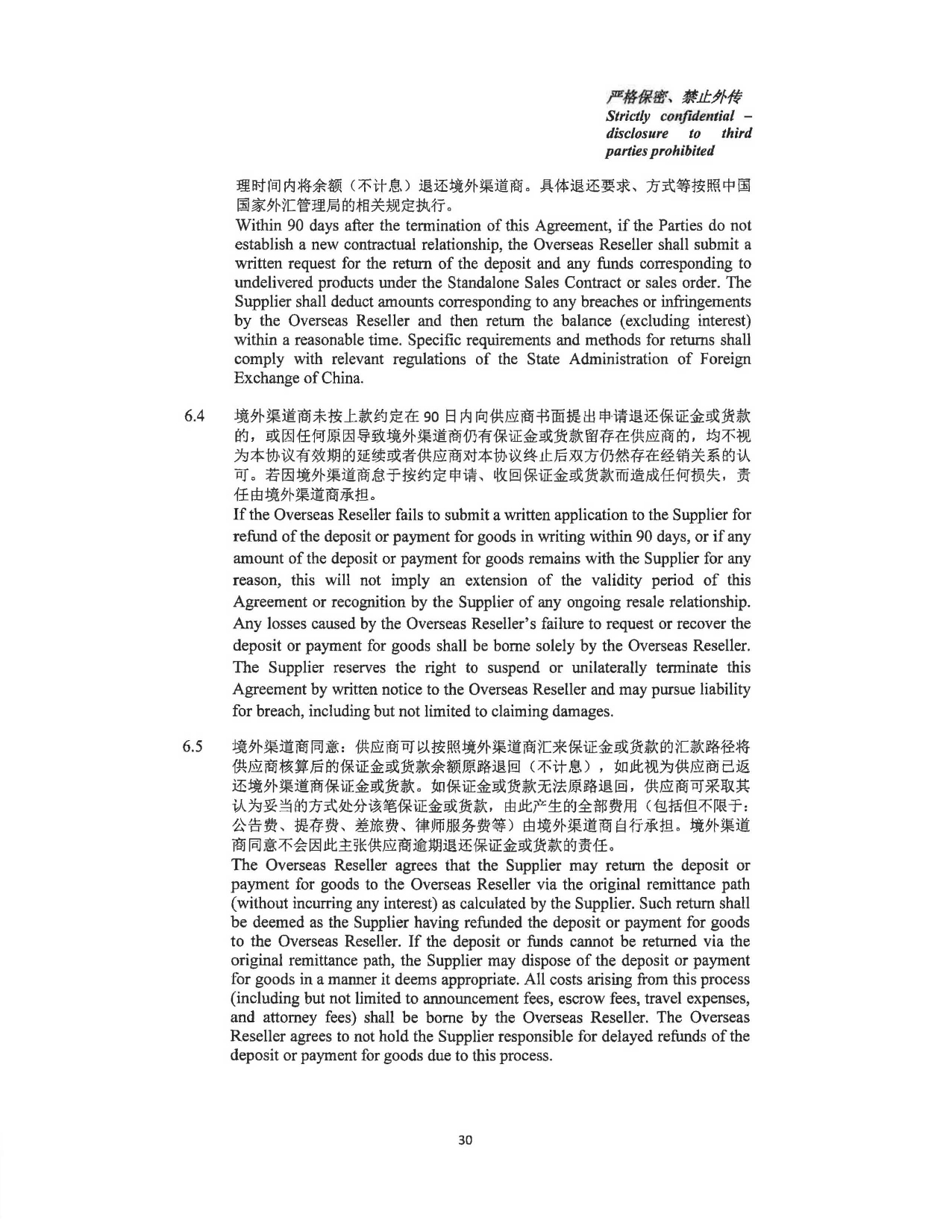 Strictly confulential - disclos u re to third partiec prohibited &JétiE‘a H tt 18 ANH&iJ . Within 90 days after the termination of this Agreement, if the Parties do not establish a new contractual relationship, the Overseas Reseller shall submit a written request for the return of the deposit and any funds corresponding to undelivered products under the Standalone Sales Contract or sales order . The Supplier shah deduct amounts corresponding to any breaches or infringements by the Overseas Reseller and then return the balance (excluding interest) within a reasonable time . Specific requirements and methods for returns shall comply with relevant regulations of the State Administration of Foreign Exchange of China . 6.4 30 • . - e • = . in ‹zzas›issza›s. If the Overseas Reseller fails to submit a written application to the Supplier for refund of the deposit or payment for goods in writing within 90 days, or if any amount of the deposit or payment for goods remains with the Supplier for any reason, this will not imply an extension of the validity period of this Agreement or recognition by the Supplier of any ongoing resale relationship . Any losses caused by the Overseas Reseller's failure to request or recover the deposit or payment for goods shall be borne solely by the Overseas Reseller . The Supplier reserves the right to suspend or unilaterally terminate this Agreement by written notice to the Overseas Reseller and may pursue liability for breach, including but not limited to claiming damages . 6.5 Iéswa&4tJIkc^ a&&fi‹eUa aas ‹z. The Overseas Reseller agrees that the Supplier may return the deposit or payment for goods to the Overseas Reseller via the original remittance path (without incurring any interest) as calculated by the Supplier . Such return shall be deemed as the Supplier having refunded the deposit or payment for goods to the Overseas Reseller . If the deposit or funds cannot be returned via the original remittance path, the Supplier may dispose of the deposit or payment for goods in a manner it deems appropriate . All costs arising from this process (including but not limited to announcement fees, escrow fees, travel expenses, and attorney fees) shall be borne by the Overseas Reseller . The Overseas Reseller agrees to not hold the Supplier responsible for delayed refunds of the deposit or payment for goods due to this process .