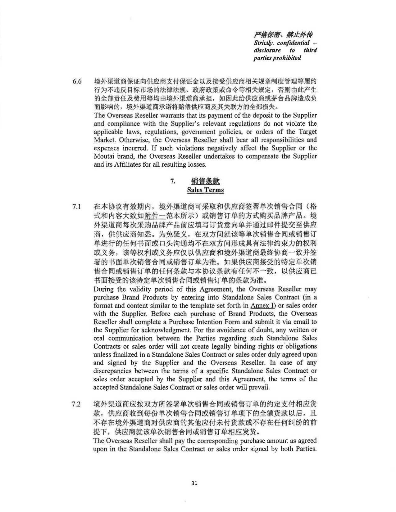 6.6 31 7.1 During the validity period of this Agreement, the Overseas Reseller may purchase Brand Products by entering into Standalone Sales Contract (in a format and content similar to the template set forth in Annex I) or sales order with the Supplier . Before each purchase of Brand Products, the Overseas Reseller shall complete a Purchase Intention Form and submit it via email to the Supplier for acknowledgment . For the avoidance of doubt, any written or oral communication between the Parties regarding such Standalone Sales Contracts or sales order will not create legally binding rights or obligations unless finalized in a Standalone Sales Contract or sales order duly agreed upon and signed by the Supplier and the Overseas Reseller . In case of any discrepancies between the terms of a specific Standalone Sales Contract or sales order accepted by the Supplier and this Agreement, the terms of the accepted Standalone Sales Contract or sales order will prevail . 7.2 The Overseas Reseller warrants that its payment of the deposit to the Supplier and compliance with the Supplier’s relevant regulations do not violate the applicable laws, regulations, government policies, or orders of the Target Market . Otherwise, the Overseas Reseller shall bear all responsibilities and expenses incurred . If such violations negatively affect the Supplier or the Moutai brand, the Overseas Reseller undertakes to compensate the Supplier and its Affiliates for all resulting losses . 7. J@J Sales Terms The Overseas Reseller shall pay the corresponding purchase amount as agreed upon in the Standalone Sales Contract or sales order signed by both Parties.