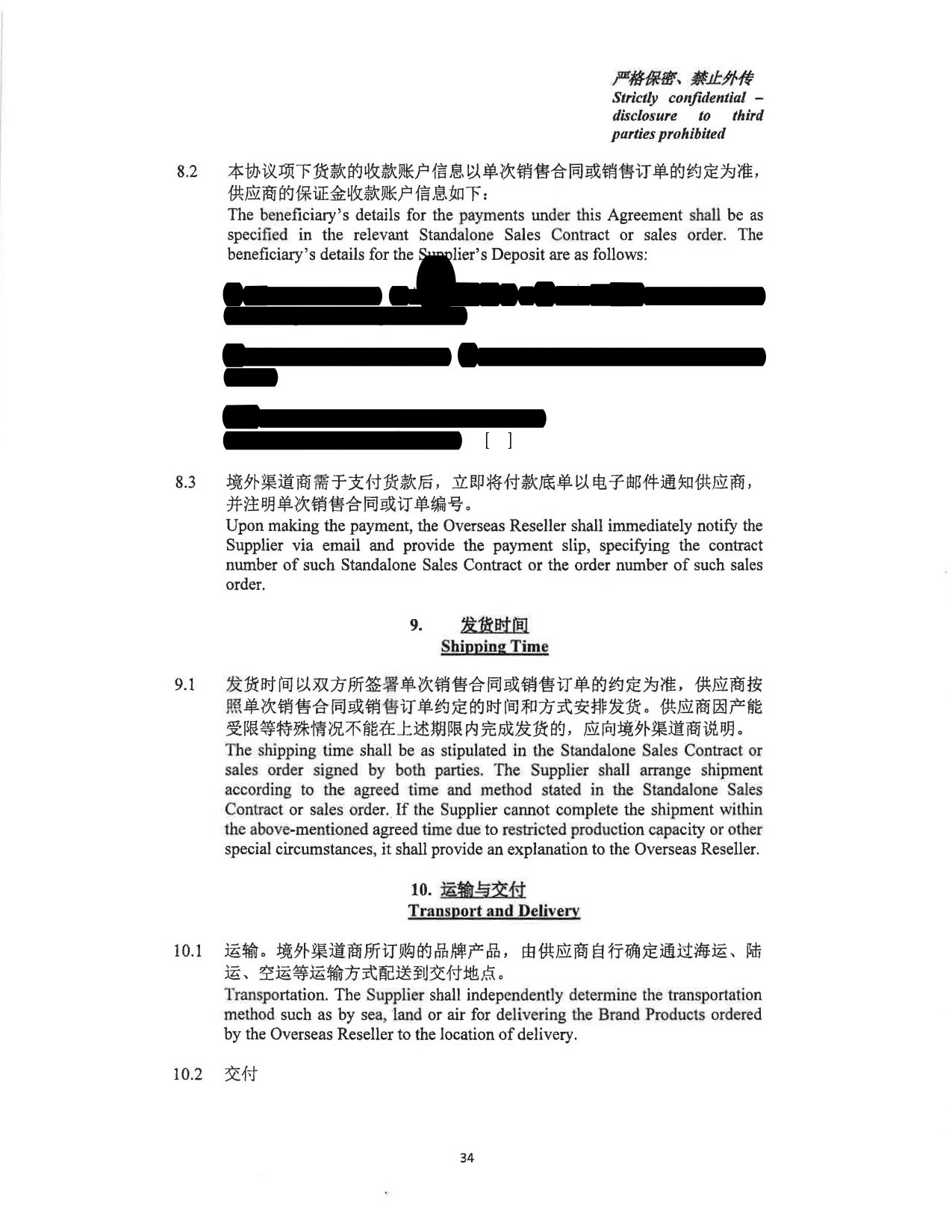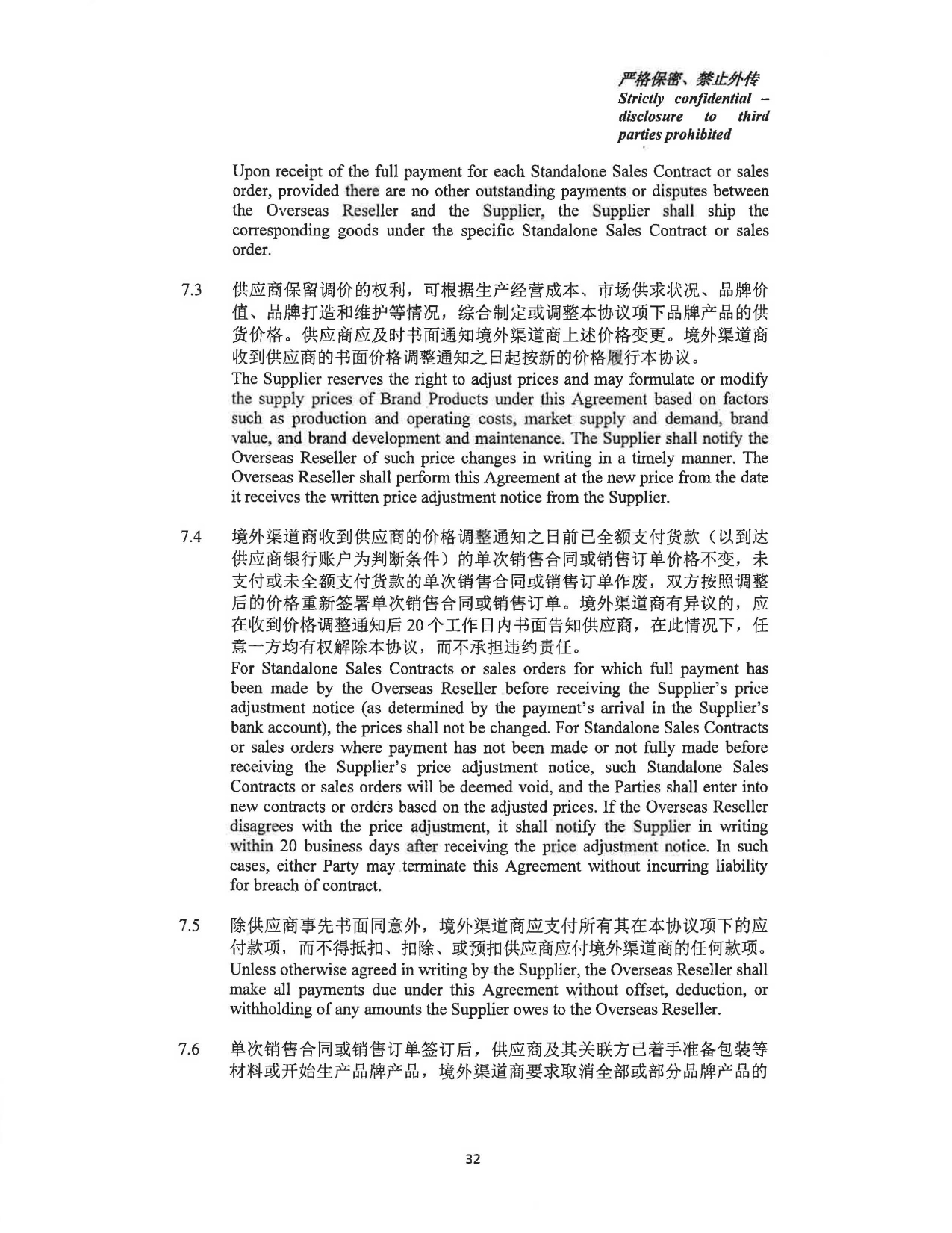 7.3 32 7.4 7.6 Strictly confidential - itisclosure to third parties prohibited Upon receipt of the full payment for each Standalone Sales Contract or sales order, provided there are no other outstanding payments or disputes between the Overseas Reseller and the Supplier . the Supplier shall ship the corresponding goods under the specific Standalone Sales Contract or sales order . tfi . â W›r % fifi&« 1 re, sJx fiR&HiX‘*xT spr • ι st ι . ñXltiiEO&1i&ñ8«9iEeaaa£B£&J?t&&ii?‹fiiz' . The Supplier reserves the right to adjust prices and may formulate or modify the supply prices of Brand Products under this Agreement based on factors such as production and operating costs, market supply and demand, brand value, and brand development and maintenance . The Supplier shall notify the Overseas Reseller of such price changes in writing in a timely manner . The Overseas Reseller shall perform this Agreement at the new price from the date it receives the written price adjustment notice from the Supplier . . ‹r . • • - i i •" , $J43£4éiAJt>*.iaéi4’‹AtéB£rKinia9iT¥JtE, n£i0Jñ«ñ séi»sxsx - Y¥:risks asiTT. i€t› «&&P.'X&, Jxex:tsWRibtcs 2s «x»B A«maengfii;a. fiftI›"‹AT, » For Standalone Sales Contracts or sales orders for which full payment has been made by the Overseas Reseller before receiving the Supplier's price adjustment notice (as determined by the payment's arrival in the Supplier's bank account), the prices shall not be changed . For Standalone Sales Contracts or sales orders where payment has not been made or not fully made before receiving the Supplier's price adjustment notice, such Standalone Sales Contracts or sales orders will be deemed void, and the Parties shall enter into new contracts or orders based on the adjusted prices . If the Overseas Reseller disagrees with the price adjustment, it shall notify the Supplier in writing within 20 business days after receiving the price adjustment notice . In such cases . either Party may terminate this Agreement without incurring liability for breach of contract . JS t. & A K filti N ét. 4éffifilâi A1?ffi&&fi&U 1’ fiT & #ifiu. mTise›n . tn tit. matoeEi?»mft4#›iiisiei t»‹z‹%a4 ƒ Unless otherwise agreed in writing by the Supplier, the Overseas Reseller shall make all payments due under this Agreement without offset, deduction, or withholding of any amounts the Supplier owes to the Overseas Reseller. 7.5