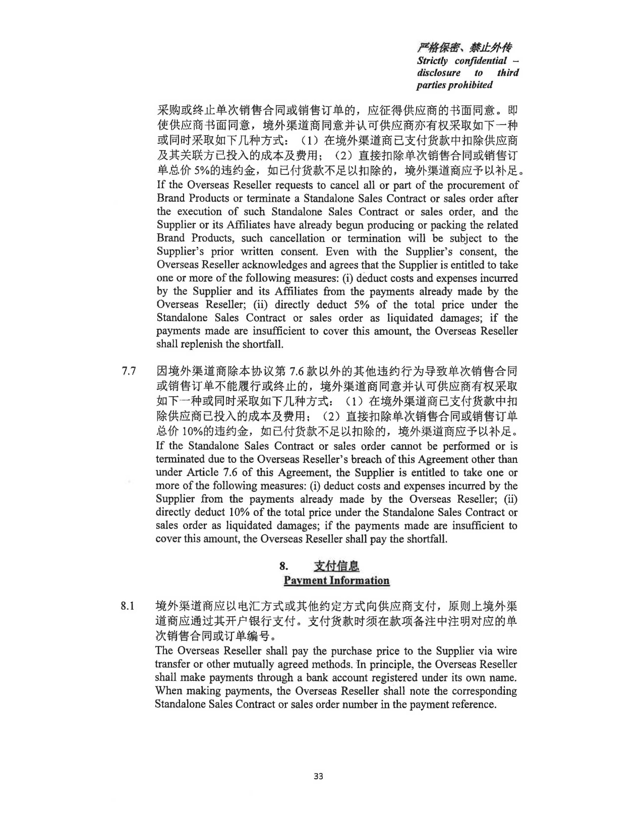 7.7 33 Strictly confidential - disclos u re to third parties prohibited =' »Jie'/zBs iz sâstlaJi, (+ t^ aâi«& . › R a«& fi, atffi«aNfi»ñwe &fi&stJ"tinnT — B itflsJâtRSar/tN»rz. (i) x‹i#›xizxz$J4si.a+tn«»%:xx AZ £$ »zBAéia 4 nnn› ‹ 2 ) £ 8 totâ 9 ›xsiA?rn 3 sé 9 ir ¥ . Air 5 % giss 5 A, In Z 14 J#izUflfit 0 ; éiâi . W#› iElif TtJs›A . If the Overseas Reseller requests to cancel all or part of the procurement of Brand Products or terminate a Standalone Sales Contract or sales order after the execution of such Standalone Sales Contract or sales order, and the Supplier or its Affiliates have already begun producing or packing the related Brand Products, such cancellation or termination will be subject to the Supplier's prior written consent . Even with the Supplier's consent, the Overseas Reseller acknowledges and agrees that the Supplier is entitled to take one or more of the following measures : (i) deduct costs and expenses incurred by the Supplier and its Affiliates from the payments already made by the Overseas Reseller ; (ii) directly deduct 5 % of the total price under the Standalone Sales Contract or sales order as liquidated damages ; if the payments made are insufficient to cover this amount, the Overseas Reseller shall replenish the shortfall . lii & OkA N&HR9 : (2)flute ¥iaiâB 18B›T¥ e.‹r i0%tr»iast4, xozJrJi3.wxâtn4»&. ii#›"x ι izxsivu?›A. If the Standalone Sales Contract or sales order cannot be performed or is terminated due to the Overseas Reseller's breach of this Agreement other than under Article 7 . 6 of this Agreement, the Supplier is entitled to take one or more of the following measures : (i) deduct costs and expenses incurred by the Supplier from the payments already made by the Overseas Reseller ; (ii) directly deduct 10 % of the total price under the Standalone Sales Contract or sales order as liquidated damages ; if the payments made are insufficient to cover this amount, the Overseas Reseller shall pay the shortfall . Payment Information 8.1 ’fAiéo fi ITNAH • The Overseas Reseller shall pay the purchase price to the Supplier via wire transfer or other mutually agreed methods . In principle, the Overseas Reseller shall make payments through a bank account registered under its own name . When making payments, the Overseas Reseller shall note the corresponding Standalone Sales Contract or sales order number in the payment reference .