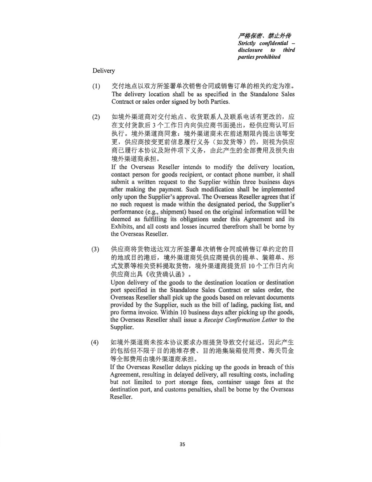 Delivery (i) m‹›nnunrsxuaa‹soanuesvvatixssxa. The delivery location shall be as specified in the Standalone Sales Contract or sales order signed by both Parties. (2) 35 Strictly confidential - disclosure to third R • r ties p r ohibited If the Overseas Reseller intends to modify the delivery location, contact person for goods recipient, or contact . phone number, it shall submit a written request to the Supplier within three business days after making the payment . Such modification shall be implemented only upon the Supplier's approval . The Overseas Reseller agrees that if no such request is made within the designated period, the Supplier's performance (e . g . , shipment) based on the original infomiation will be deemed as fulfilling its obligations under this Agreement and its Exhibits, and all costs and losses incurred therefrom shall be borne by the Overseas Reseller . (3) Upon delivery of the goods to the destination location or destination port specified in the Standalone Sales Contract or sales order, the Overseas Reseller shall pick up the goods based on relevant documents provided by the Supplier, such as the bill of lading, packing list, and pro forma invoice . Within 10 business days after piclcing up the goods, the Overseas Reseller shall issue a Receipt Confirmation Jr 0 er to the Supplier . (4) If the Overseas Reseller delays picking up the goods in breach of this Agreement, resulting in delayed delivery, all resulting costs, including but not limited to port storage fees, container usage fees at the destination port, and customs penalties, shall be borne by the Overseas Reseller .