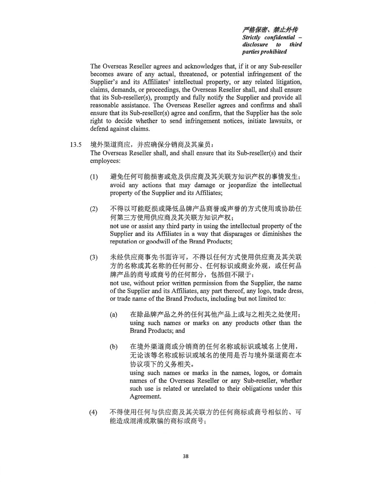 Strictly confidential - disclosure to third part’res prohibited The Overseas Reseller agrees and acknowledges that, if it or any Sub - reseller becomes aware of any actual, threatened, or potential infringement of the Supplier's and its A ffiliates ' intellectual property, or any related litigation, claims, demands, or proceedings, the Overseas Reseller shall, and shall ensure that its Sub - reseller(s), promptly and fully notify the Supplier and provide all reasonable assistance . The Overseas Reseller agrees and confirms and shall ensure that its Sub - reseller(s) agree and confirm, that the Supplier has the sole right to decide whether to send infringement notices, initiate lawsuits, or defend against claims . 13.5 The Overseas Reseller shall, and shall ensure that its Sub - reseller(s) and their employees: (1) avoid any actions that may damage or jeopardize the intellectual property of the Supplier and its Affiliates; (2) not use or assist any third party in using the intellectual property of the Supplier and its Affiliates in a way that disparages or diminishes the reputation or goodwill of the Brand Products ; (3) on ' v v n › ^ not use, without prior written permission from the Supplier, the name of the Supplier and its Affliates, any part thereof, any logo, trade dress, or trade name of the Brand Products, including but not limited to : (a) using such names or marks on any products other than the Brand Products; and (b) using such names or marks in the names, logos, or domain names of the Overseas Reseller or any Sub - reseller, whether such use is related or unrelated to their obligations under this Agreement . (4) 38