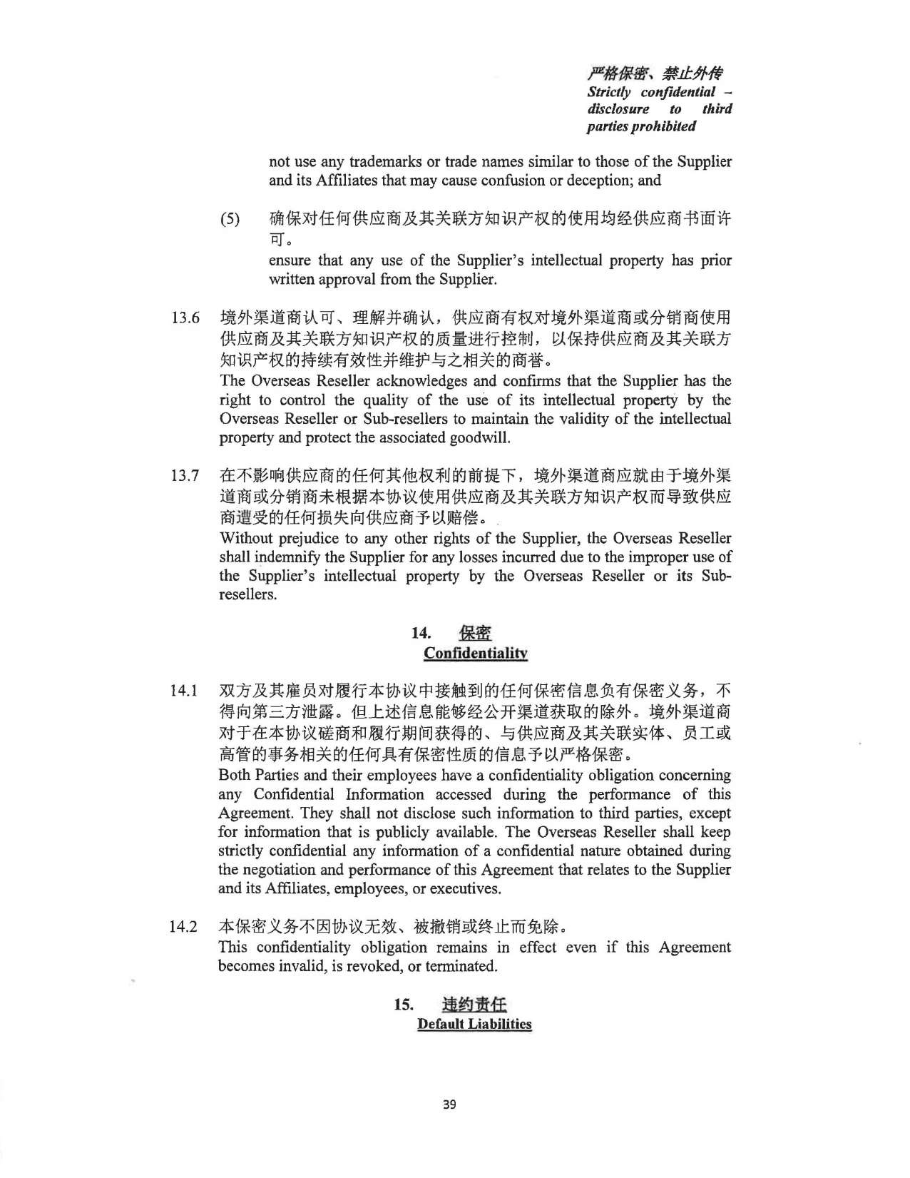 disclosure to third parties prohibited not use any trademarks or trade names similar to those of the Supplier and its Affiliates that may cause confusion or deception; and ‹ ) rñ‹ ¥ «z‹âfi HxnNeNtni . ƒ . PBsRH»s« Hfi&i› ensure that any use of the Supplier's intellectual property has prior written approval from the Supplier. 13.6 The Overseas Reseller acknowledges and confirms that the Supplier has the right to control the quality of the use of its intellectual property by the Overseas Reseller or Sub - resellers to maintain the validity of the intellectual property and protect the associated goodwill . 13.7 Without prejudice to any other rights of the Supplier, the Overseas Reseller shall indemnify the Supplier for any losses incurred due to the improper use of the Supplier's intellectual property by the Overseas Reseller or its Sub - resellers . 14. Confidentiality 39 14.1 Both Parties and their employees have a confidentiality obligation concerning any Confidential Information accessed during the performance of this Agreement . They shall not disclose such information to third parties, except for information that is publicly available . The Overseas Reseller shall keep strictly confidential any information of a confidential nature obtained during the negotiation and performance of this Agreement that relates to the Supplier and its Affiliates, employees, or executives . 14.2 This confidentiality obligation remains in effect even if this Agreement becomes invalid, is revoked, or terminated. Default Liabilities '6Ié¥ fiNZ. /âAfiEln.fi,8fi6¢1‹PiEi?DQ%B4F. @4F@ik8 x?YEâbi4#BfiBt?Aie1A?4@. — 5/é&BBb3t@xJ#. >éiI€