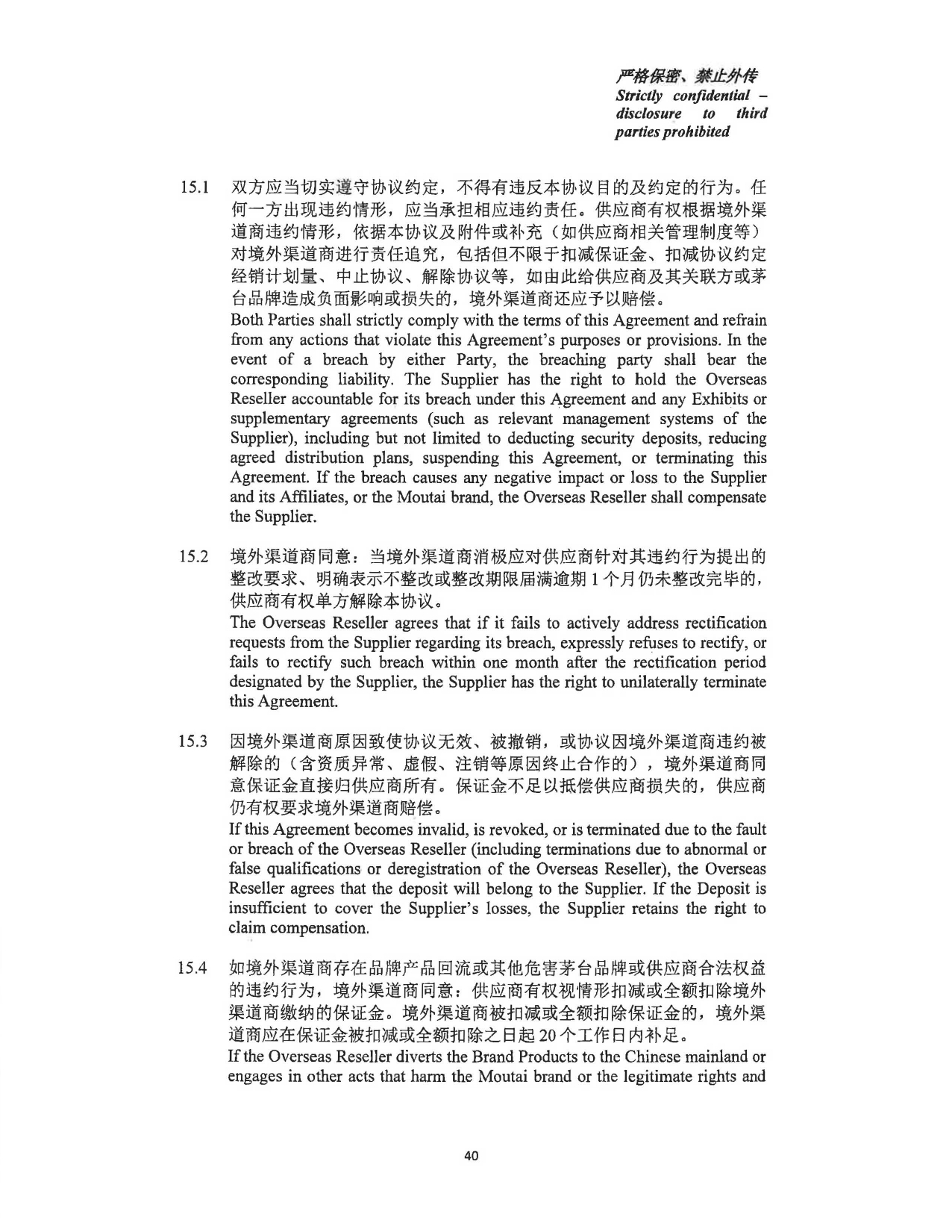 15.1 40 >» 4 =rs*&ri ƒ ém› . «xéi, i £ #›A«aisaavuââls . Both Parties shall strictly comply with the terms of this Agreement and refrain from any actions that violate this Agreement's purposes or provisions . In the event of a breach by either Party, the breaching party shall bear the corresponding liability . The Supplier has the right to hold the Overseas Reseller accountable for its breach under this Agreement and any Exhibits or supplementary agreements (such as relevant management systems of the Supplier), including but not limited to deducting security deposits, reducing agreed distribution plans, suspending this Agreement, or terminating this Agreement . If the breach causes any negative impact or loss to the Supplier and its Affiliates, or the Moutai brand, the Overseas Reseller shall compensate the Supplier . 15.2 The Overseas Reseller agrees that if it fails to actively address rectification requests from the Supplier regarding its breach, eKpressly refuses to rectify, or fails to rectify such breach within one month after the rectification period designated by the Supplier, the Supplier has the right to unilaterally terminate this Agreement . 15.3 Strictly cci@deiifiiif — disclosure to third P arties prohibiteJ H»e ‹ a Users. st . sa&fia - *.I ‹t«i› , int›«&fi (S›1EfiBG N If Iéi fi& . H lit ñU fi &1ât. &1*. X H & N9ixX•¥4JLA£fiii^« ƒ lF. If this Agreement becomes invalid, is revoked, or is terminated due to the fault or breach of the Overseas Reseller (including terminations due to abnormal or false qualirications or deregistration of the Overseas Reseller), the Overseas Reseller agrees that the deposit will belong to the Supplier . If the Deposit is insufficient to cover the Supplier's losses, the Supplier retains the right to claim compensation . 15.4 siABñs8«ei1‹k. B#›iz«BñtnuzAo›neu:z‹k ' «$ii?ioeii4zis›o» - «4ei›nsfzflx20 «z»fi s3›e. If the Overseas Reseller diverts the Brand Products to the Chinese mainland or engages in other acts that harm the Moutai brand or the legitimate rights and