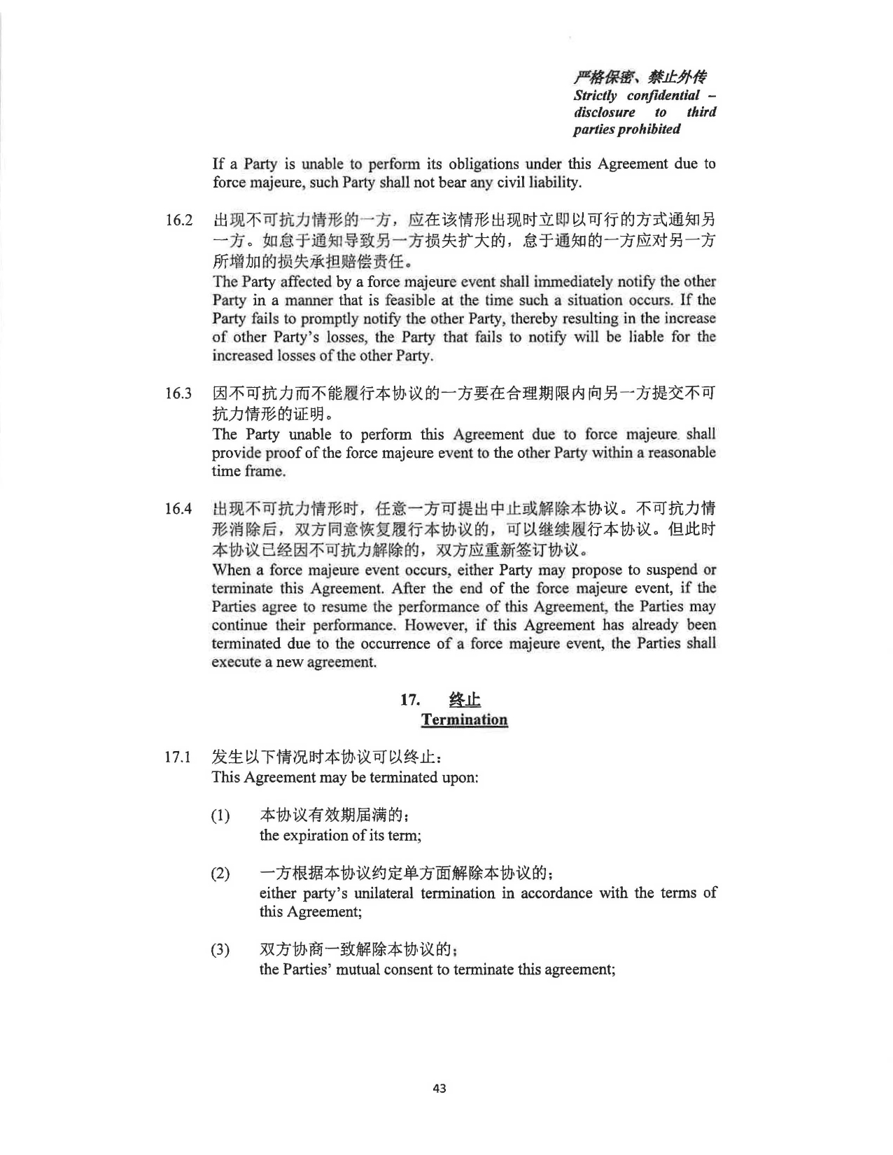 16.2 43 16.3 16.4 t7. \ This Agreement may be terminated upon: Strictly confidential - itisclosure to thud pOP’f@S R r ibited If a Party is unable to perform its obligations under this Agreement due to force majeure, such Party shall not bear any civil liability. - zr . #s,fiTaa 9 axJ — ?rezfA&, . dTuDs ra«fl — ?r The Party affected by a force majeure event shall immediately notify the other Party in a manner that is feasible at the time such a situation occurs . If the Party fails to promptly notify the other Party, thereby resulting in the increase of other Party's losses, the Party that fails to notify will be liable for the increased losses of the other Party . A ' » ® i• The Party unable to perform this Agreement due to force majeure shall provide proof of the force majeure event to the other Party within a reasonable time frame. & N H i f ‘ t x l m â . » B & A U S w f i « R ñ R H H » i é ? s @ , H fi i s ñ f i H x s . a f i i T J i H i t i f ’ i x H • i?&Hi Y • iii When a force majeure event occurs, either Party may propose to suspend or terminate this Agreement . After the end of the force majeure event, if the Parties agree to resume the performance of this Agreement, the Parties may continue their performance . However, if this Agreement bas akeady been terminated due to the occurrence of a force majeure event, the Parties shall execute a new agreement . 17. Termination (2) either party's unilateral termination in accordance with the terms of this Agreement; (3) the Parties’ mutual consent to terminate this agreement;