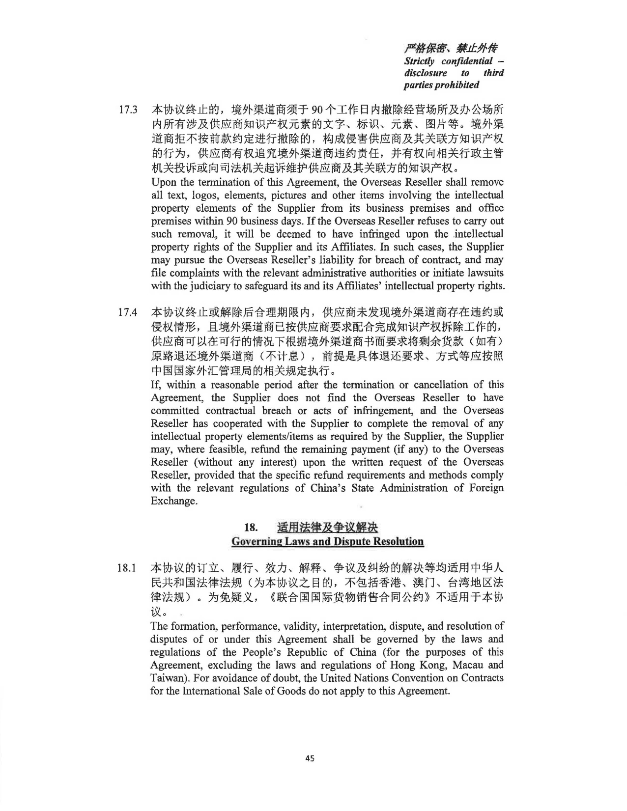 17.3 45 ' 1 « ' B 3 : #›'/KF 4 » «/JI #» £ RJé . If, within a reasonable period after the termination or cancellation of this Agreement, the Supplier does not find the Overseas Reseller to have committed contractual breach or acts of infringement, and the Overseas Reseller has cooperated with the Supplier to complete the removal of any intellectual property elements/items as required by the Supplier, the Supplier may, where feasible, refund the remaining payment (if any) to the Overseas Reseller (without any interest) upon the written request of the Overseas Reseller, provided that the specific refund requirements and methods comply with the relevant regulations of China's State Administration of Foreign Exchange . Governin•q Laws and Dispute Resolutioq 18.1 Strictly co zi fidential - disclosure to third parties prohibited tiNao s acaRos p‹.*. Rx«RUân1. ƒ .PH. Upon the termination of this Agreement, the Overseas Reseller shall remove all text, logos, elements, pictures and other items involving the intellectual property elements of the Supplier from its business premises and office premises within 90 business days . If the Overseas Reseller refuses to carry out such removal, it will be deemed to have infringed upon the intellectual property rights of the Supplier and its Affiliates . In such cases, the Supplier may pursue the Overseas Reseller's liability for breach of contract, and may file complaints with the relevant administrative authorities or initiate lawsuits with the judiciary to safeguard its and its Affiliates' intellectual property rights . 17.4 f AJRéf JA H ( 11. - . ) kññ JX " WJ N The formation, performance, validity, interpretation, dispute, and resolution of disputes of or under this Agreement shall be governed by the laws and regulations of the People's Republic of China (for the purposes of this Agreement, excluding the laws and regulations of Hong Kong, Macau and Taiwan) . For avoidance of doubt, the United Nations Convention on Contracts for the International Sale of Goods do not apply to this Agreement .