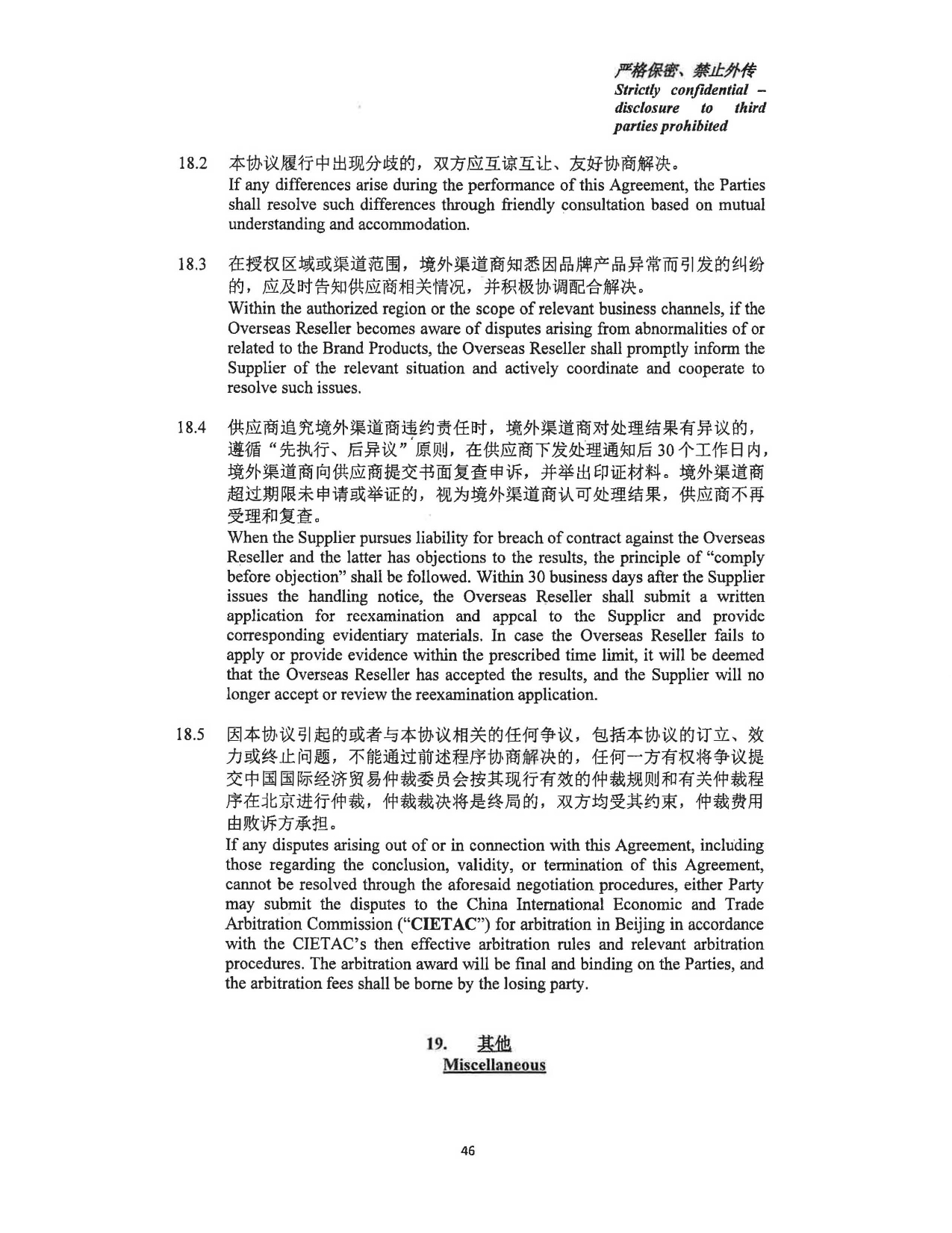 18.2 If any differences arise during the performance of this Agreement, the Parties shall resolve such differences through friendly consultation based on mutual understanding and accommodation . 18.3 i n • n • » • n ι Within the authorized region or the scope of relevant business channels, if the Overseas Reseller becomes aware of disputes arising from abnormalities of or related to the Brand Products, the Overseas Reseller shall promptly inform the Supplier of the relevant situation and actively coordinate and cooperate to resolve such issues . 46 18.4 18.5 Strictly co ii fide ri tial - disclosure to third parties prohibifed aifl “Ksii7. sPt’Y” %›*.J, ec ι . »iTxJt idss 3s«z‹sBH, 1nt»«Hsf^. &Rm9&xasw. e o›r›zp 1nt›«a& When the Supplier pursues liability for breach of contract against the Overseas Reseller and the latter has objections to the results, the principle of “comply before objection” shall be followed . Within 30 business days after the Supplier issues the handling notice, the Overseas Reseller shall submit a written application for reexamination and appeal to the Supplier and provide corresponding evidentiary materials . In case the Overseas Reseller fails to apply or provide evidence within the prescribed time limit, it will be deemed that the Overseas Reseller has accepted the results, and the Supplier will no longer accept or review the reexaniination application . .*.I: ι 3U, la.id »aeU+tt&1e'‹Xei, 1z1s — s&›xlsxi’xfi Et' 9 Q I $ i iSIâ 4 HS 188 i&fix& ¥ f . ^‹éttB& 188 itz^I*JHit?tl 8 AiR N £ \ t fiiélte . ‹ 1 Bai’‹ 2 - i 8 A' ι . s B . firJfi 5 tas 5 x . l 8 tfi $ H If any disputes arising out of or in connection with this Agreement, including those regarding the conclusion, validity, or termination of this Agreement, cannot be resolved through the aforesaid negotiation procedures, either Party may submit the disputes to the China International Economic and Trade Arbitration Commission (“CIETAC”) for arbitration in Beijing in accordance with the CIETAC's then effective arbitration rules and relevant arbitration procedures . The arbitration award will be final and binding on the Parties, and the arbitration fees shall be borne by the losing party . Miscellaneous