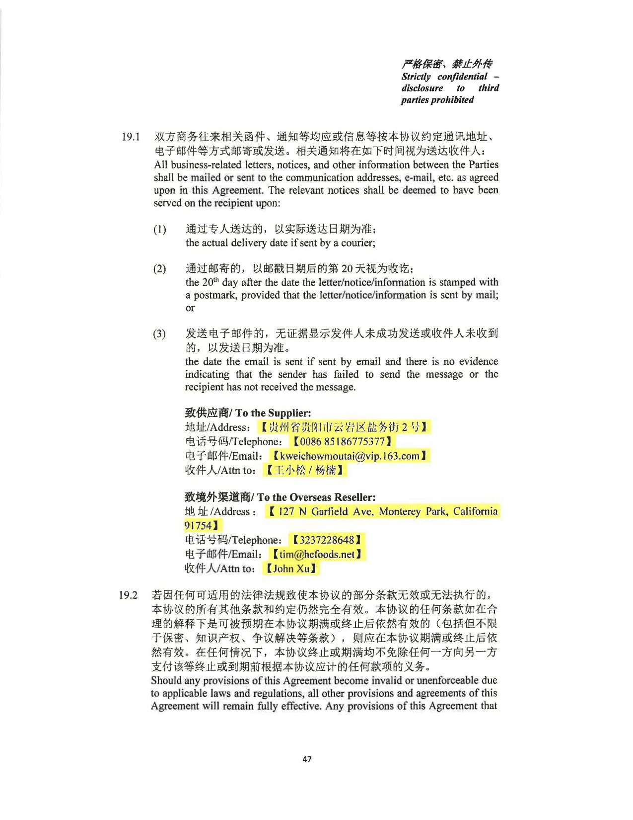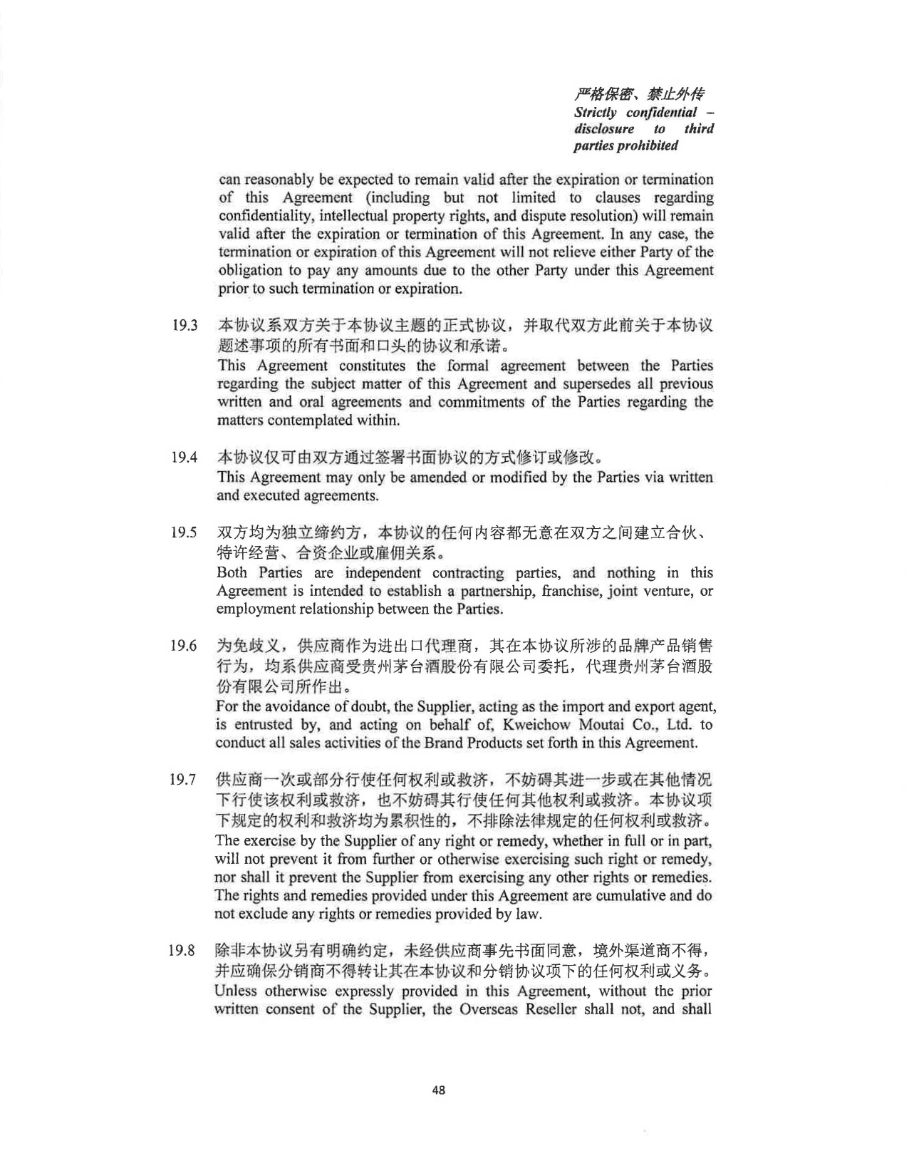 Strictly confidential — disclosure to third parties prohibited can reasonably be expected to remain valid utter the expiration or termination of this Agreement (including but not limited to clauses regarding confidentiality, intelleetual property rights, and dispute resolution) will remain valid after the expiration or termination of this Agreement . In any case, the termination or expiration of this Agreement will riot relieve either Party of the obligation to pay any amounts due to the other Party under this Agreement prior to such termination or expiration . 19.3 This Agreement constitutes the formal agreement between the Parties regarding the subject matter of this Agreement and supersedes all previous written and oral agreements and commitments of the Parties regarding the matters contemplated within . 48 19.4 19.8 %@:4”tZ@aDZa BcVx¥›:y@J ‹éfT@/*N. This Agreement may only be amended or modified by the Parties via written and executed agreements . 19.5 Both Parties are independent contracting parties, and nothing in this Agreement is intended to establish a partnership, franchise, joint venture, or employment relationship between the Parties . 19.6 For the avoidance of doubt, the Supplier, acling as the import and export agent, is entrusted by, and acting on behalf of, Kweichow Moutai Co . , Lt‹L to conduct all sales activities of the Brand Products set forth in this Agreement . 19.7 I*. “R — ttm r:1e‹zfitt1:san, wfi6sa — »mxnR‹tR z • ’› ' • ^ .. ’ ƒ s’ • The exercise by the Supplier of any right or remedy, whether in full or in part, will not prevent it from further or otherwise exercising such right or remedy, nor shall it prevent the Supplier from exercising any other rights or remedies . The rights and remedies provided under this Agreement are cumulative and do not exclude any rights or remedies provided by law . P neI›RsviseitAH&«i“itIsr«»ix‘ >^Ts‹z«›x›:» s. Unless otherwisc expressly provided in this Agreement, without the prior written consent of the Supplier, the Overseas Reseller shall not, and shall