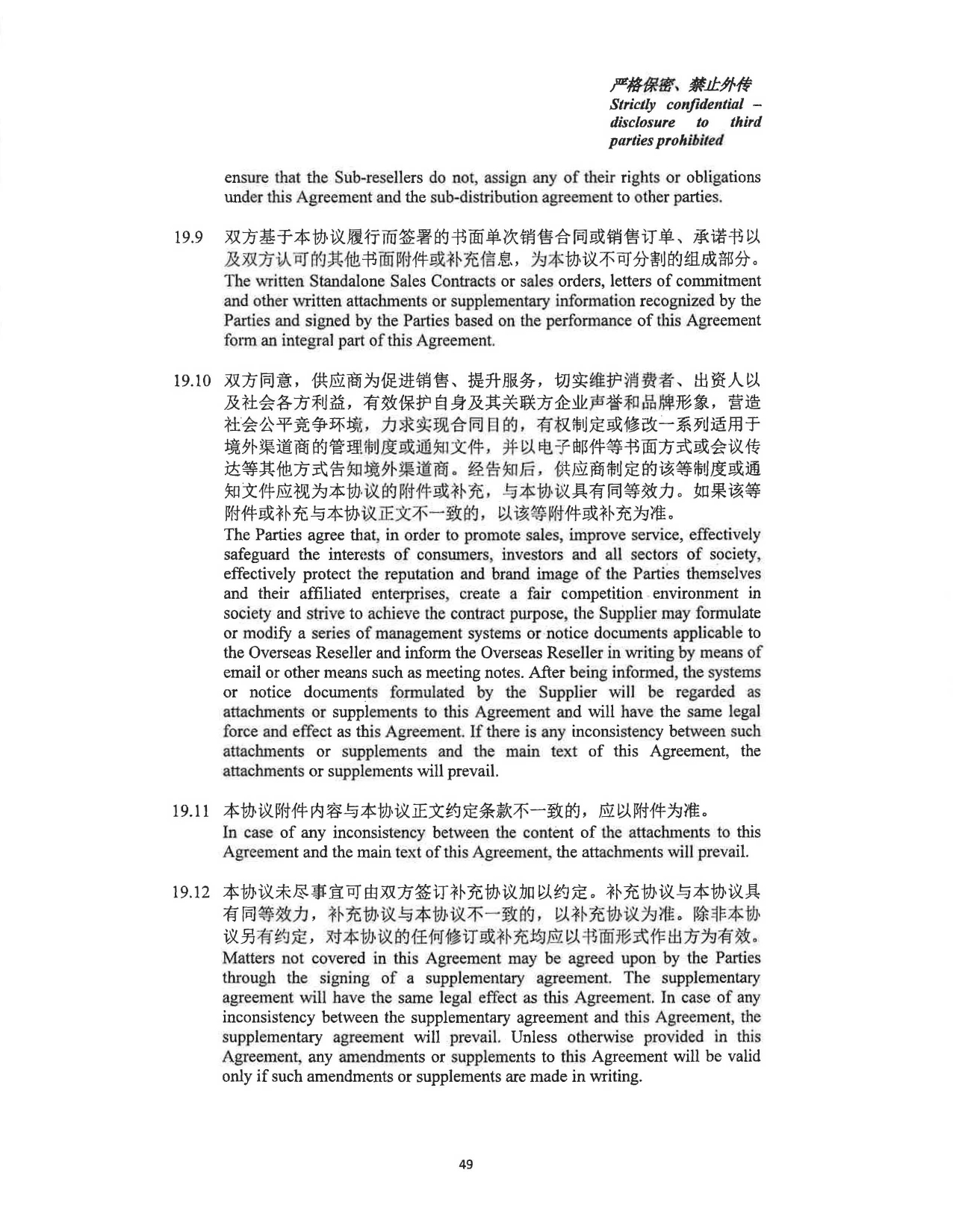 Strictly con j? dential - disclos u re to third parties prohibited ensure that the Siib - reséllers do not, assign any of their rights or obligations under this Agreement and the sub - diitribution agreement to other parties. 19.9 ι ι â ^* - o • The written Standalone Sales Contracts or sales orders, letters of commitment and other written attachments or supplementary information recognized by the Parties and sigped by the Parties based on the performance of this Agreement form an integral part of this Agreement . 19.10 49 st‹ 1 m 1 fx — o 4 nfizAU — R&, fiin«›t‹ 1 t›xfi . The Parties agree that, in order to promote sales, improve service, effectively safeguard the interim of consumers, investors and all sectors of society, effectively protect the reputation and brand image of the Parties themselves and their affiliated enterprises, create a fair c . ompetition environment in society and strive to achieve the contract purpose, the Supplier may formulate or modify a series of management systems or notice documents applicable to the Overseas Reseller and inform the Overseas Reseller in writing by means of email or other means such as meeting notes . AAer being informed, the systems or notice documents formulated by the Supplier will be regarded as attachments or supplements to this Agreement and will have the same legal force and effect as this Agreement . If therr is any inconsistency between such attachments or supplements and the main text of this Agreement, the anachments or supplements will prevail . 19.11 In casé of any inconsistency between the contént of the attachments to this Agreement and the main text of this Agreement, the attachments will prevail. 19.12 ›N “ H . U iK fR TT • •• • - Matters not covered in this Agreement may be agreed upon by the Parties through the signing of a supplementary agreement . The supplementary agreement will have the same legal effect as this Agreement . In case of any inconsistency between the supplementary agreement and this Agreement, the supplementary agreement will . prevail . Unless odierwise provided in this Agreement, any amendments or supplements to this Agreement will be valid only if such amendments or supplements are made in writing .