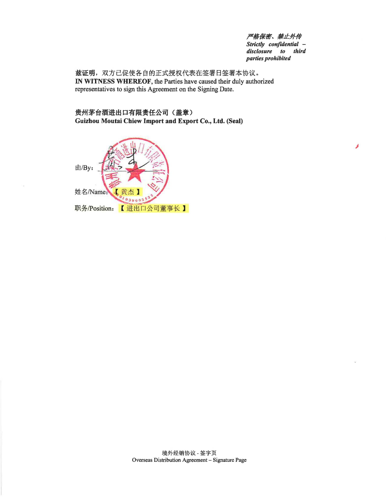 Strictly conflulential - disclosure to third parties prohibited B«$, uxzHek$&zzRaItzksñasñ&si*'x. IN WITNESS WHEREOF, the Parties have caused their duly authorized representatives to sign this Agreement on the Signing Date. Overseas Distribution Agreement — Signature Page Guizhou Moutai Chiew Import and Export Co., Ltd. (Seal) £b/By: $ ι &/Position: 4tfiHd'l'i’x - B4 v>.