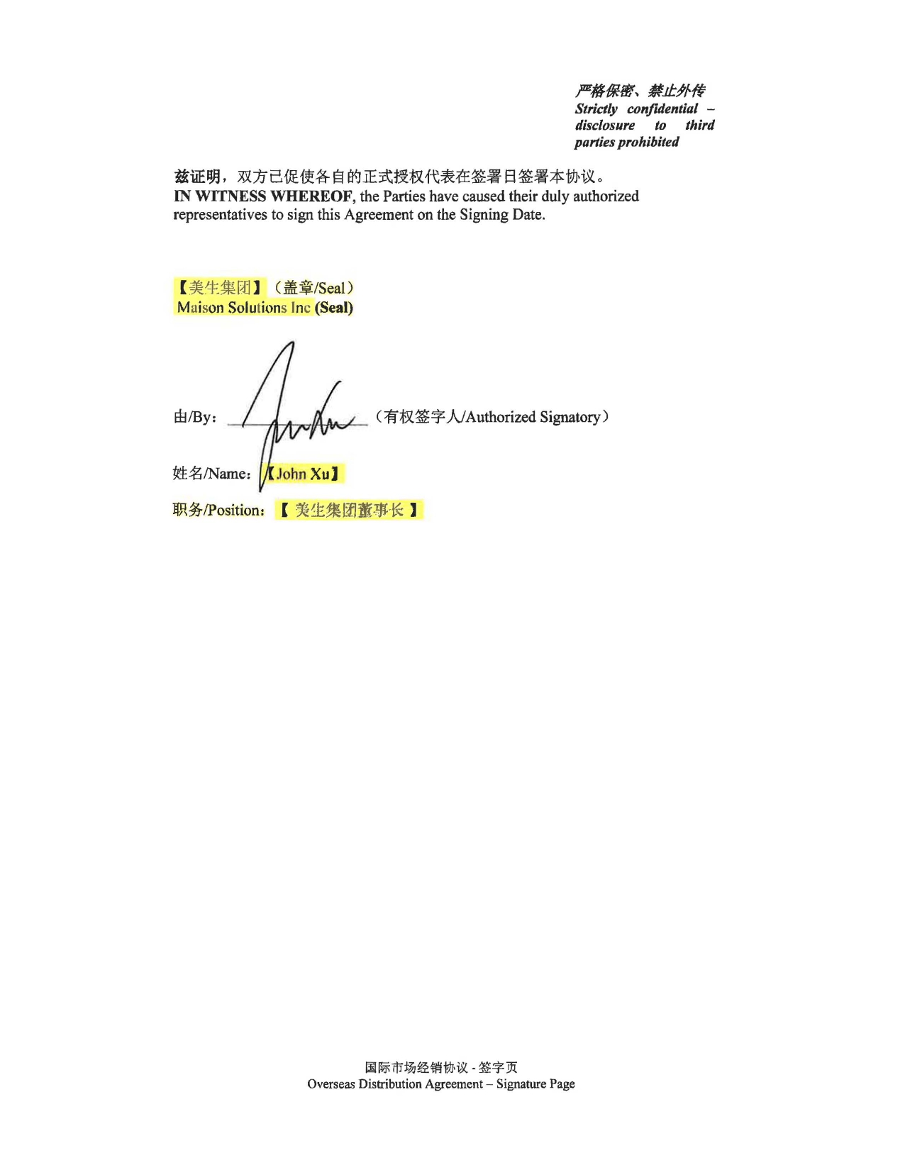Strictly conflulential - disclosure to third parties prohibited IN WITNESS WHEREOF, the Parties have caused their duly authorized representatives to sign this Agreement on the Signing Date. Overseas Distribution Agreement — Signature Page Muison Soluiit›ns Inc (Seal) (&tRB YKAuthorized Signatory) @6/Name: é.JtPosition: I y¿¿k?¿EOqy‹ J & UN 6UR Hvk - YU