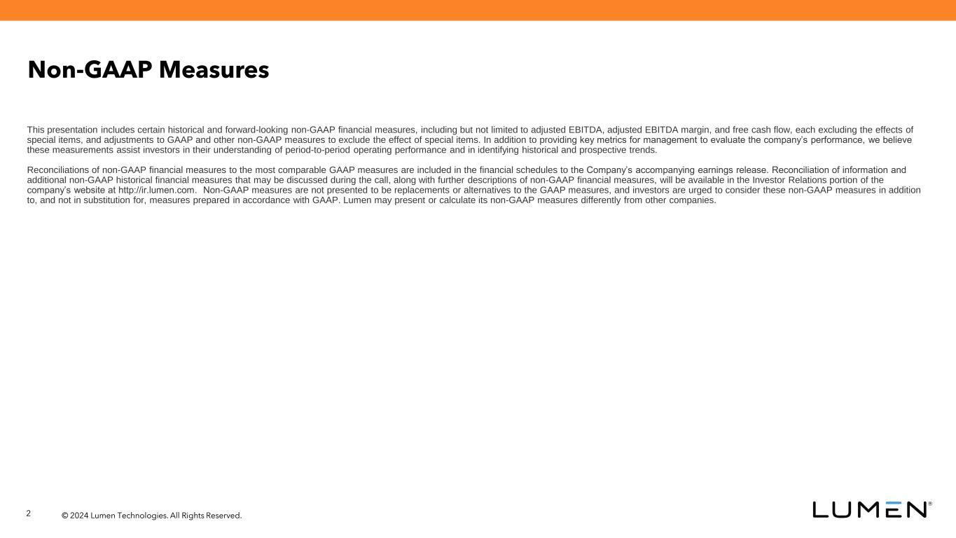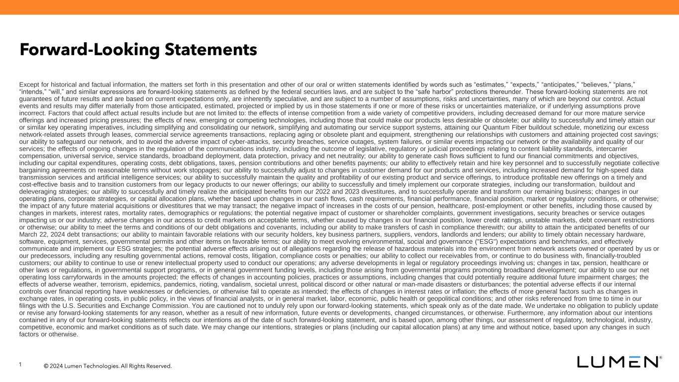 © 2024 Lumen Technologies. All Rights Reserved. 1 Forward-Looking Statements Except for historical and factual information, the matters set forth in this presentation and other of our oral or written statements identified by words such as “estimates,” “expects,” “anticipates,” “believes,” “plans,” “intends,” “will,” and similar expressions are forward-looking statements as defined by the federal securities laws, and are subject to the “safe harbor” protections thereunder. These forward-looking statements are not guarantees of future results and are based on current expectations only, are inherently speculative, and are subject to a number of assumptions, risks and uncertainties, many of which are beyond our control. Actual events and results may differ materially from those anticipated, estimated, projected or implied by us in those statements if one or more of these risks or uncertainties materialize, or if underlying assumptions prove incorrect. Factors that could affect actual results include but are not limited to: the effects of intense competition from a wide variety of competitive providers, including decreased demand for our more mature service offerings and increased pricing pressures; the effects of new, emerging or competing technologies, including those that could make our products less desirable or obsolete; our ability to successfully and timely attain our or similar key operating imperatives, including simplifying and consolidating our network, simplifying and automating our service support systems, attaining our Quantum Fiber buildout schedule, monetizing our excess network-related assets through leases, commercial service agreements transactions, replacing aging or obsolete plant and equipment, strengthening our relationships with customers and attaining projected cost savings; our ability to safeguard our network, and to avoid the adverse impact of cyber-attacks, security breaches, service outages, system failures, or similar events impacting our network or the availability and quality of our services; the effects of ongoing changes in the regulation of the communications industry, including the outcome of legislative, regulatory or judicial proceedings relating to content liability standards, intercarrier compensation, universal service, service standards, broadband deployment, data protection, privacy and net neutrality; our ability to generate cash flows sufficient to fund our financial commitments and objectives, including our capital expenditures, operating costs, debt obligations, taxes, pension contributions and other benefits payments; our ability to effectively retain and hire key personnel and to successfully negotiate collective bargaining agreements on reasonable terms without work stoppages; our ability to successfully adjust to changes in customer demand for our products and services, including increased demand for high-speed data transmission services and artificial intelligence services; our ability to successfully maintain the quality and profitability of our existing product and service offerings, to introduce profitable new offerings on a timely and cost-effective basis and to transition customers from our legacy products to our newer offerings; our ability to successfully and timely implement our corporate strategies, including our transformation, buildout and deleveraging strategies; our ability to successfully and timely realize the anticipated benefits from our 2022 and 2023 divestitures, and to successfully operate and transform our remaining business; changes in our operating plans, corporate strategies, or capital allocation plans, whether based upon changes in our cash flows, cash requirements, financial performance, financial position, market or regulatory conditions, or otherwise; the impact of any future material acquisitions or divestitures that we may transact; the negative impact of increases in the costs of our pension, healthcare, post-employment or other benefits, including those caused by changes in markets, interest rates, mortality rates, demographics or regulations; the potential negative impact of customer or shareholder complaints, government investigations, security breaches or service outages impacting us or our industry; adverse changes in our access to credit markets on acceptable terms, whether caused by changes in our financial position, lower credit ratings, unstable markets, debt covenant restrictions or otherwise; our ability to meet the terms and conditions of our debt obligations and covenants, including our ability to make transfers of cash in compliance therewith; our ability to attain the anticipated benefits of our March 22, 2024 debt transactions; our ability to maintain favorable relations with our security holders, key business partners, suppliers, vendors, landlords and lenders; our ability to timely obtain necessary hardware, software, equipment, services, governmental permits and other items on favorable terms; our ability to meet evolving environmental, social and governance ("ESG") expectations and benchmarks, and effectively communicate and implement our ESG strategies; the potential adverse effects arising out of allegations regarding the release of hazardous materials into the environment from network assets owned or operated by us or our predecessors, including any resulting governmental actions, removal costs, litigation, compliance costs or penalties; our ability to collect our receivables from, or continue to do business with, financially-troubled customers; our ability to continue to use or renew intellectual property used to conduct our operations; any adverse developments in legal or regulatory proceedings involving us; changes in tax, pension, healthcare or other laws or regulations, in governmental support programs, or in general government funding levels, including those arising from governmental programs promoting broadband development; our ability to use our 