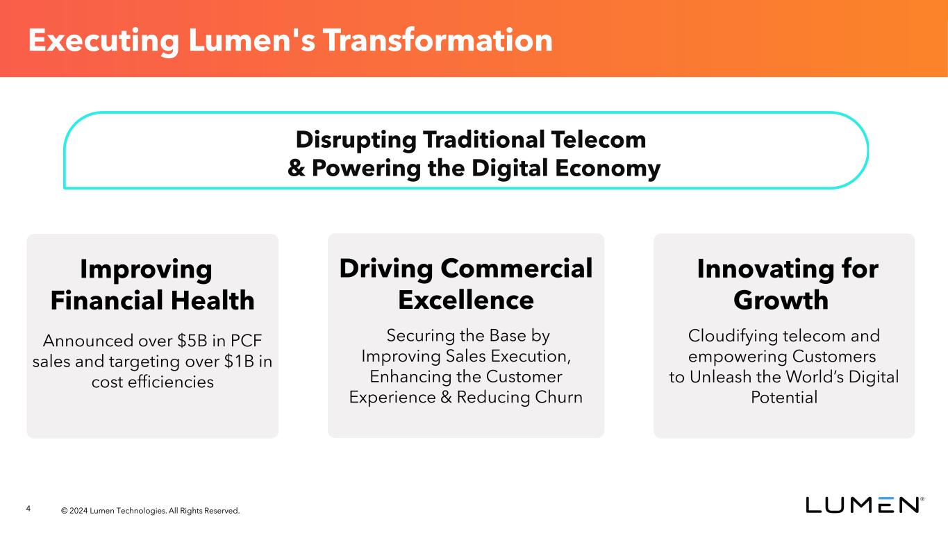 © 2024 Lumen Technologies. All Rights Reserved. 2 Non-GAAP Measures This presentation includes certain historical and forward-looking non-GAAP financial measures, including but not limited to adjusted EBITDA, adjusted EBITDA margin, and free cash flow, each excluding the effects of special items, and adjustments to GAAP and other non-GAAP measures to exclude the effect of special items. In addition to providing key metrics for management to evaluate the company’s performance, we believe these measurements assist investors in their understanding of period-to-period operating performance and in identifying historical and prospective trends. Reconciliations of non-GAAP financial measures to the most comparable GAAP measures are included in the financial schedules to the Company’s accompanying earnings release. Reconciliation of information and additional non-GAAP historical financial measures that may be discussed during the call, along with further descriptions of non-GAAP financial measures, will be available in the Investor Relations portion of the company’s website at http://ir.lumen.com. Non-GAAP measures are not presented to be replacements or alternatives to the GAAP measures, and investors are urged to consider these non-GAAP measures in addition to, and not in substitution for, measures prepared in accordance with GAAP. Lumen may present or calculate its non-GAAP measures differently from other companies.